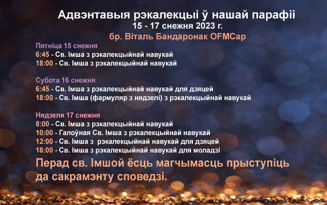 4. Адвантавыя рэкалекцыі ў нашай парафіі пройдуць ад 15 да 17 снежня. Праводзіць іх будзе наш бр. Віталь Бандаронак, капуцын, пробашч парафіі ў Докшыцах. Расклад рэкалекцый можна будзе знайсці на дошцы аб’яваў, на нашым сайце і ў вайберы. Заахвочваем да плённага ўдзелу ў рэкалекцыях.