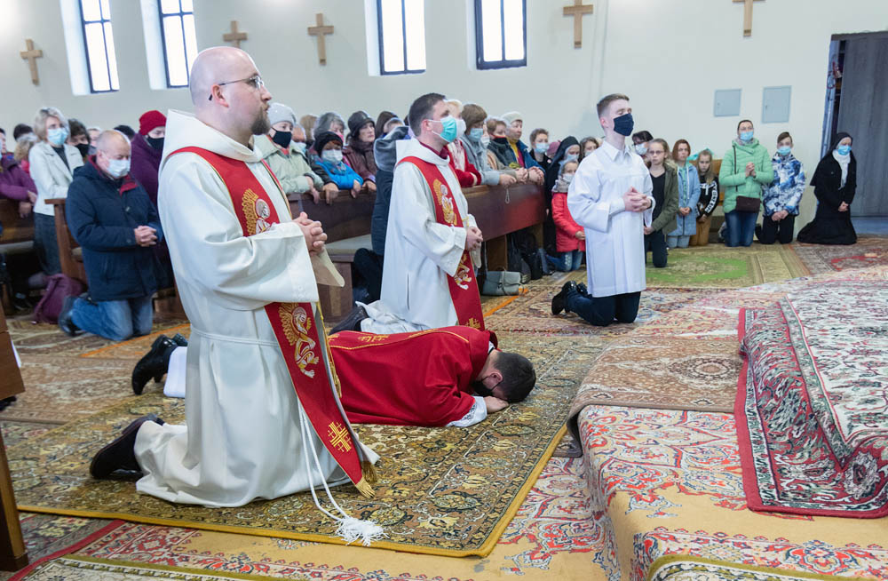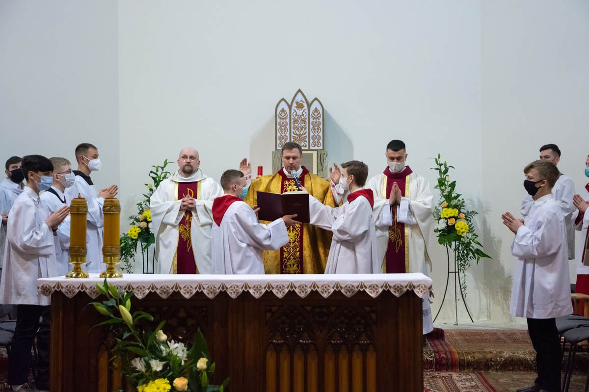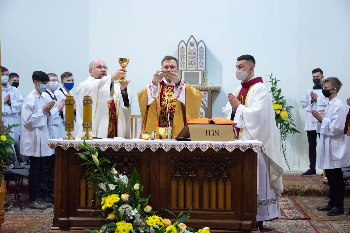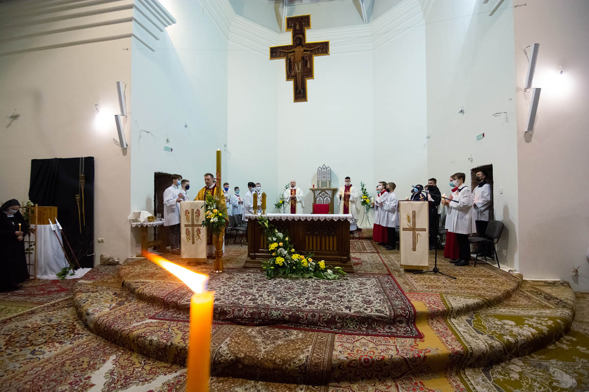 Пасхальны Трыдуум распачаўся з вечаровай Імшы Вячэры Пана у Вялікі Чацвер, калі асаблівым чынам з падзякай успаміналі ўстанаўленне сакрамэнтаў Эўхарыстыi i святарства. Цэлебрацыя распачалася прыгожым святочны перазвонам, але адразу з гэтага моманту музычныя iнструменты i званы змоўклi, каб загучаць толькi ў Святую пасхальную ноч. Гэта знак пачатку перажывання касцёлам мукi Збаўцы. Як знак таго, што да Вялiкай ночы не будзе цэлебравацца святой Iмшы, з алтара быў зняты абрус.