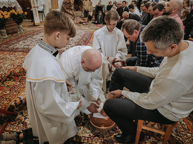 Пасля гаміліі быў здзейснены абрад абмыцця ног дванаццаці мужчынам з нашай парафіі: праз паслугу а. Ігара Езус абмыў і уцалаваў ногі Сваім вучням.