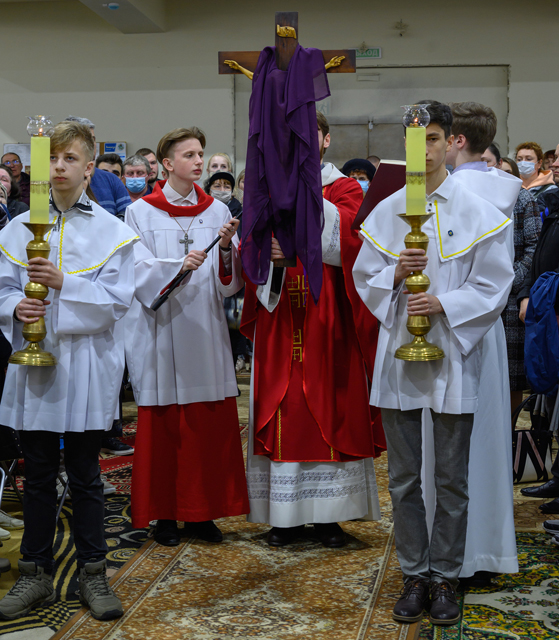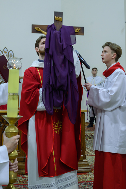 Пасля гаміліі адбылося ўрачыстае адкрыццё Крыжа, які быў пакрыты фіялетавай тканінай ад V Нядзелі Вялікага посту.