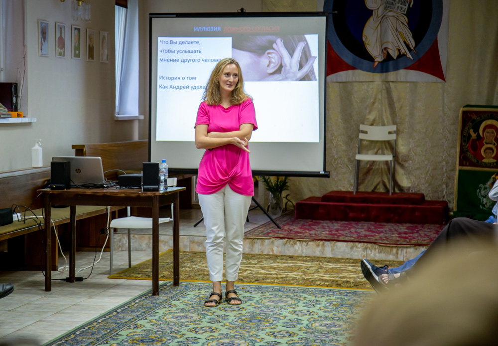 Сабраліся слухачы як з мінулай сустрэчы, так і новыя. Уладзімір Глушакоў з першых хвілін завалодаў увагай прысутнічаючых і трымаў яе да канца трэнінга. У атмасферы даверу і ўзаемнага імкнення знайсці адказы на шматлікія пытанні, якія ставіў да аўдыторыі лектар. Парафіяне працавалі над тэмай крызісных сітуацый і выхаду з іх, стрэсаўстойлівасці і крэатыўнасці мыслення.