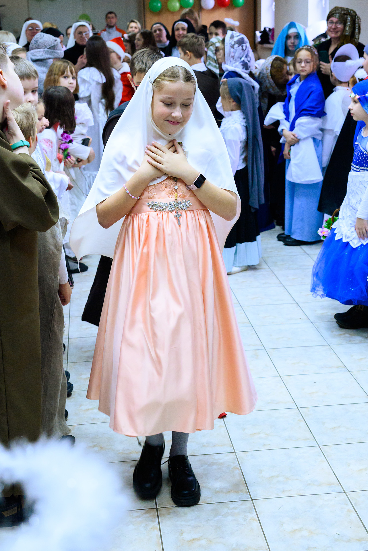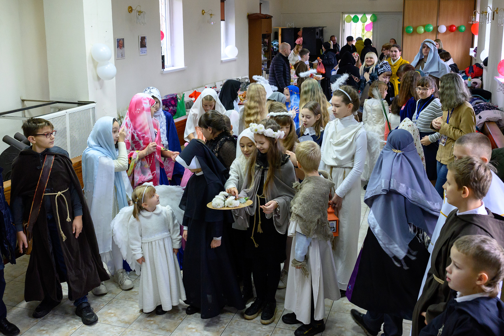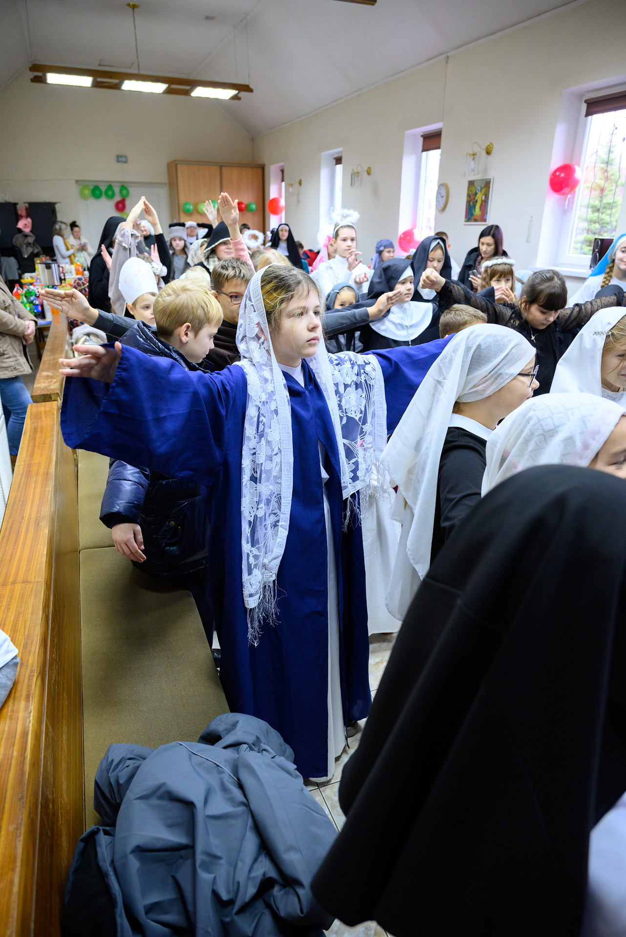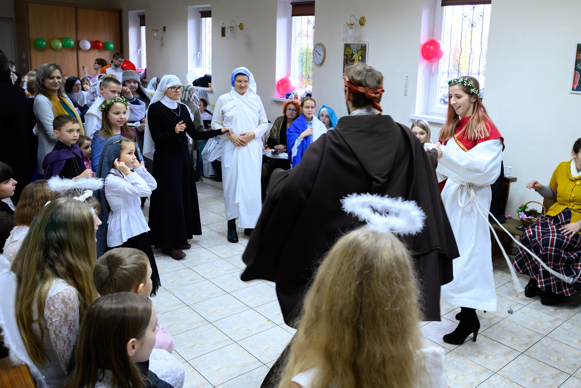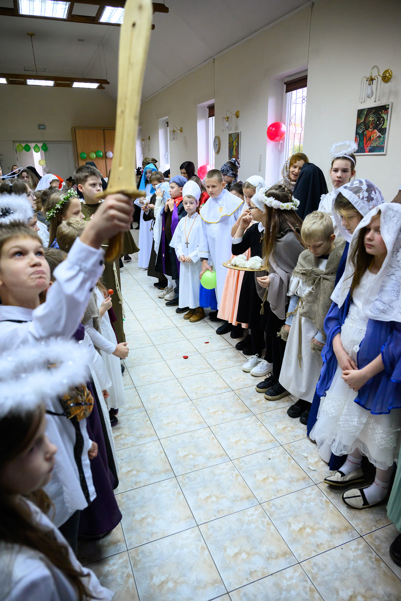 Менавіта з гэтай песні і пачаўся Баль. Як дзеці, так і дарослыя мелі магчымасць прыйсці на свята ў касцюмах Святых, блізкіх ім па духу, якія служаць добрым прыкладам у жыцці. І ведаеце, якіх толькі Святых не прыйшло на свята?! Месца ўсім не хапала! Гэта былі як добра ўсім вядомыя Святыя: Агата, Піо, Тэрэза, Марыя, Юзаф, Юда Тадэвуш, Францішак, Стэфан, Баляслава Лямант, Ян Павел ІІ... Так і Святыя, пра якіх, нават не кожны дарослы хрысціянін чуў: Антоній Ляшчэвіч (росіцкі святы), Фідэль, Жозэфіна Бакіта, Джана Берэта Мола, Марыя Гарэцці, Дамінік Савіо, Схаластыка і Бенядзікт, Феламена... А таксама шматлікія пастушкі і анёлы.