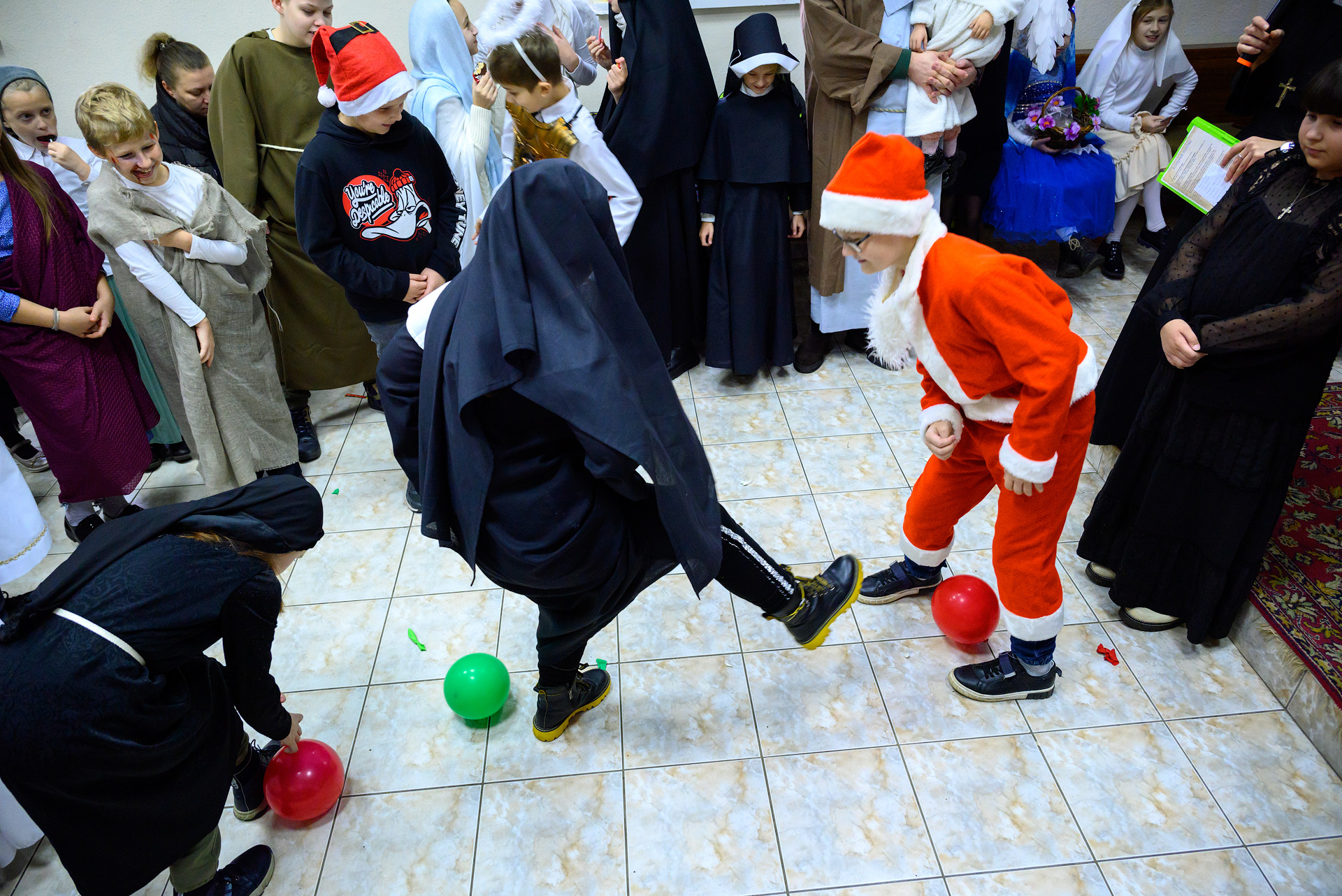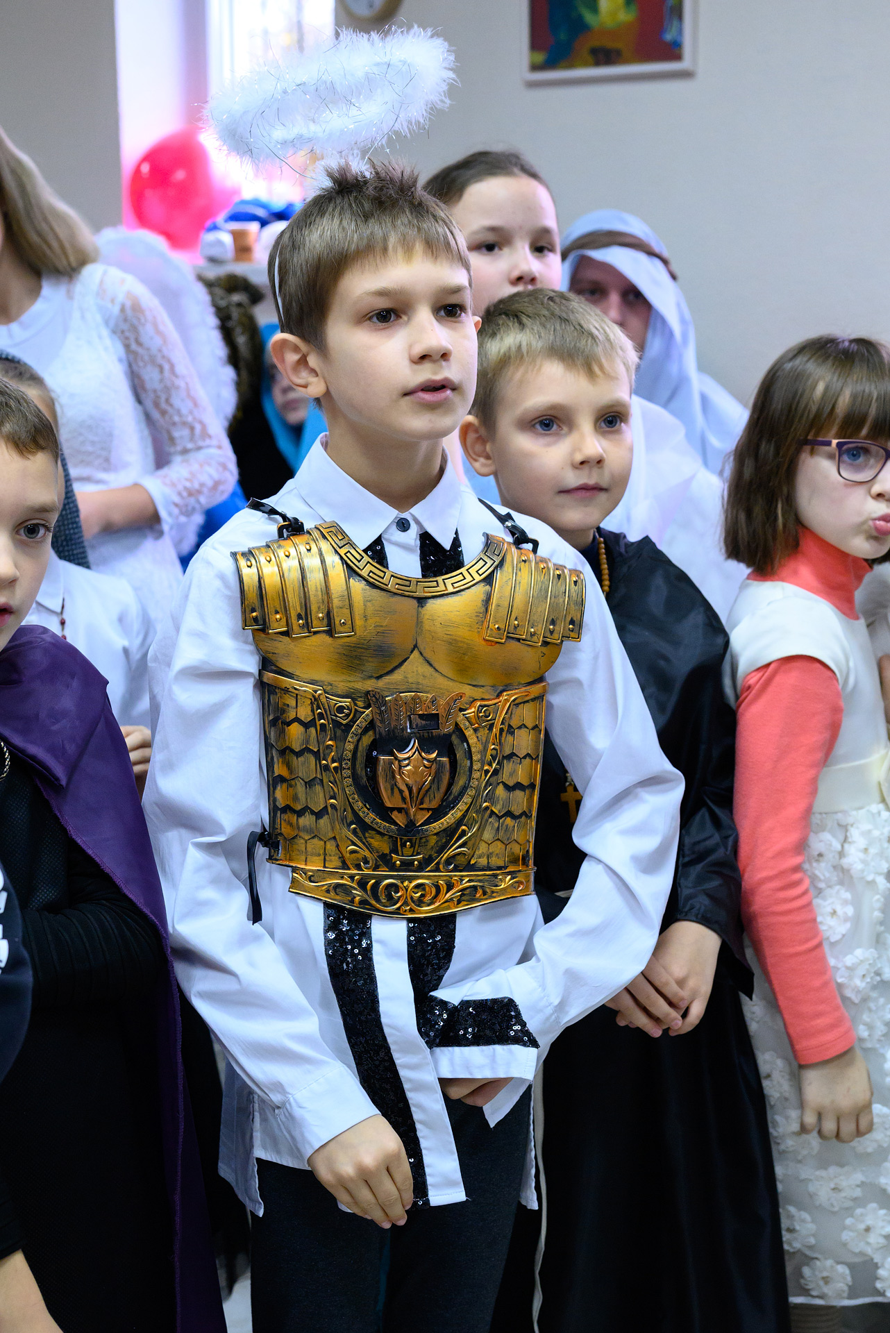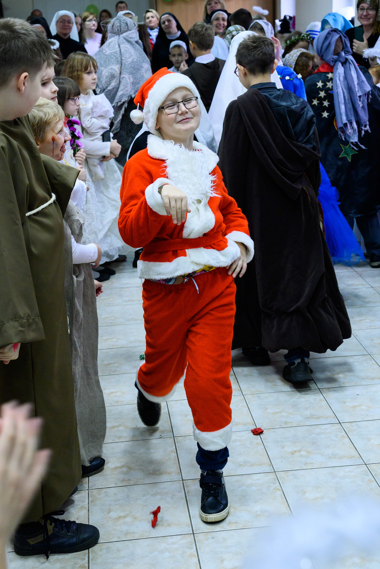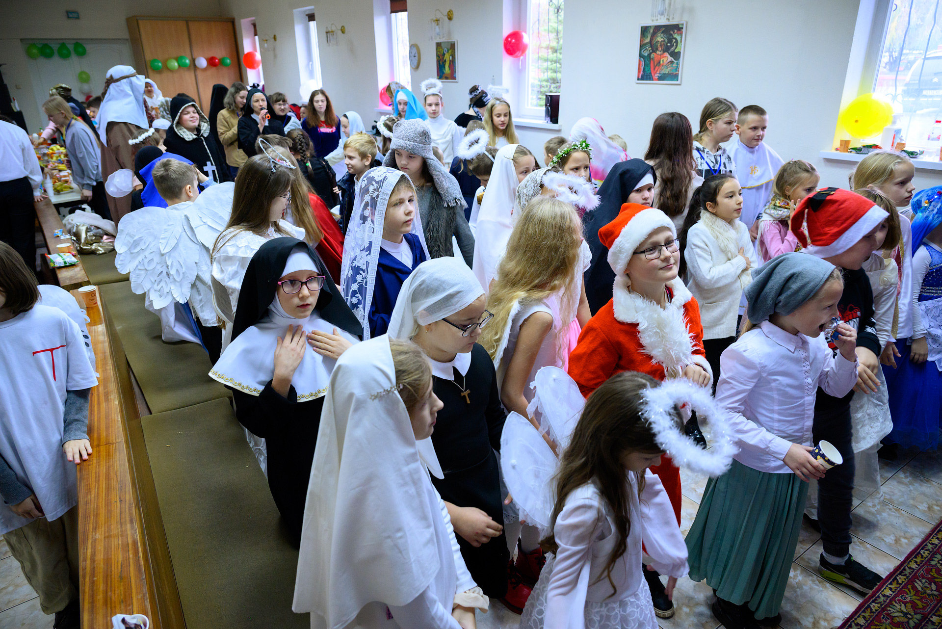Менавіта з гэтай песні і пачаўся Баль. Як дзеці, так і дарослыя мелі магчымасць прыйсці на свята ў касцюмах Святых, блізкіх ім па духу, якія служаць добрым прыкладам у жыцці. І ведаеце, якіх толькі Святых не прыйшло на свята?! Месца ўсім не хапала! Гэта былі як добра ўсім вядомыя Святыя: Агата, Піо, Тэрэза, Марыя, Юзаф, Юда Тадэвуш, Францішак, Стэфан, Баляслава Лямант, Ян Павел ІІ... Так і Святыя, пра якіх, нават не кожны дарослы хрысціянін чуў: Антоній Ляшчэвіч (росіцкі святы), Фідэль, Жозэфіна Бакіта, Джана Берэта Мола, Марыя Гарэцці, Дамінік Савіо, Схаластыка і Бенядзікт, Феламена... А таксама шматлікія пастушкі і анёлы.