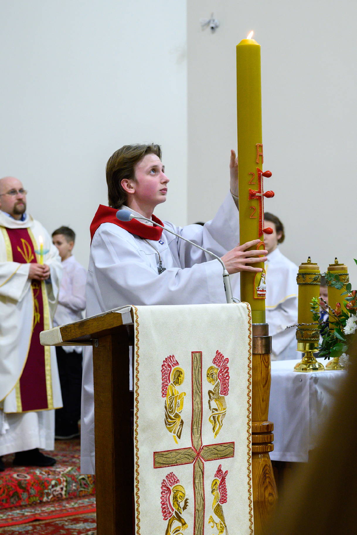 І вось са спевам “Радасны наш Светач, сапраўдная адзіная Мудрасць, Езу Хрысце, Пане наш” запалены асвечаным агнём новы Пасхал, сімвалізуючы Уваскрослага Езуса, уносіцца ў святыню - і рассвятляе цемру. “Дзівосны бляск Цара рассеяў цемру і змрок гэтага свету!” Езус уваскрос! Сапраўды уваскрос! Гэта тая ноч, у якую Езус уваскрасеннем перамагае смерць, знішчае старадаўнюю віну Адама, злучае зямное з нябесным.
