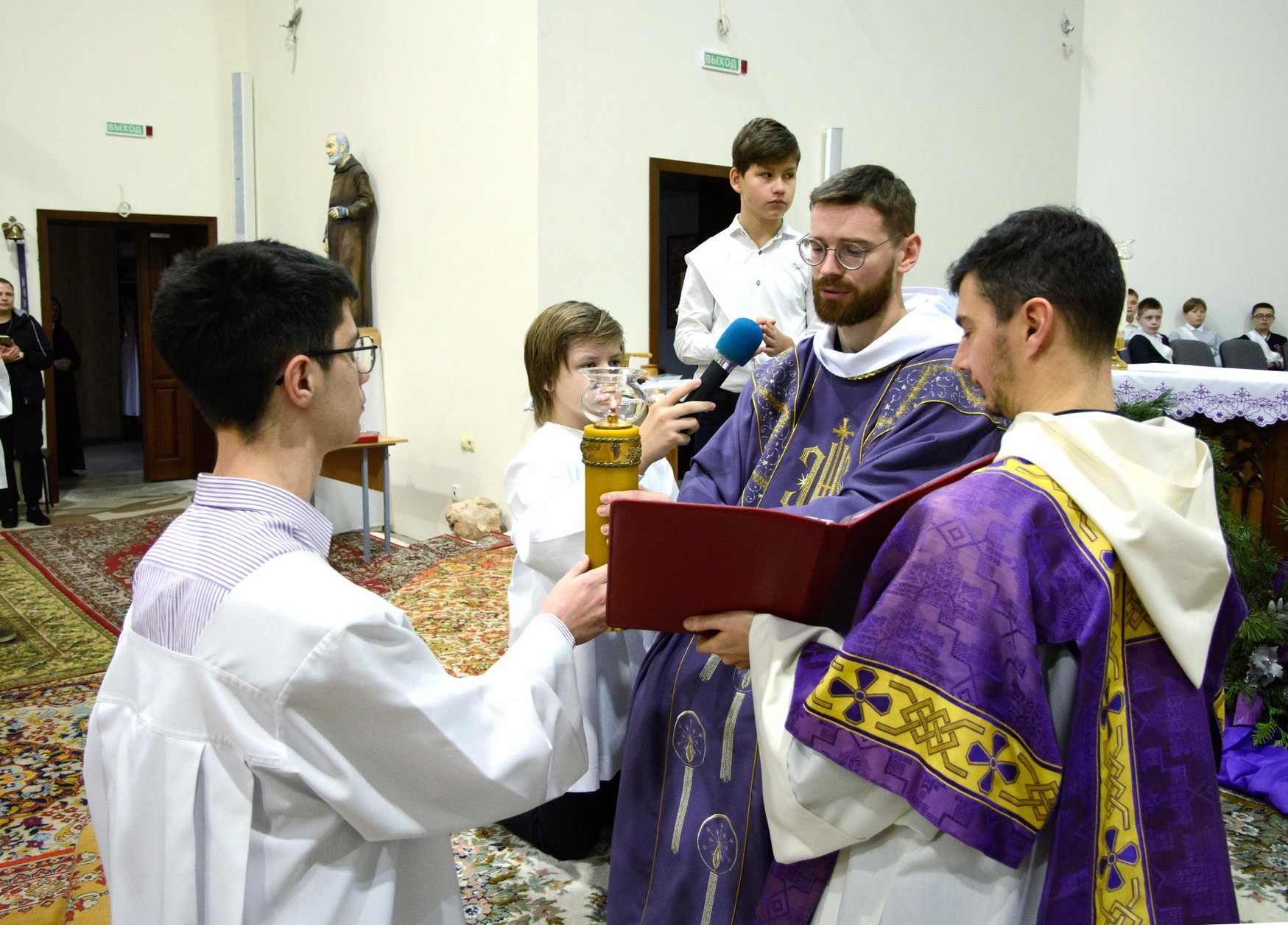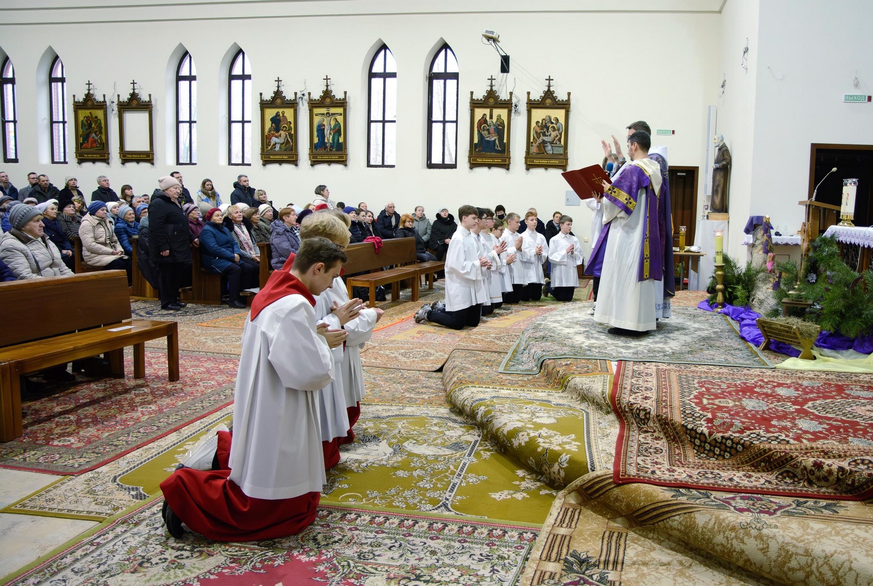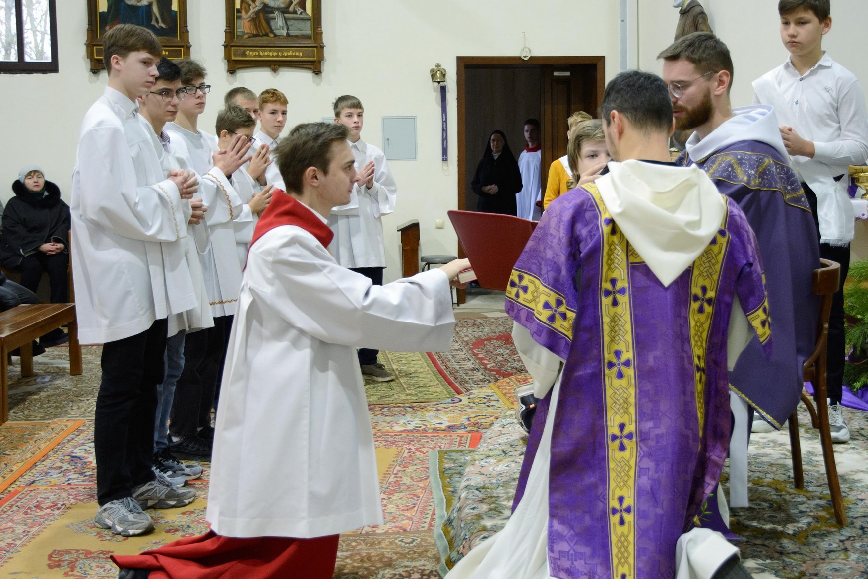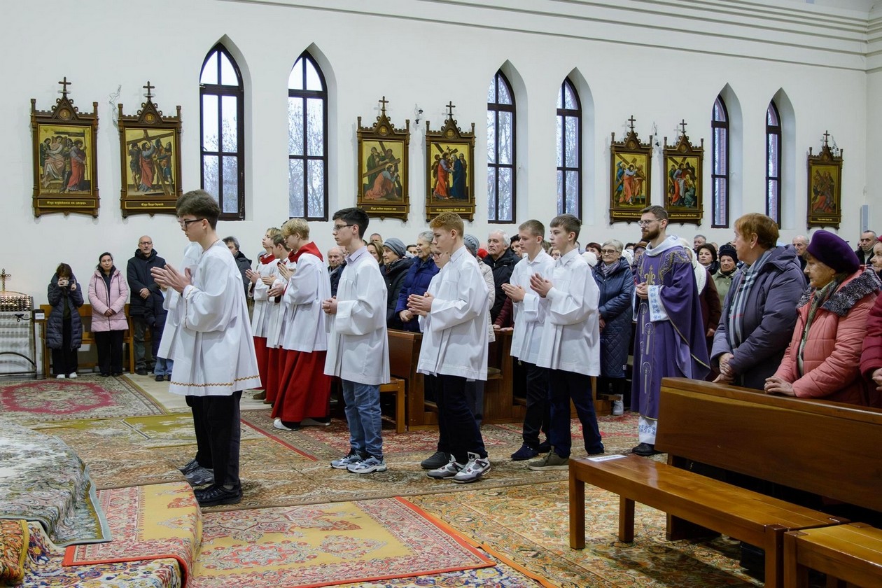 Адразу адзінаццаць хлопцаў, пасля адпаведнай падрыхтоўкі, атрыманай пад кіраўніцтвам братоў капуцынаў, перайшлі на новыя ступені міністранцкага служэння: чацвёра (Цімафей Савянок, Мацвей Вяжэвіч, Якаў Дасюкевіч, Дамінік-Антоній Гаранін) сталі Міністрантамі Кнігі; сямёра (Арцём Гурштыновіч, Андрэй Стрэж, Кірыл Касяк, Канстанцін Губко, Уладзіслаў Астравушка, Яўген Апанэль, Ігар Лапата) - Міністрантамі Святла (падрабязней пра функцыі кожнай ступені міністранцкай паслугі можна прачытаць у артыкуле з мінулага тыдня).