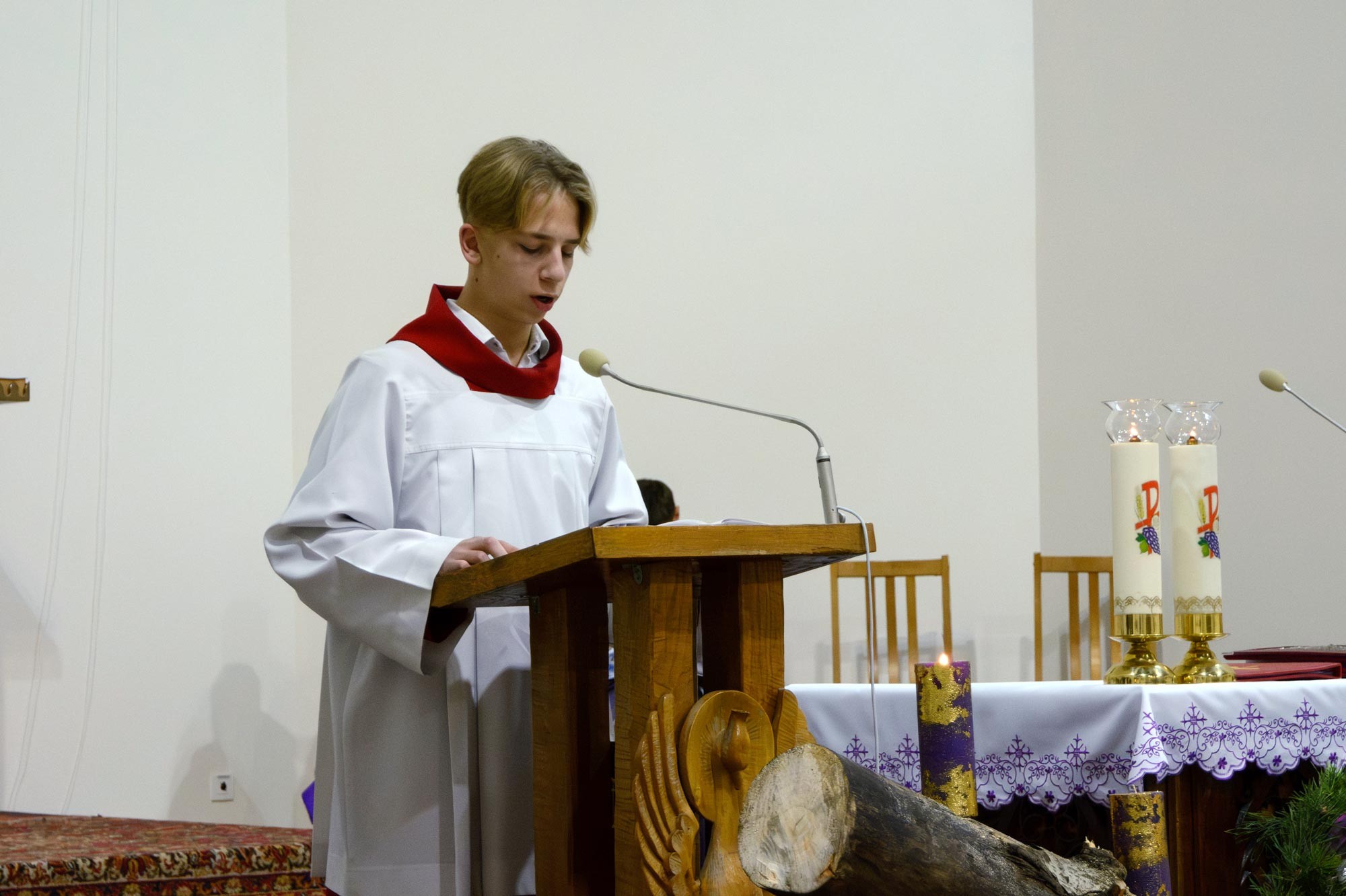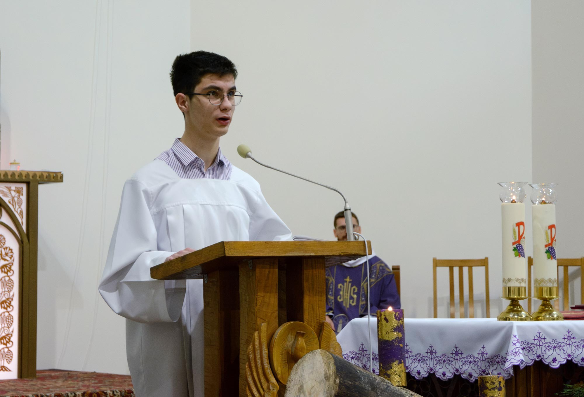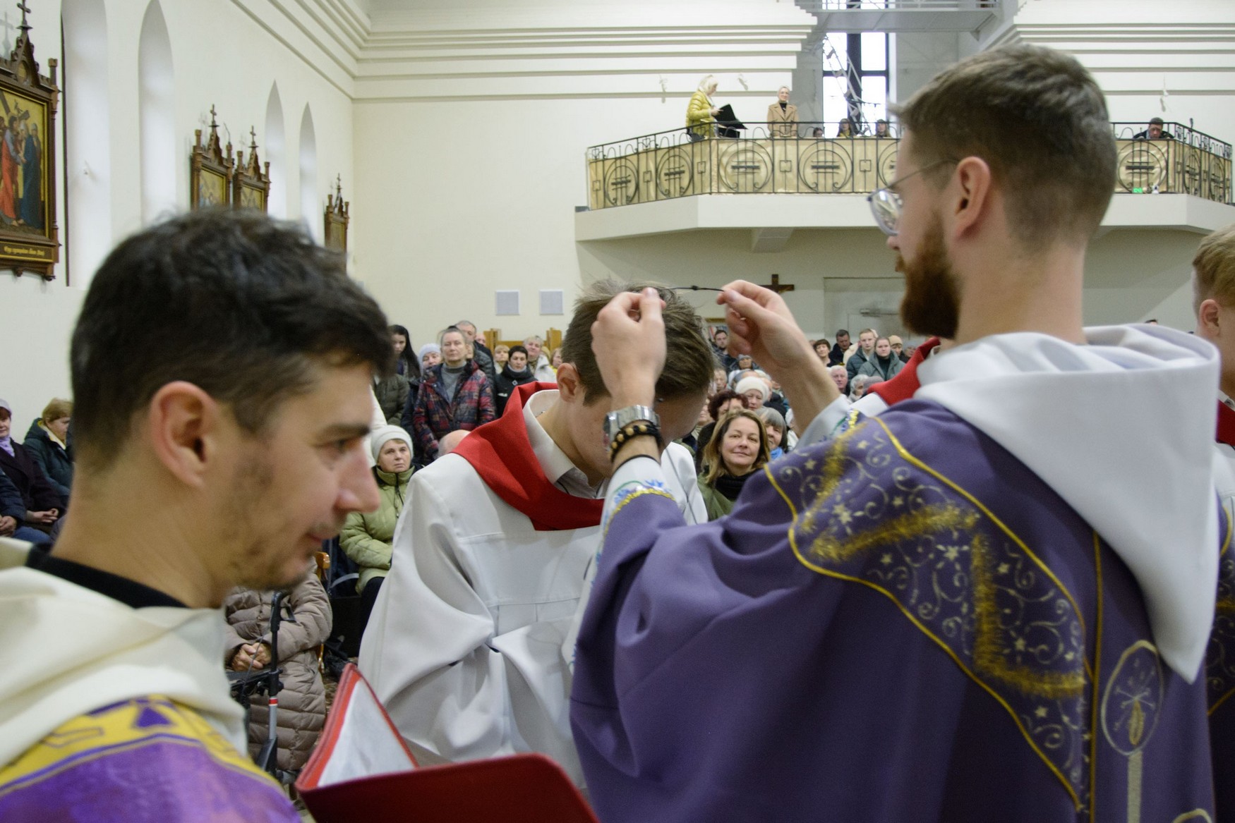 Перад Богам і сабраным людам хлопцы ўрачыста склалі свае абяцанні і з рук пробашча брата Уладзіслава Мінько атрымалі знакі прыналежнасці да сваёй новай ступені служэння: для новапрызначаных міністрантаў святла імі з'яўляюцца белыя палярыны, а для міністрантаў кнігі - крыжы, якія падчас Імшы яны будуць насіць паверх комжы.