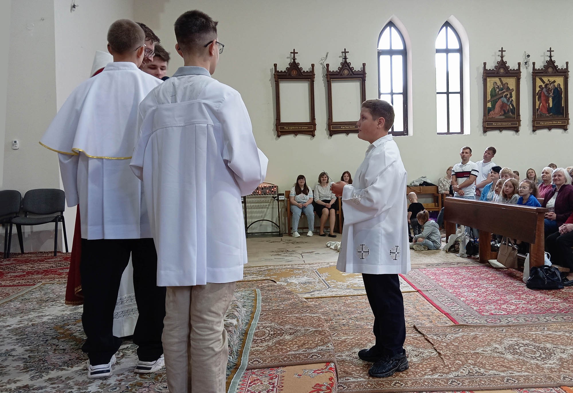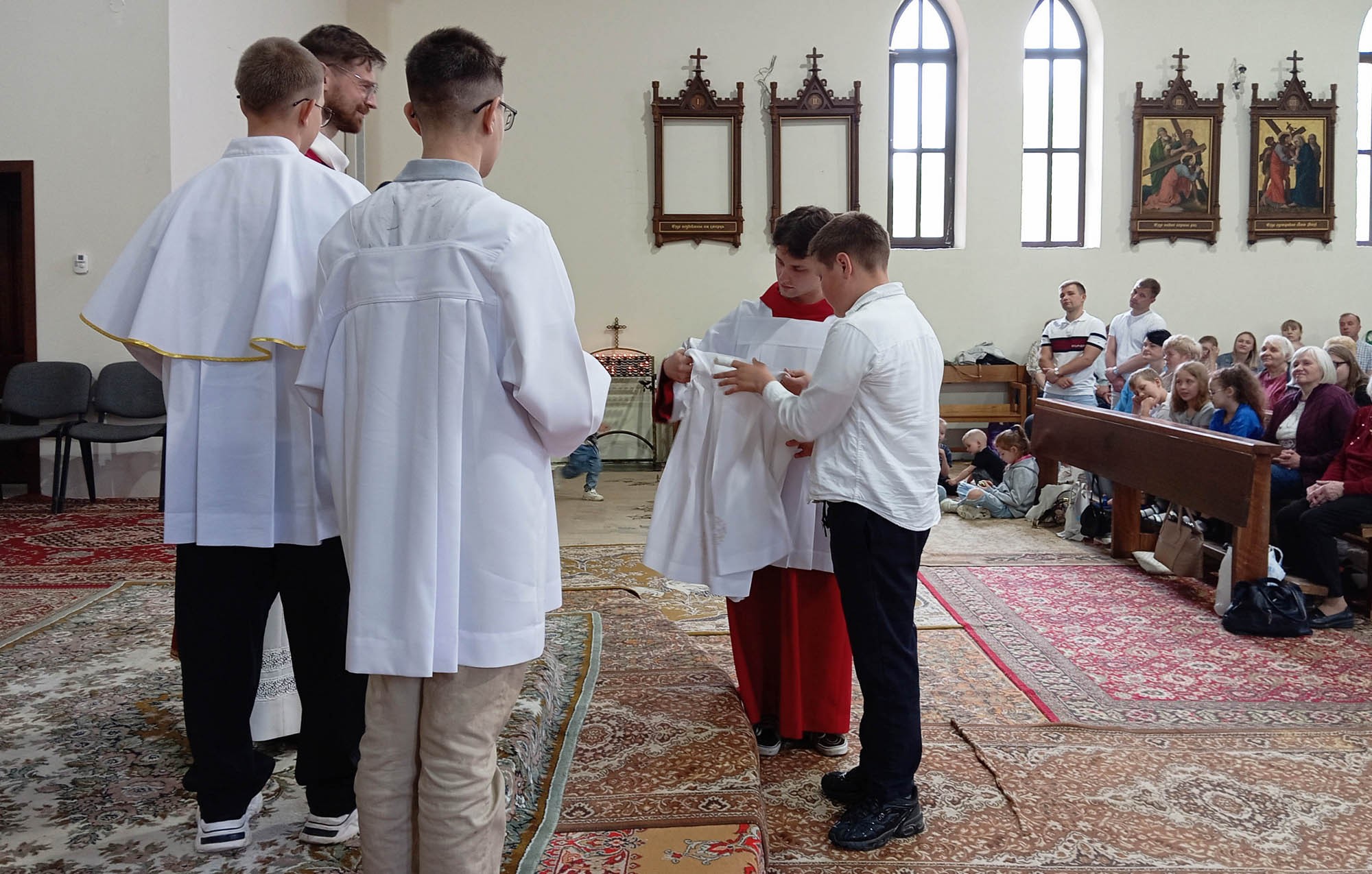 Пасля гаміліі адбылося ўрачыстае прыняцце Паўла ў міністранты. Перад алтаром ён склаў сваё абяцанне сумленна выконваць абавязкі міністранта хараліста, пасля чаго атрымаў комжу. Яе белы колер - знак чыстага сэрца. "Жадаю табе ўбачыць у тваім пакліканні, што Бог табе давярае", - сказаў пробашч.
