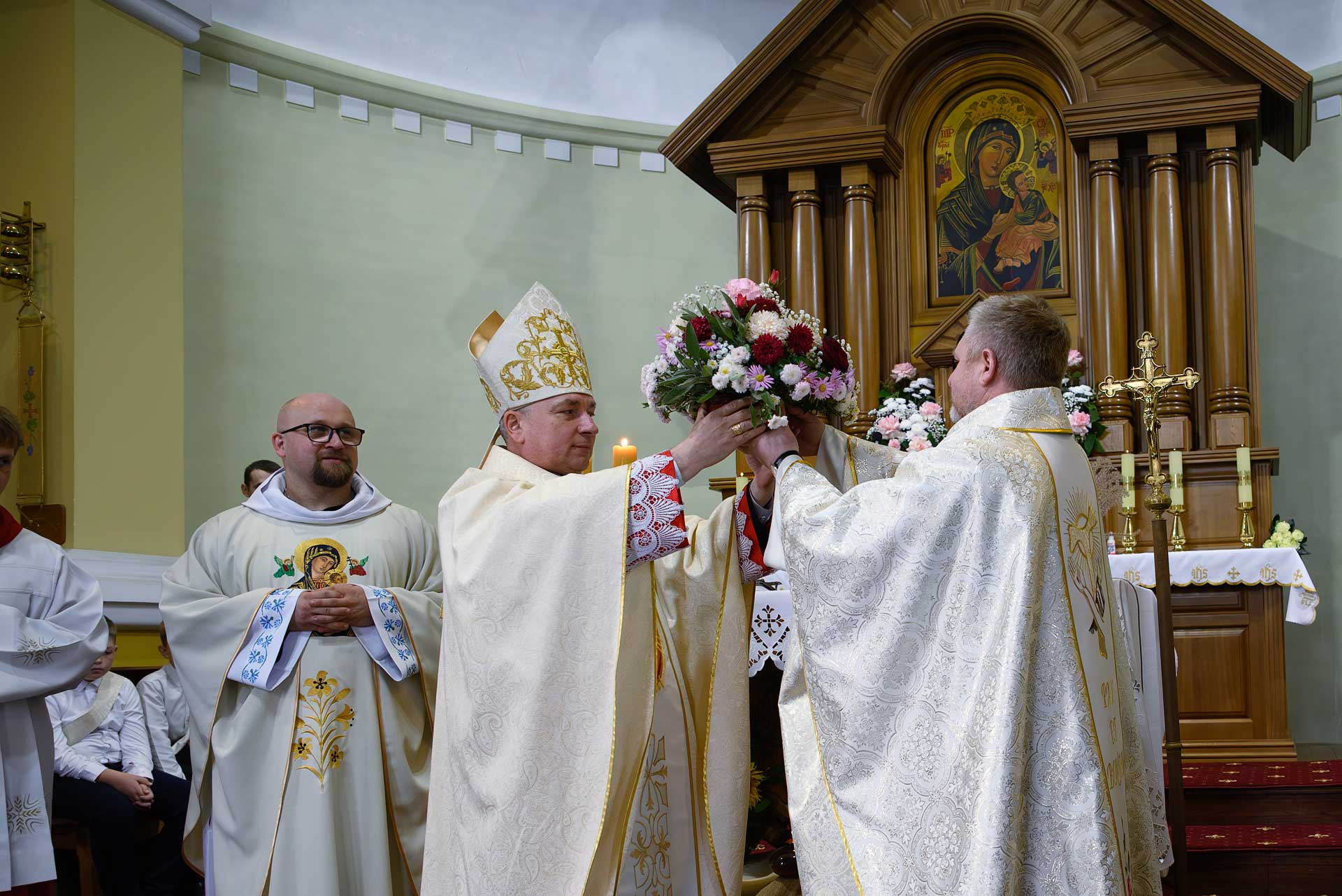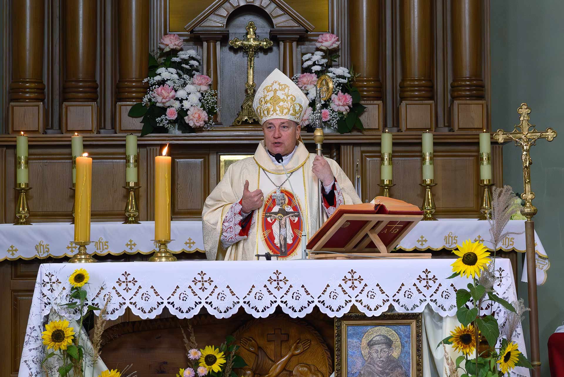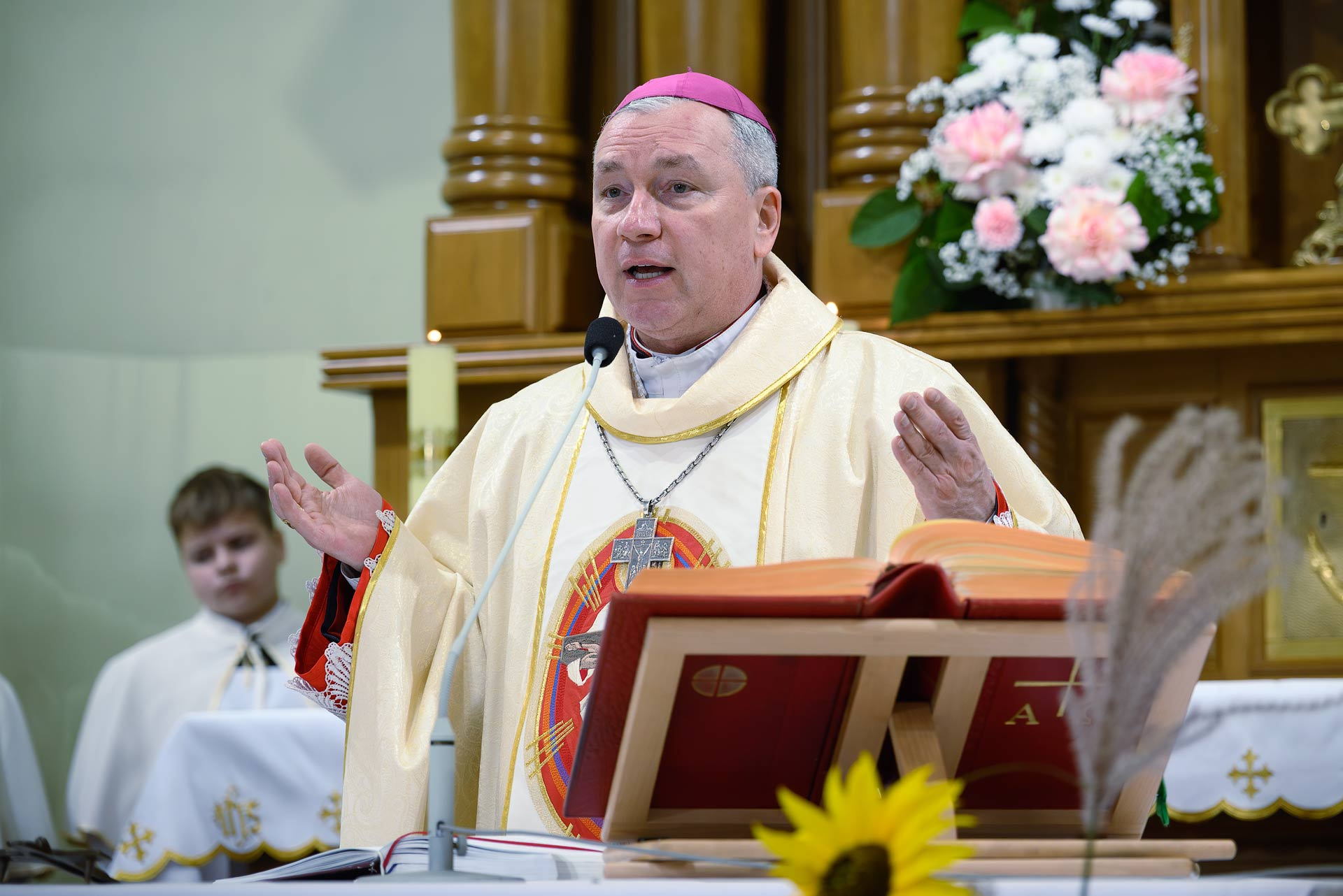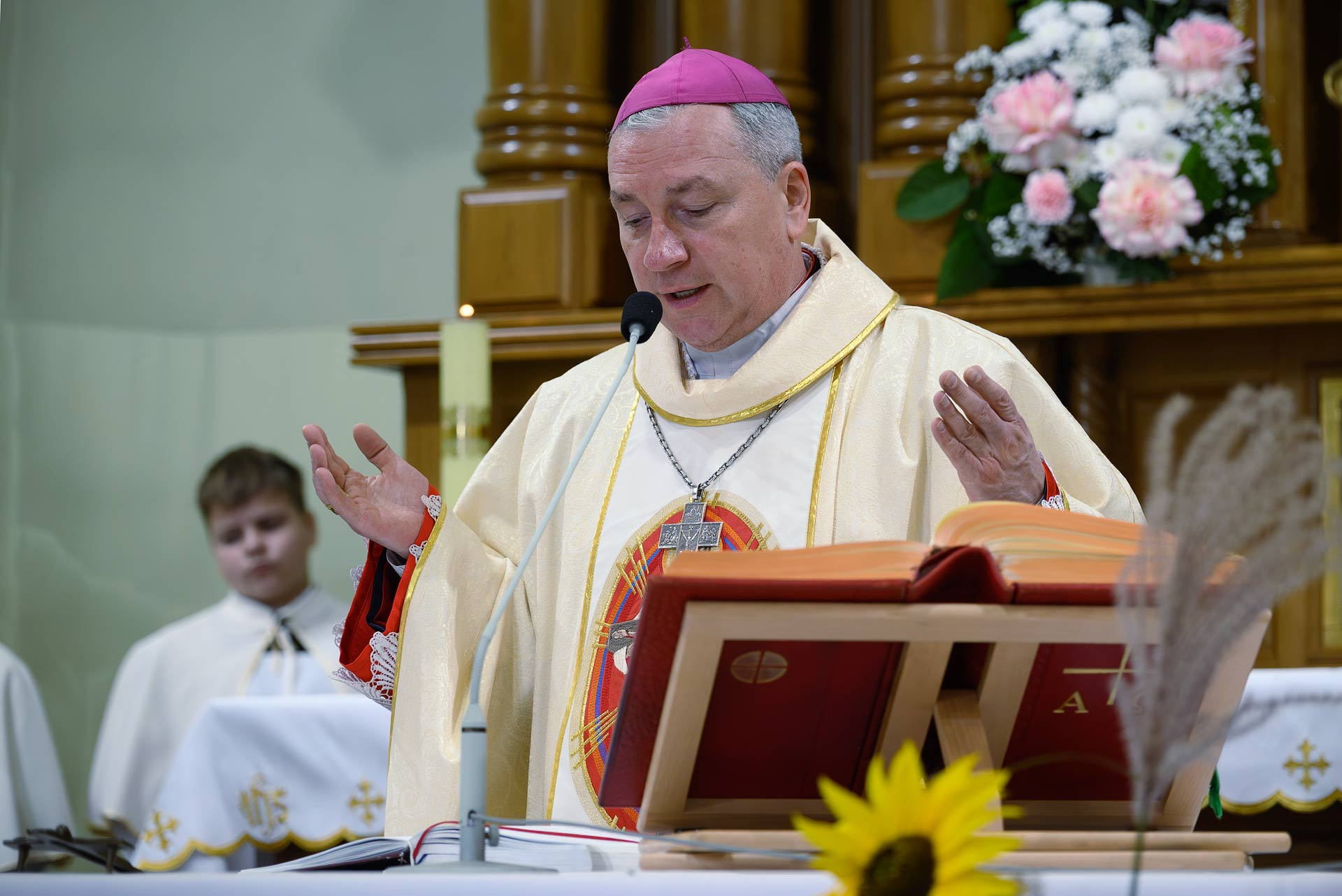 У гаміліі уладыка адзначыў, што гэты дзень для парафіі з’яўляецца падвойным святам. З аднаго боку, гэта юбілейная дата з моманту асвячэння касцёла, калі ён ператварыўся са звычайнага будынка ў дом Божы - выключную уласнасць Хрыста, месца, дзе адбываецца сапраўдная сустрэча чалавека з Богам і дзе чалавек дакранаецца да святая святых. Найперш, іерарх выказаў словы падзякі ўсім, хто прымаў удзел у будоўлі касцёла, які сваім прывабным знешнім выглядам ўпрыгожвае цэнтр горада: “Кожная цагелка – гэта кавалачак сэрца кожнага з людзей, якія дапамагалі будоўлі. Кожная малітва, ахвяра, праца - важныя. І пры будаванні, і далей пры ўтрыманні святыні”.