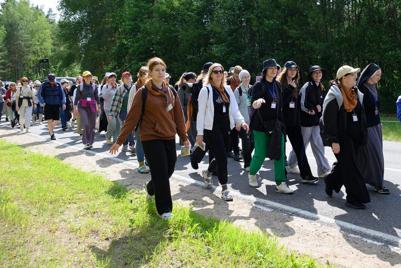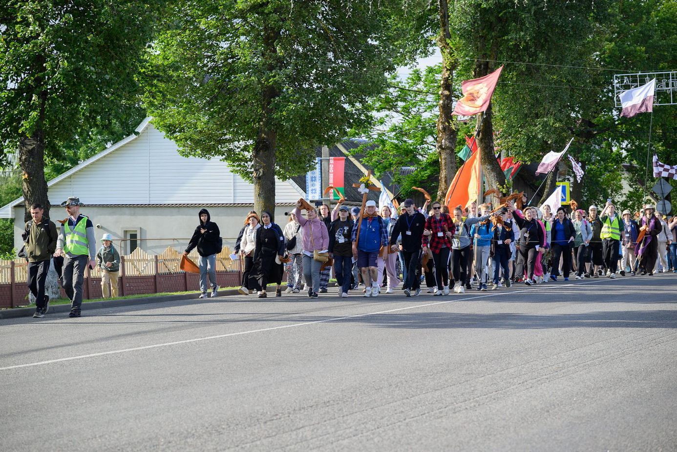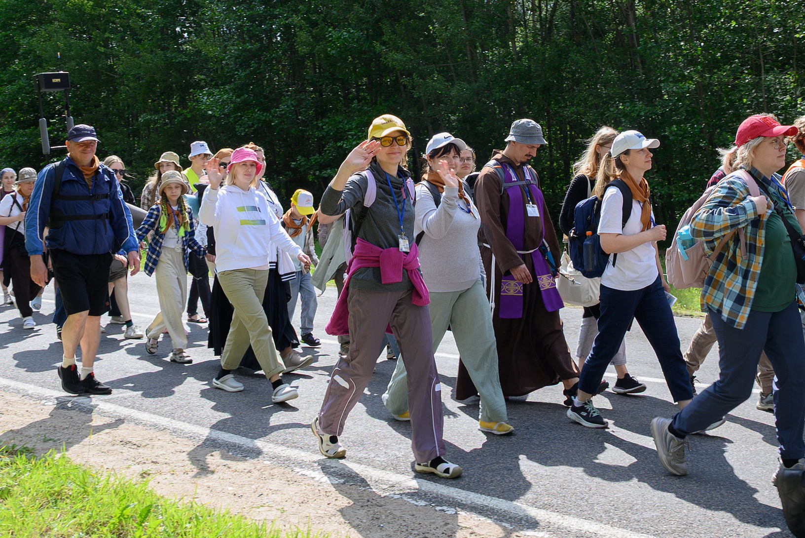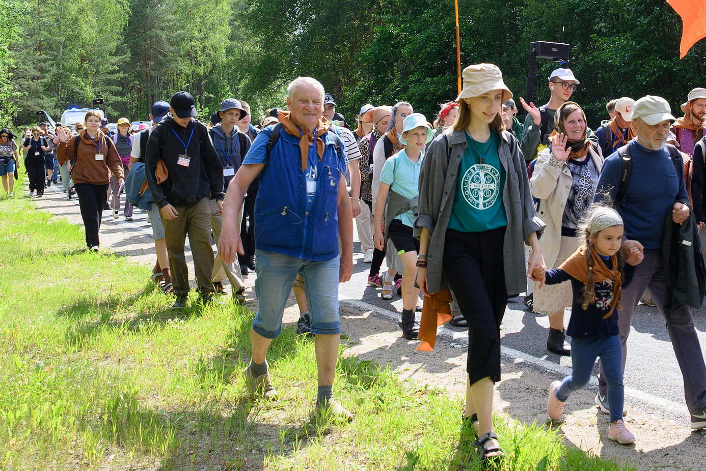 Вялікая калона паломнікаў займала адну паласу дарогі і цягнулася на некалькі дзясяткаў метраў. Таму, каб пачуць канферэнцыі і спевы, моцныя мужчыны неслі за плячыма 4 калонкі. А 9 мужчын і хлопцаў - парадкавых (пілігрымы іх празвалі "парадачнымі") праз увесь шлях кантралявалі дарожны рух, каб ісці было бяспечна. Яны бегалі ўздоўж калоны, забягалі наперад, даганялі хвост калоны... Урэшце, пакуль пілігрымы дапляліся да Будслава, адолеўшы 120 км, парадкавыя, як засведчыў смартгадзіннік, набегалі ў 1,5 разы больш.