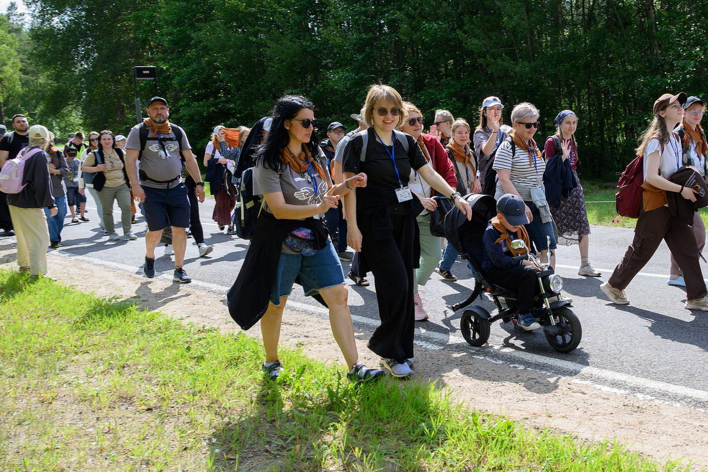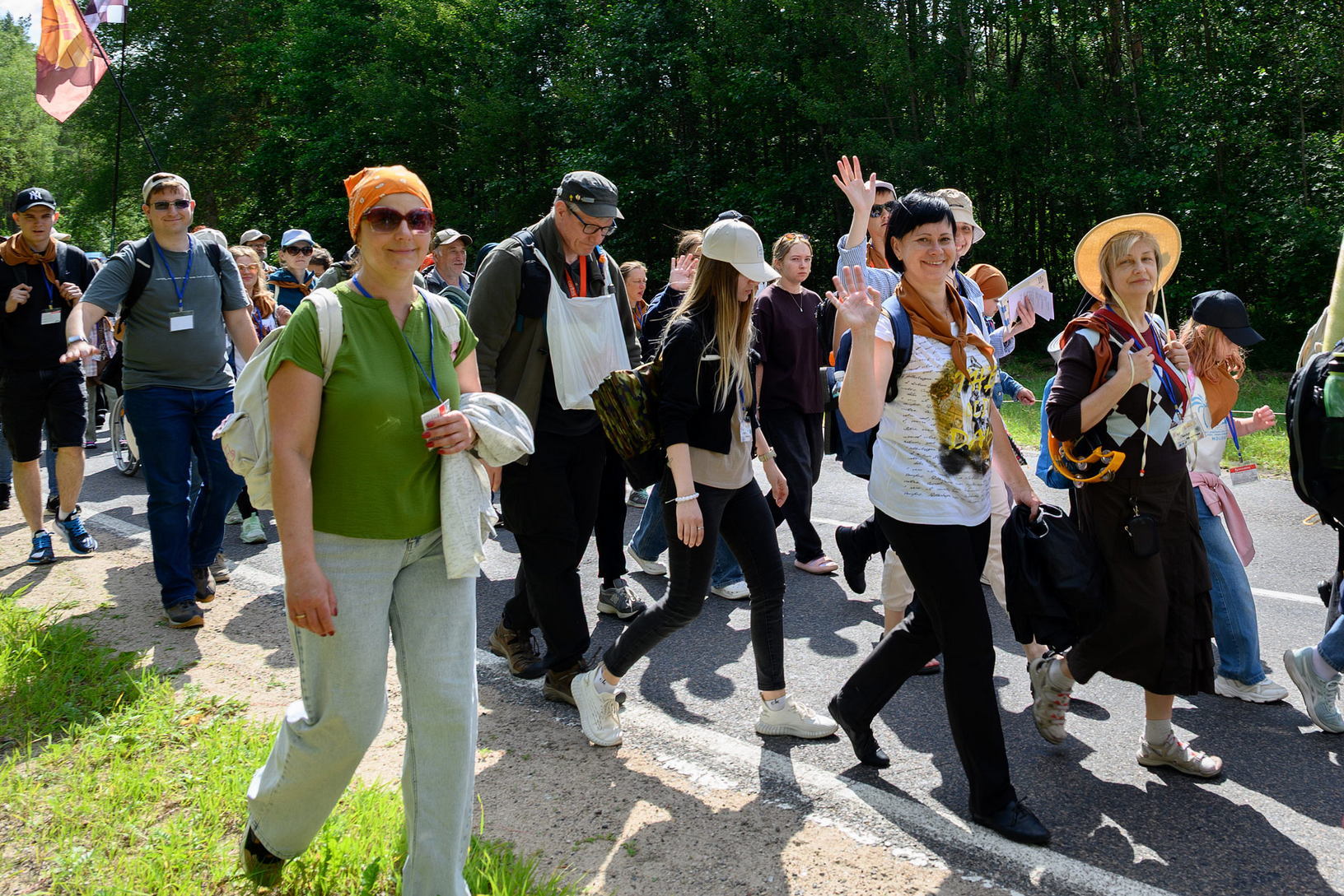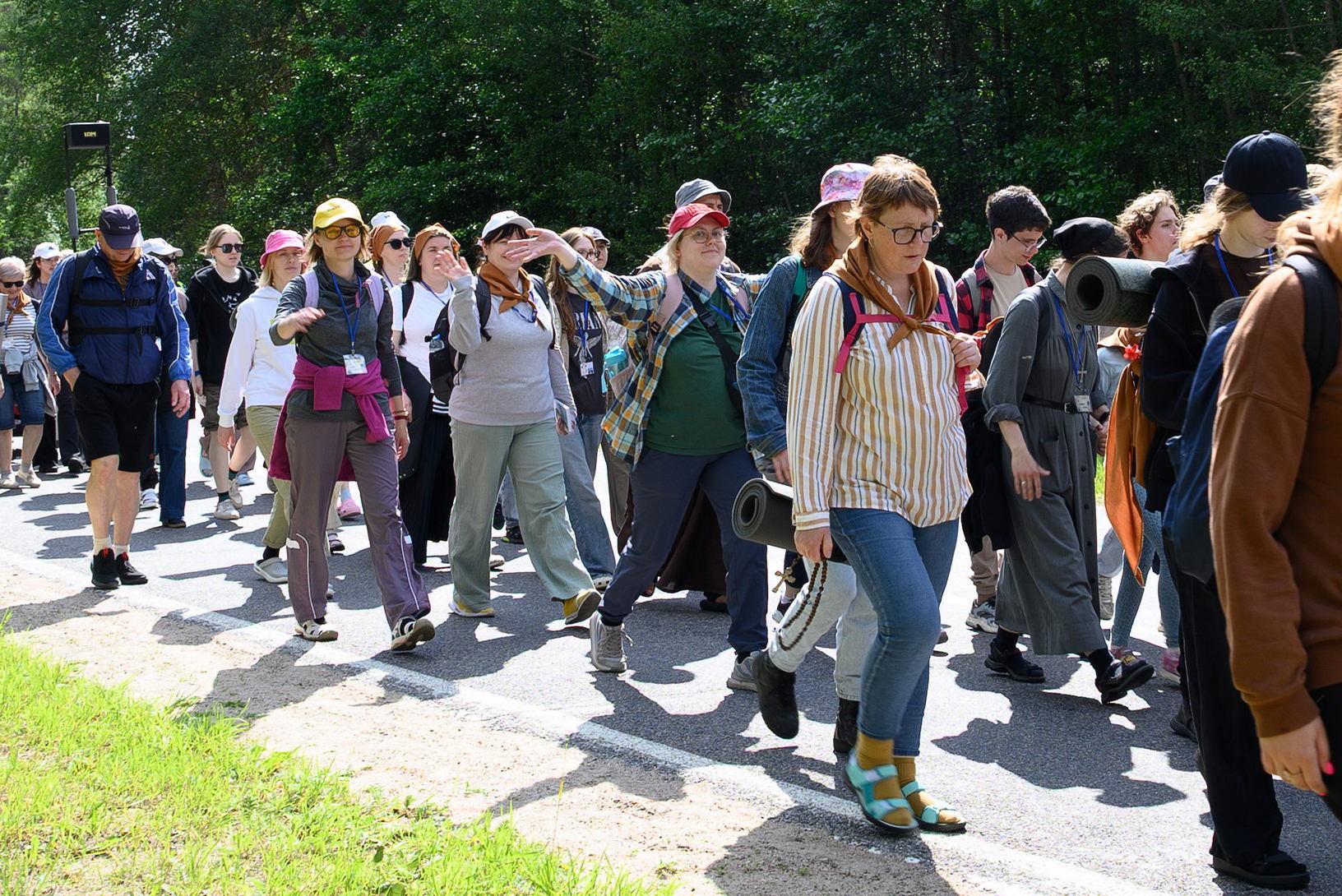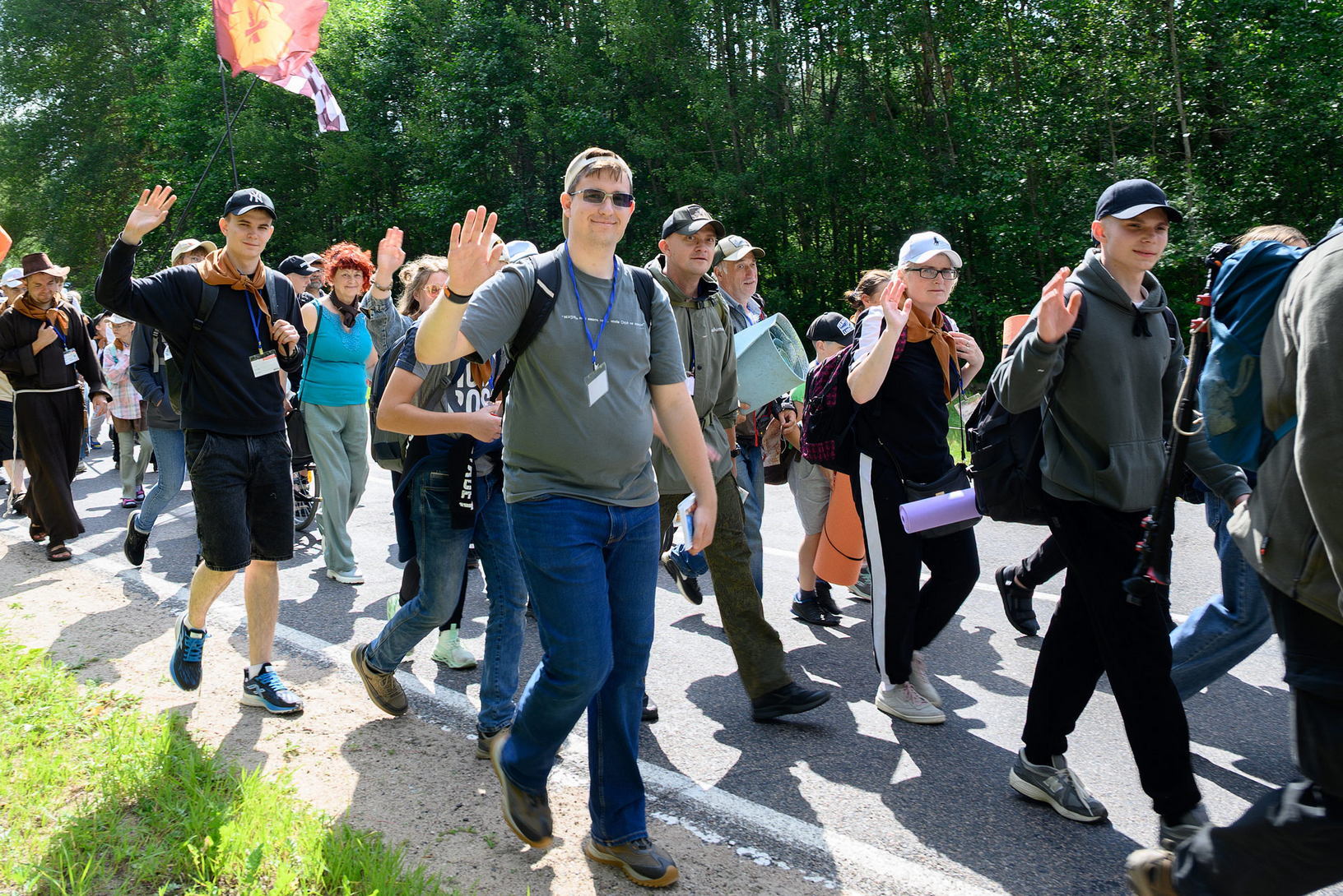 Вялікая калона паломнікаў займала адну паласу дарогі і цягнулася на некалькі дзясяткаў метраў. Таму, каб пачуць канферэнцыі і спевы, моцныя мужчыны неслі за плячыма 4 калонкі. А 9 мужчын і хлопцаў - парадкавых (пілігрымы іх празвалі "парадачнымі") праз увесь шлях кантралявалі дарожны рух, каб ісці было бяспечна. Яны бегалі ўздоўж калоны, забягалі наперад, даганялі хвост калоны... Урэшце, пакуль пілігрымы дапляліся да Будслава, адолеўшы 120 км, парадкавыя, як засведчыў смартгадзіннік, набегалі ў 1,5 разы больш.
