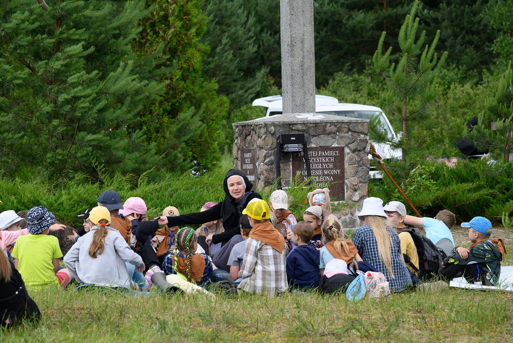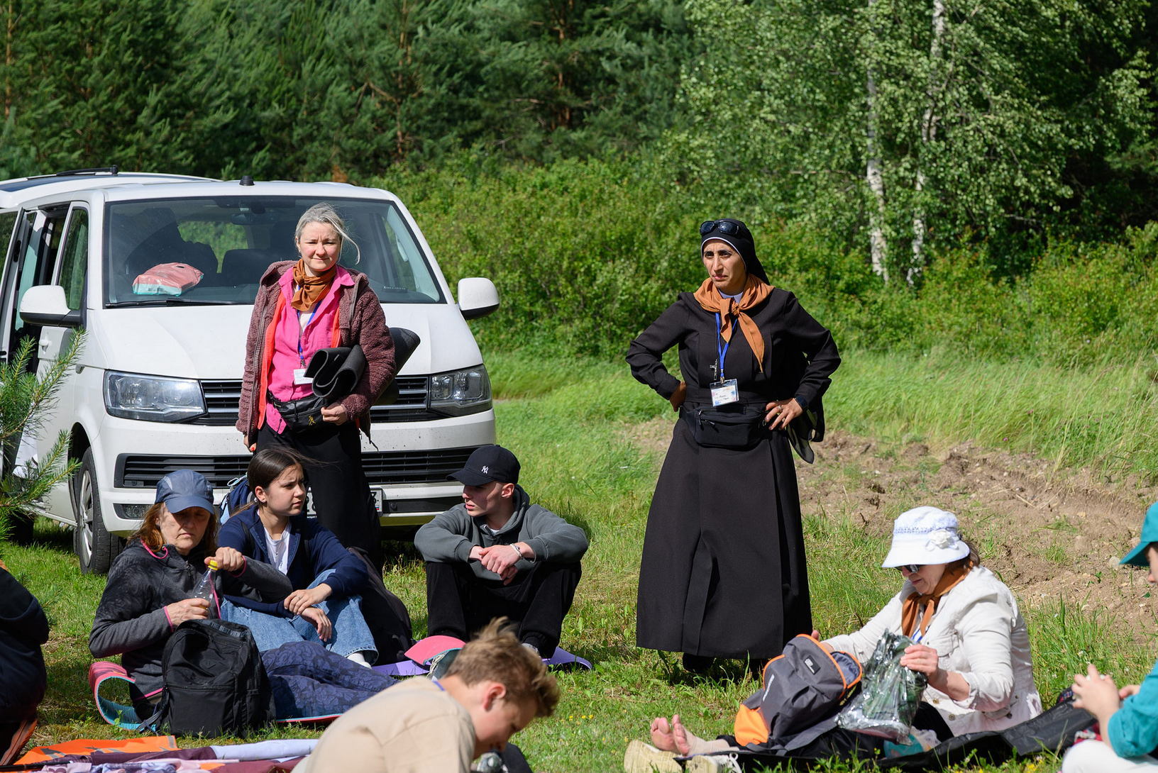 На першым прывале а. Яраслаў Мітжак, які служыць у Стаўрапале, даў некалькі важных парадаў, як правільна перажыць паломніцтва, каб яно сапраўды магло перамяніць жыццё, каб яно было сапраўдным пераходам у зямлю абяцаную. Асноўныя тэзісы: 1) Калі я ў паломніцтве, значыць, я адкрыў у сабе Божы заклік, і значыць, Госпад штосьці ад мяне хоча і штосьці для мяне прыгатаваў. Магчыма, гэта патрэбна для распазнання і ўмацавання ў пакліканні, каб змог убачыць і прыняць сэнс майго жыцця на дадзеным этапе (святарства, манаства, сямейнага жыцця, удаўства, хваробы, г.д.), каб зразумець, што менавіта магу зрабіць лепш на гэтым маім шляху да святасці. Важна заўважаць Божыя знакі, быць уважлівым, каб зразумець волю Бога. 2) Важна меть інтэнцыю, матывацыю: дзеля чаго? Варта памятаць, што я малюся не толькі словамі малітвы, не толькі ахвярай св. Імшы, але ўсім паломніцтвам - ахвярую цяжкасці (дыскамфорт, боль, г.д.). Тады лягчэй іх прымаць. Не трэба шукаць складанасці спецыяльна. Калі магу выбрать, то выбіраю самы лёгкі шлях, і ён ад Бога. Там і будзе мой крыж, якога хопіць. Прымаю тыя крыжы, якія трапяць да мяне не залежна ад мяне.