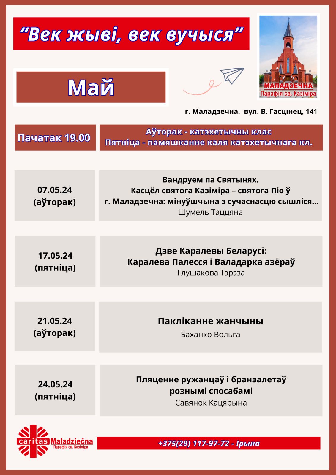 4. У суботу 4 мая падчас вячэрняй святой Імшы а 18 гадзіне будзем гасціць у нашым касцёле архідыяцэзіяльнага душпастыра Апостальскага руху “Маргарытка” кс. Паўла Эйсманта. “Маргарытка” – гэта рух малітвы за святароў, у нашай парафіі існуе ажно 32 такіх колы. Запрашаем усіх удзельнікаў разам памаліцца і пасля святой Імшы - на сустрэчу.