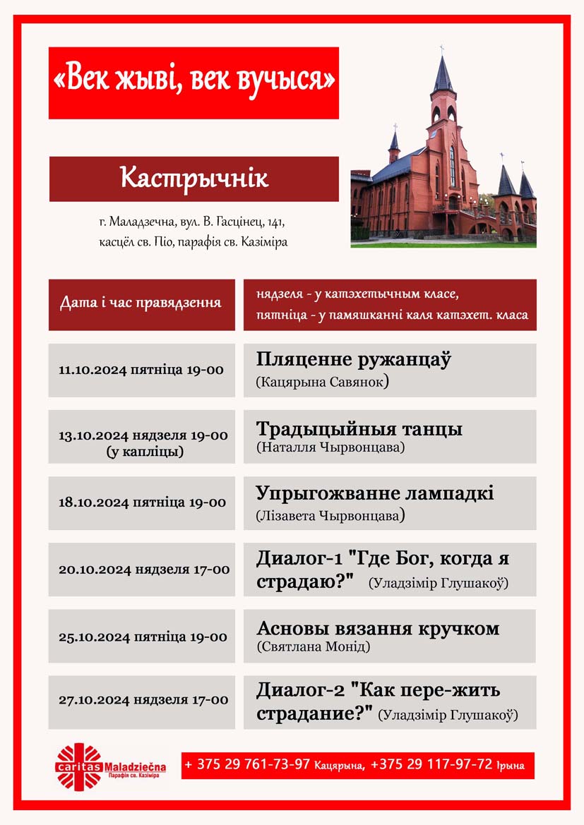 7. Важная аб’ява для кожнага, хто хоча зрабіць крок наперад на шляху веры, хто мае пытанне пра сэнс свайго жыцця і тых ці іншых цярпенняў: з панядзелка 27 кастрычніка і на працягу месяца ў нашай парафіі будуць адбывацца катэхезы, падчас якіх Пан прыходзіць са сваім Словам, поўным суцяшэння і святла. Запрашаем усіх: маладых і старэйшых, жанатых, незамужніх, і тых, у каго “ўсё складана”. Катэхезы аб хрысціянскай ініцыяцыі будуць адбывацца ў касцёле кожны панядзелак, сераду і пятніцу ў 18.45. Варта рашыцца і знайсці час!