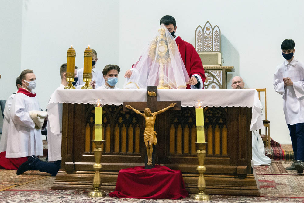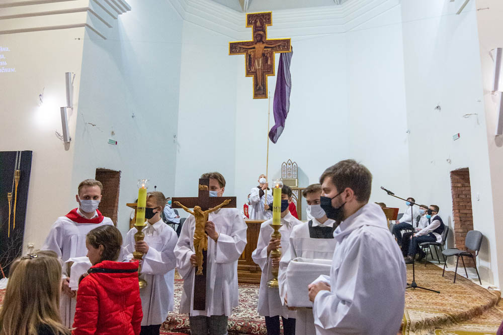 Пасхальны Трыдуум распачаўся з вечаровай Імшы Вячэры Пана у Вялікі Чацвер, калі асаблівым чынам з падзякай успаміналі ўстанаўленне сакрамэнтаў Эўхарыстыi i святарства. Цэлебрацыя распачалася прыгожым святочны перазвонам, але адразу з гэтага моманту музычныя iнструменты i званы змоўклi, каб загучаць толькi ў Святую пасхальную ноч. Гэта знак пачатку перажывання касцёлам мукi Збаўцы. Як знак таго, што да Вялiкай ночы не будзе цэлебравацца святой Iмшы, з алтара быў зняты абрус.