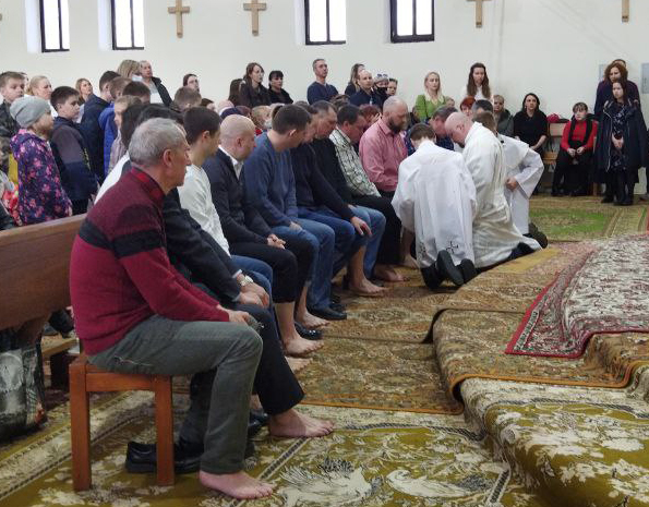 Пасля гаміліі быў здзейснены абрад абмыцця ног дванаццаці мужчынам з нашай парафіі: праз паслугу а. Ігара Езус абмыў і уцалаваў ногі Сваім вучням.