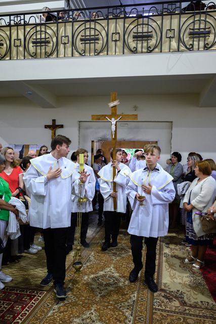 Урачыстую імшу цэлебраваў ксёнз-пробашч нашай парафіі а. Ігар Колзун. Шмат вернікаў прыйшло пасля працы да святыні, каб злучыцца ў супольнай малітве. Айцец Уладзіслаў падкрысліў падчас гаміліі важнасць у гэты дзень яшчэ раз засяродзіцца на Таямніцы Эўхарыстыі і пераасэнсаваць важнасць лучнасці з Хрыстом у Святой камуніі. Самая годная манстранцыя для Найсвятейшага Сакраманта – гэта чыстае сэрца чалавека.