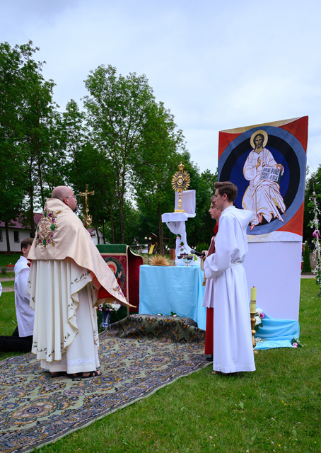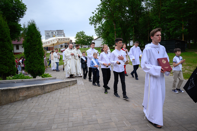Пасля Святой імшы традыцыйна адбылася працэсія вакол касцёла, якую пдарыхтавалі нашыя сёстры. Дарэчы, першыя звесткі пра працэсію з чатырма алтарамі паходзяць з Германіі, з Кёльна, і адносяцца да ХIV ст. У працэсіях, падчас якіх святар выносіць Найсвяцейшыя Дары з касцёла, хрысціяне даюць публічнае сведчанне сваёй веры і пабожнасці ў адносінах да Найсвяцейшага Сакрамэнту. Дзяўчаты, апранутыя як анёлы, кідалі пялёсткі кветак перад манстранцыяй з Найсвяцейшымі Дарамі. Спеў хору разносіўся навокал і прыцягваў увагу жыхароў гораду.