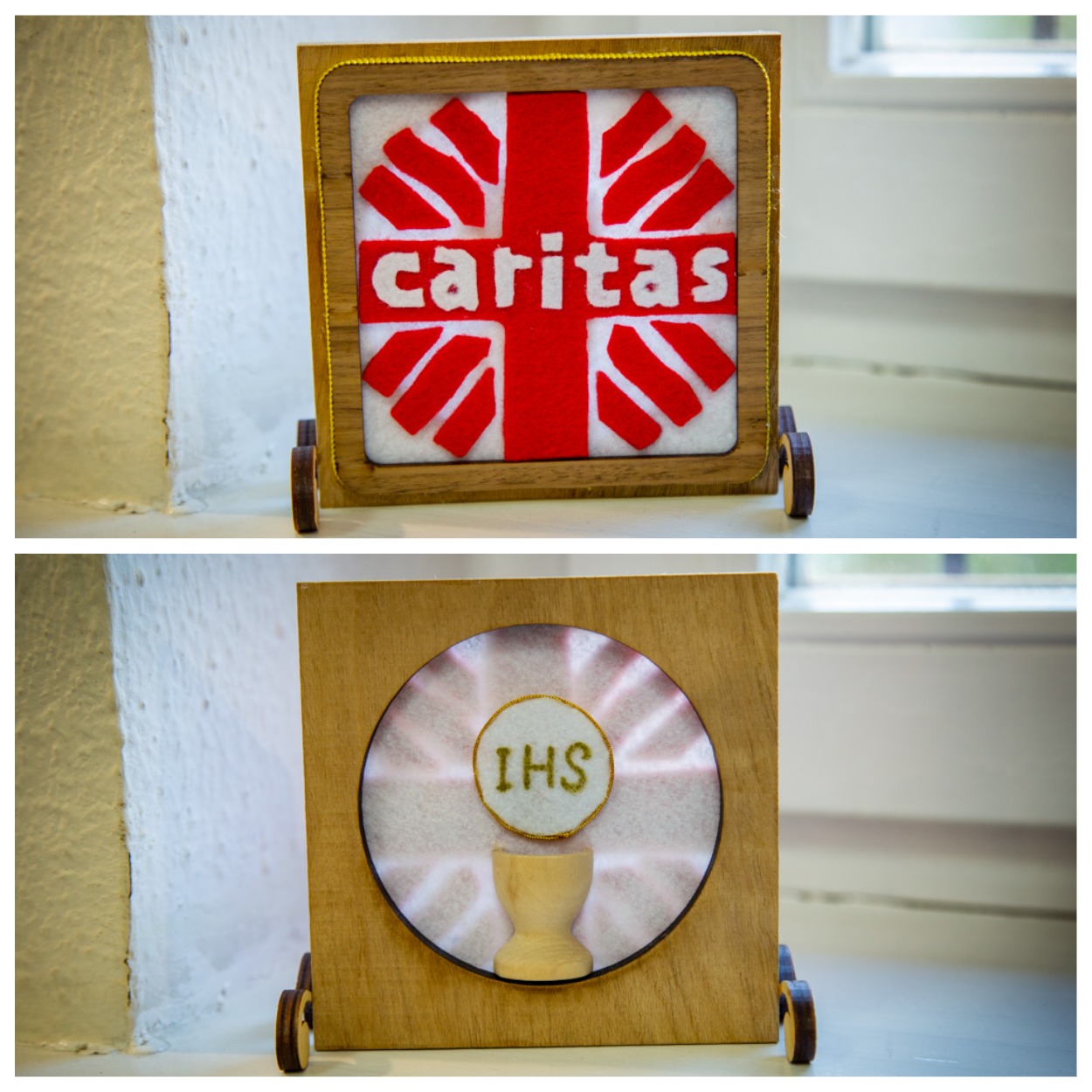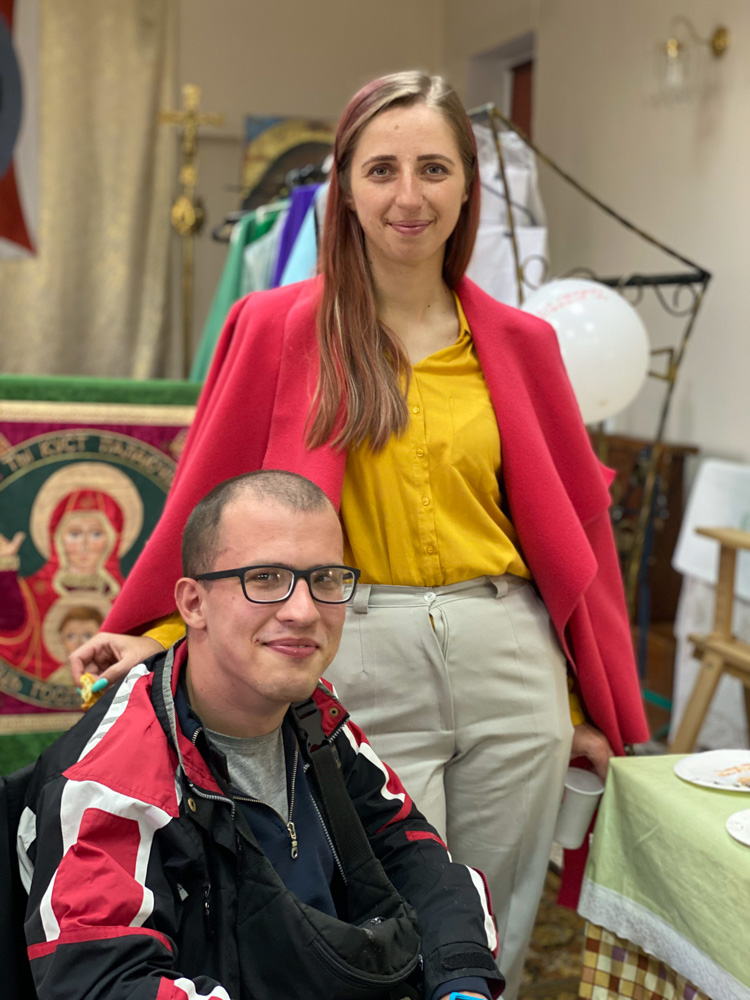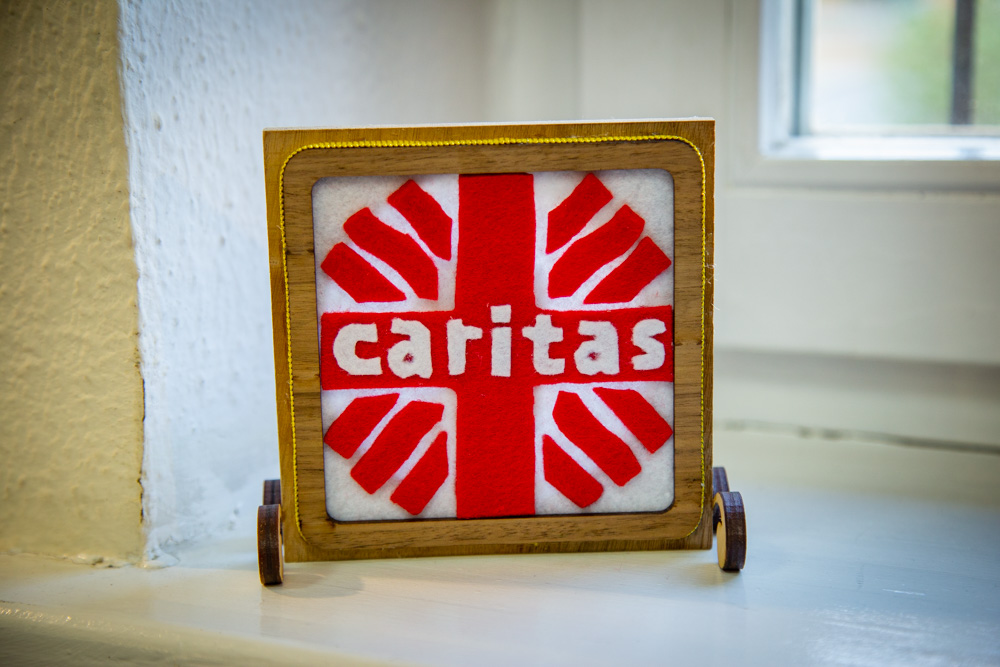 Ірына Крук падарыла брату Андрэю сувенір з лагатыпам caritas, зроблены сваімі рукамі.