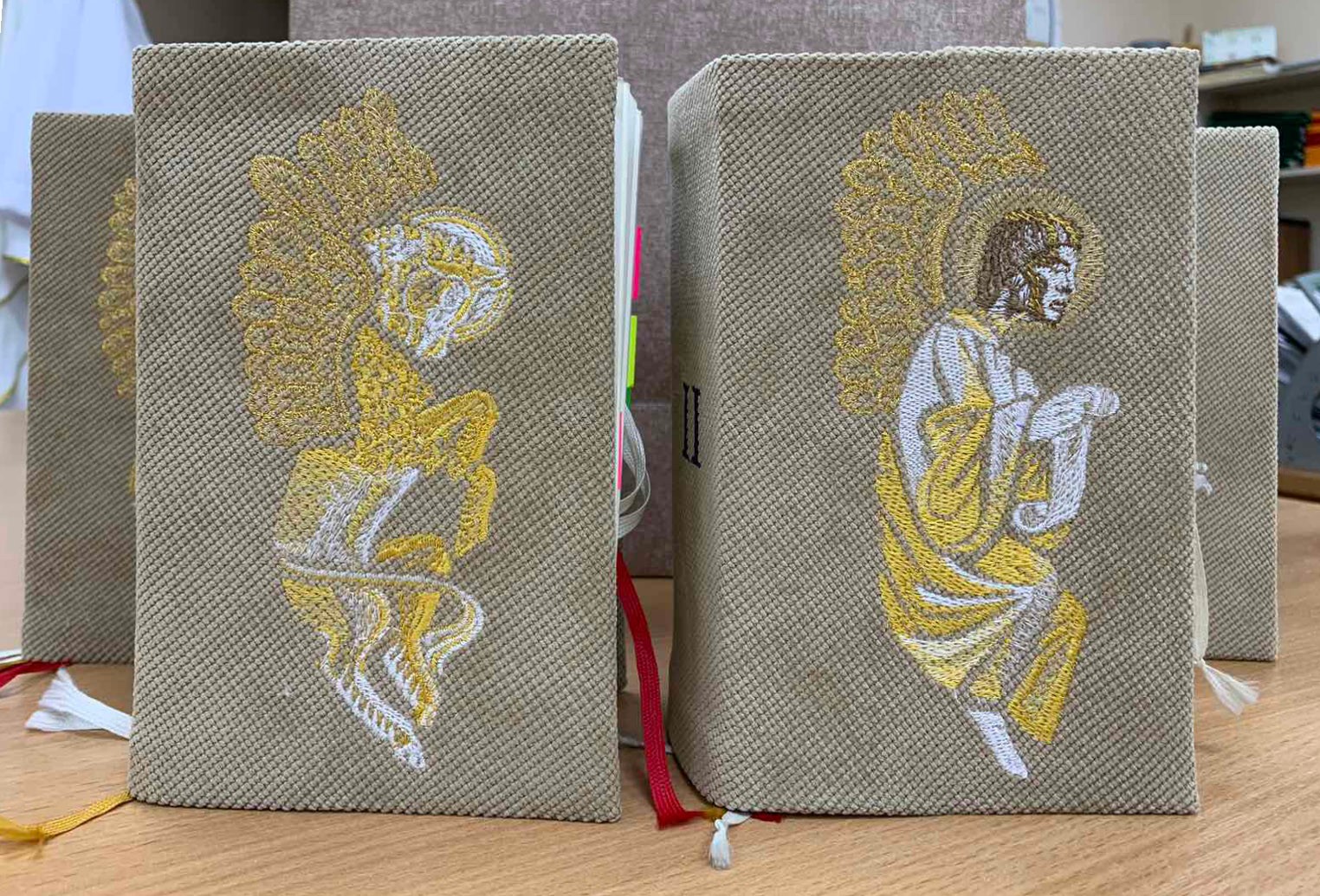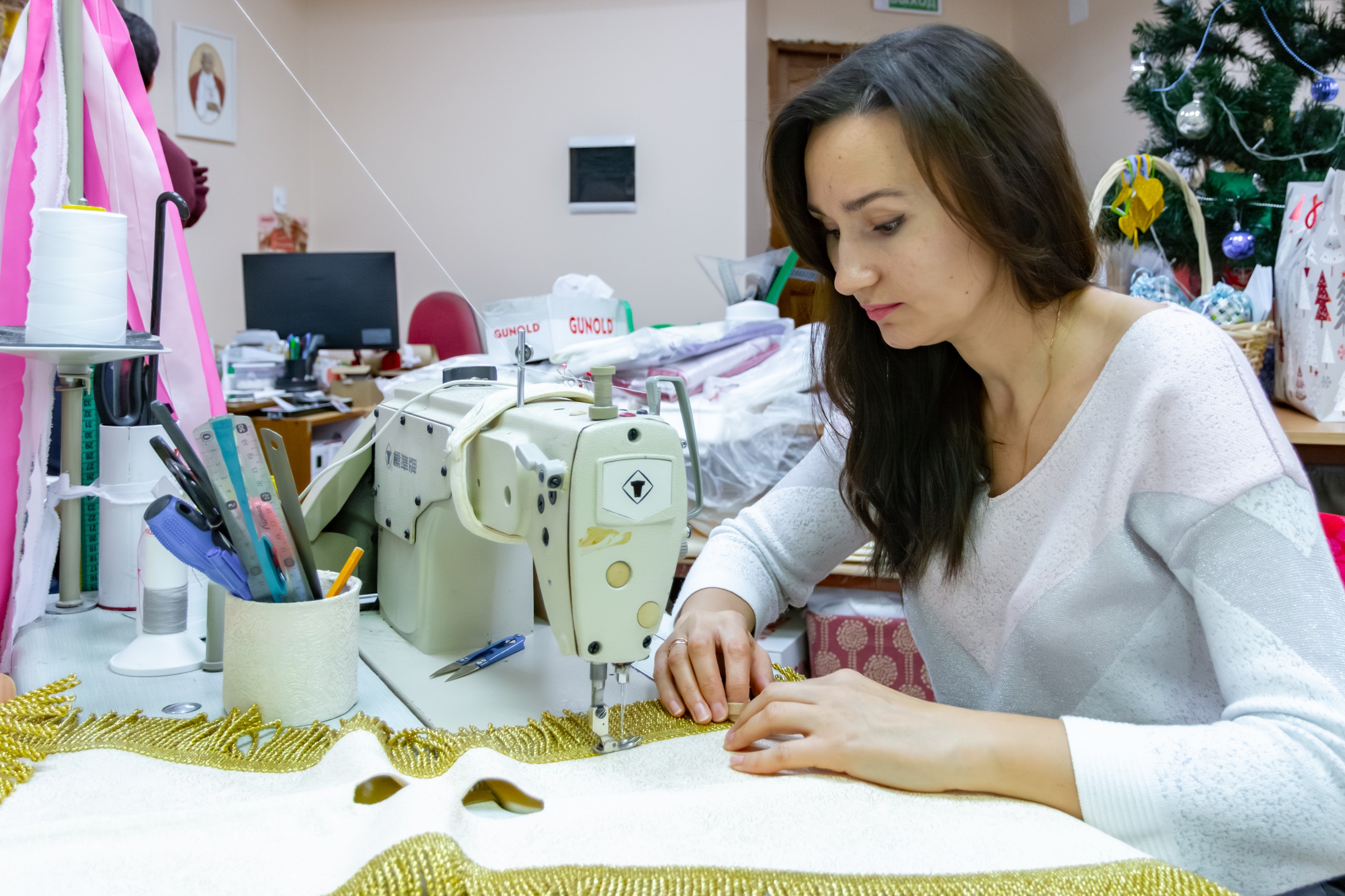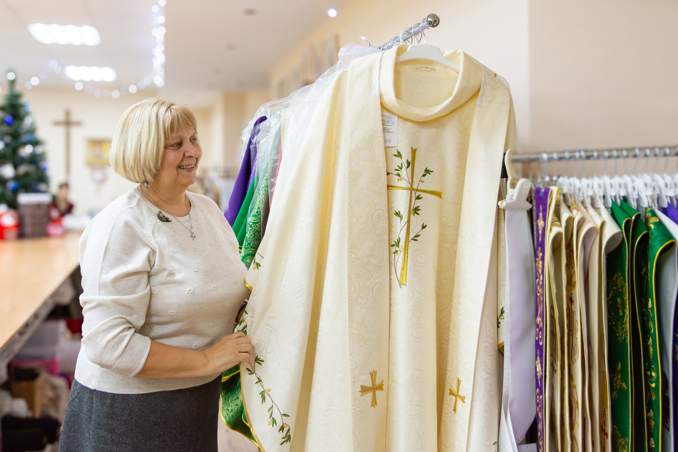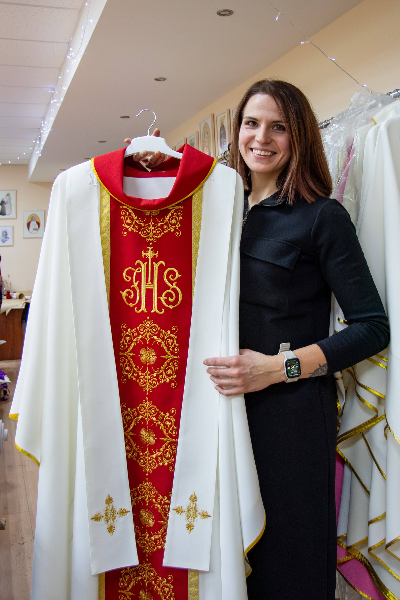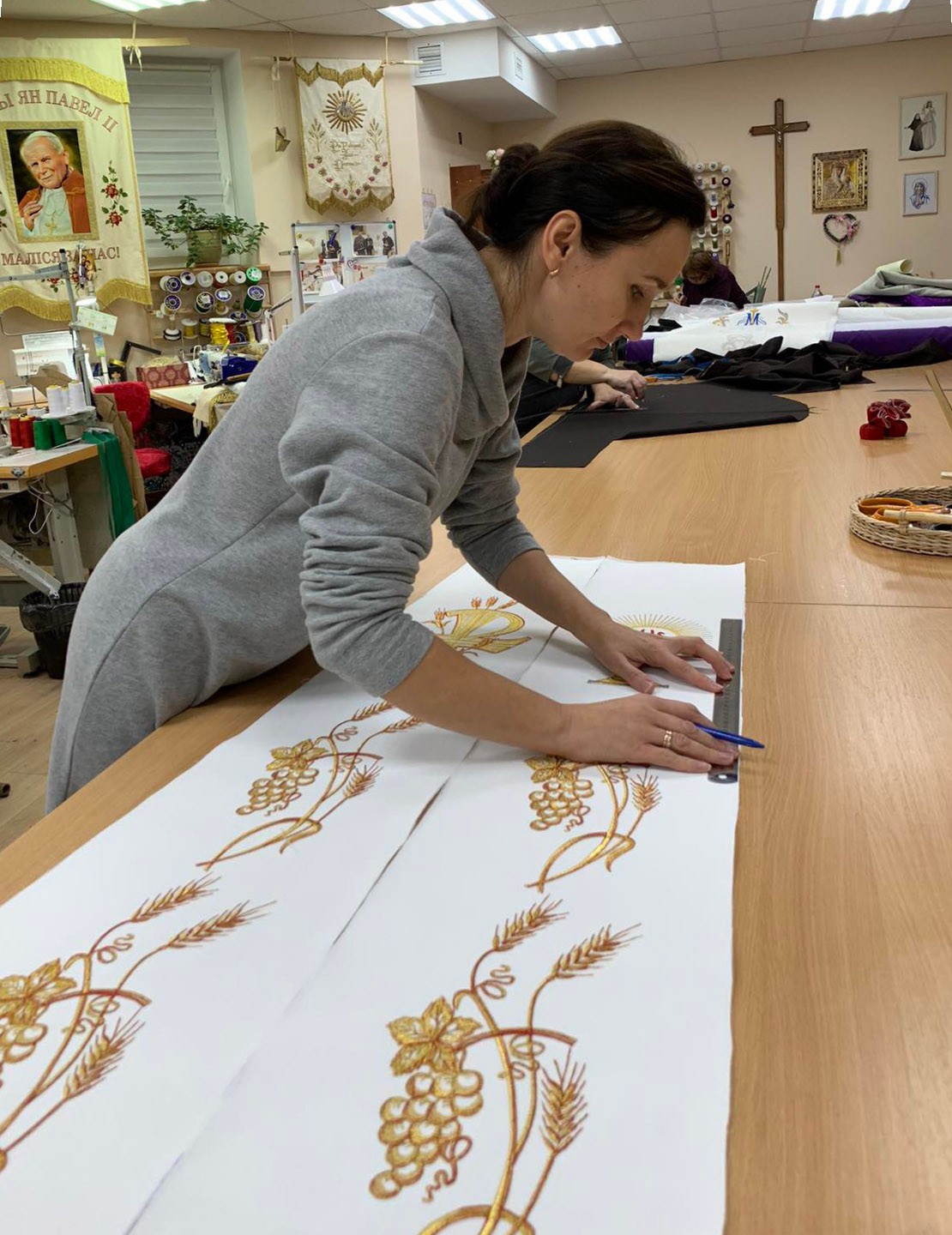 У майстэрні ёсць шэраг гатовых вырабаў, якія адразу можна набыць для святара, парафіі або сямейнай урачыстасці. Але дзяўчаты ахвотна бяруцца і за распрацоўку новых вырабаў па індывідуальнай замове: з вобразам апекуна касцёла, святога заступніка, з беларускімі матывамі ва ўзорах. Канешне, часам прыходзіцца асабліва "папацець", калі замаўляюць такі складаны выраб, як, напрыклад, біскупская мітра, або такі незвычайны, творчы, нават крыху пацешны выраб, як балдахін, перароблены з парасона. Але задавальненне ў вачах кліента і пачуццё дачынення да велічнай Божай справы аднаўляюць сілы і натхняюць. Ды і што можа быць лепш, чым працаваць у касцёле?! Разам з усім калектывам пачынаць працу з малітвы і, закончыўшы працоўны дзень, пайсці да святыні, каб праславіць Бога за ўсё - гэта сапраўдны скарб.