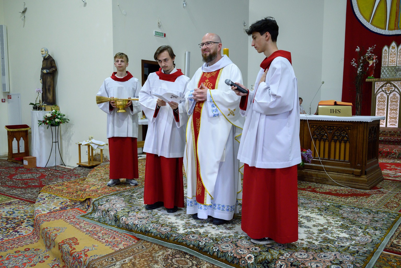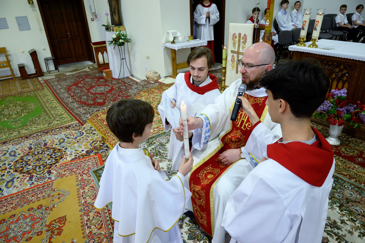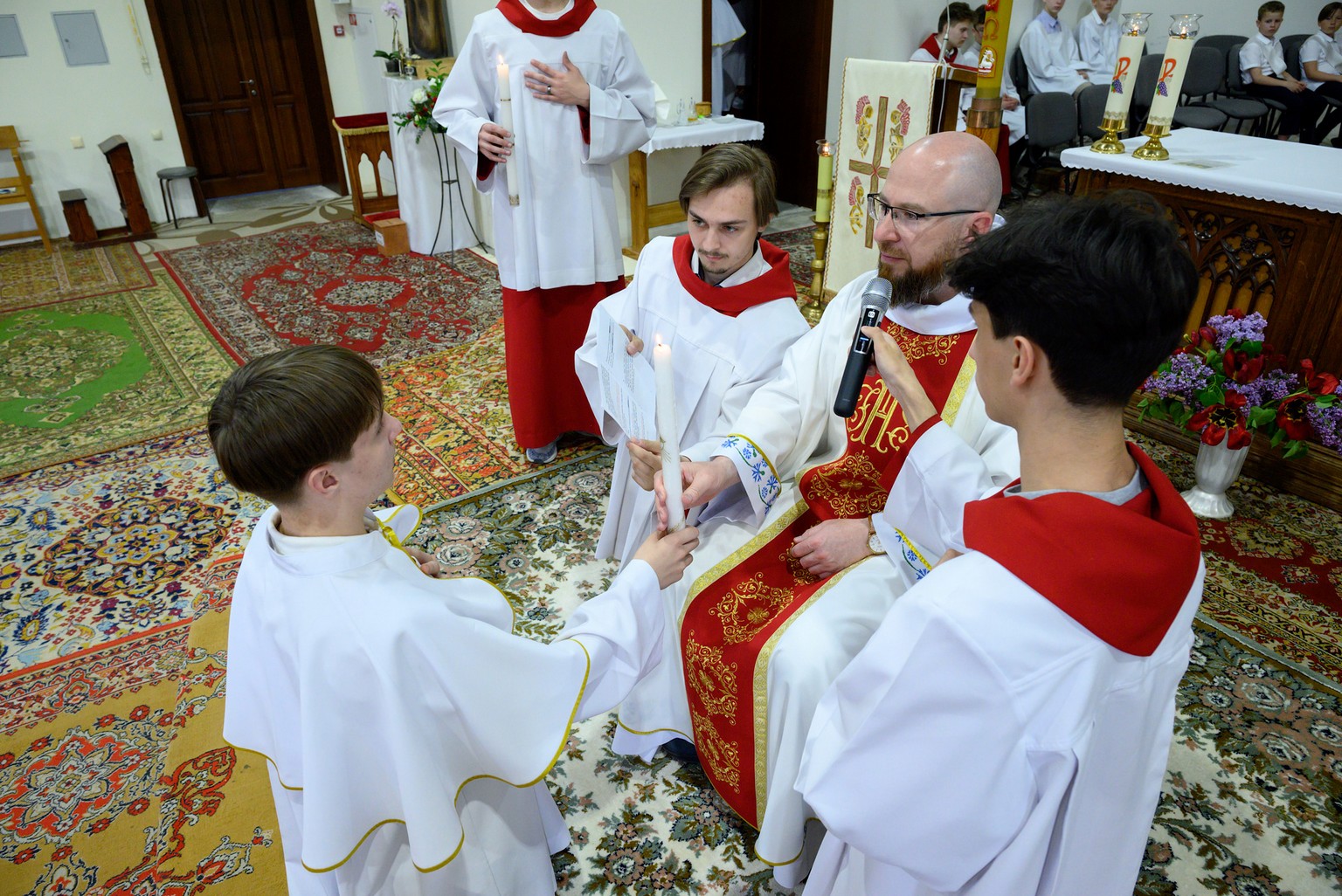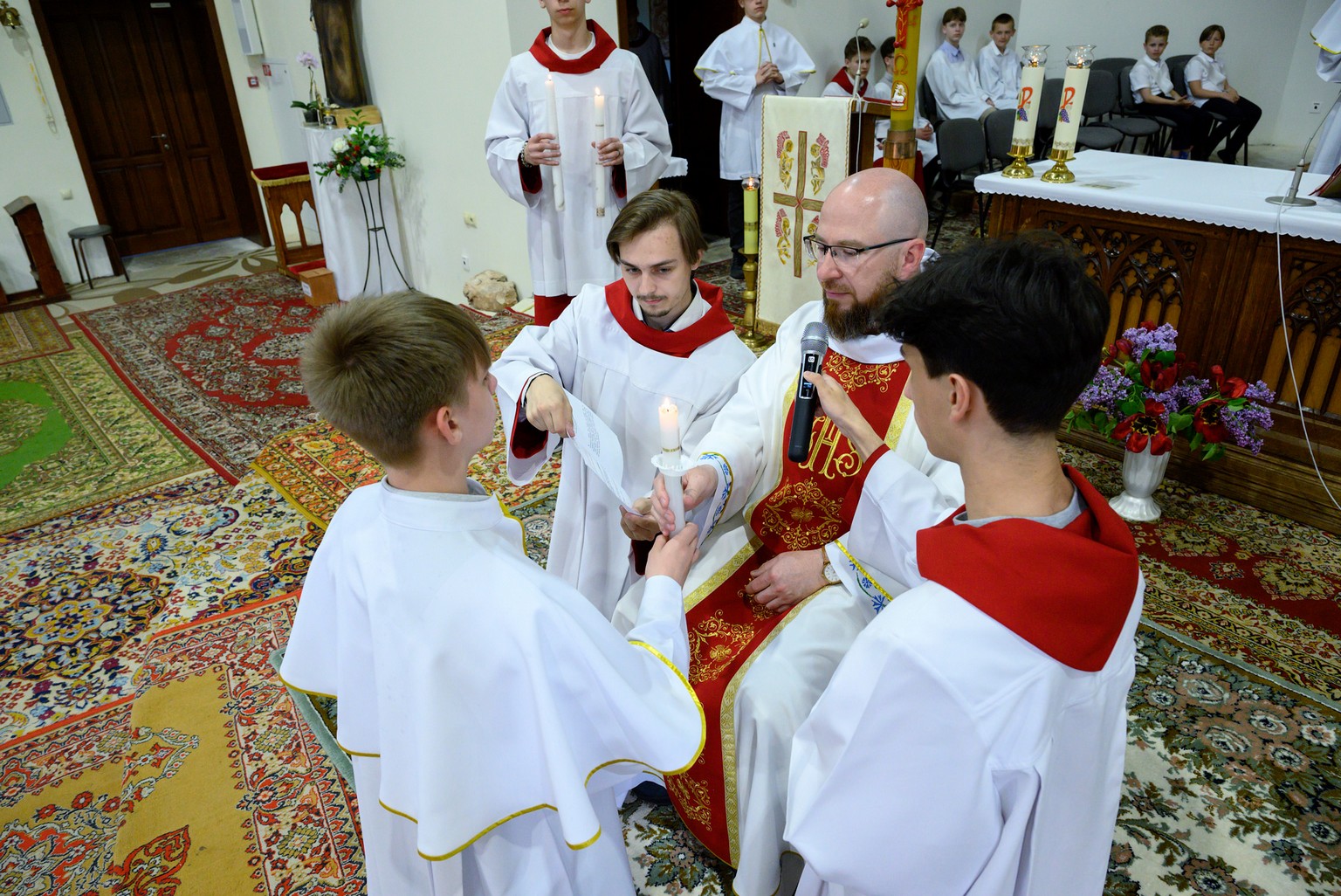 Падчас Імшы а 18 гадзіне трое міністрантаў харалістаў: Мікіта Хамякоў, Арцём Іванскі і Сямён Бараноўскі - прынялі стан міністрантаў святла. На знак гэтага яны атрымалі белыя палярыны.