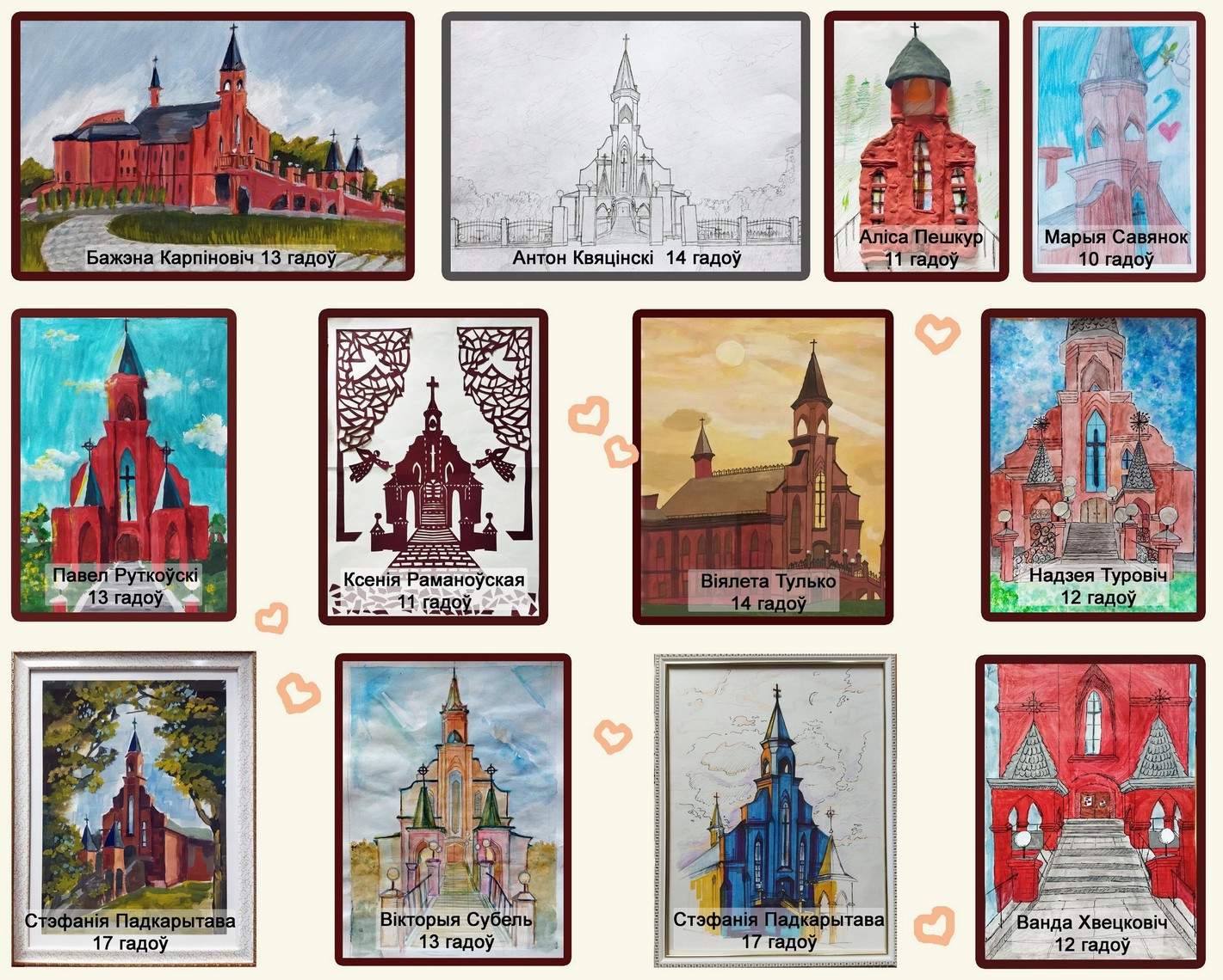 У асноўным былі жывапісныя работы, але таксама нашай увазе прадстаўлены графічныя работы, работа ў тэхніцы выцінакі і барэльеф, выкананы пластылінам. Цудоўна, што ўсе мы розныя і бачым нашу святыню па-свойму, у розных колерах і ракурсах. Усім нам падабаецца рознае. Але відавочна, што ёсць тое агульнае, што нас усіх яднае, і дзяцей, і дарослых, – а менавіта наша вера і наша любоў да гэтага месца, да касцёла.