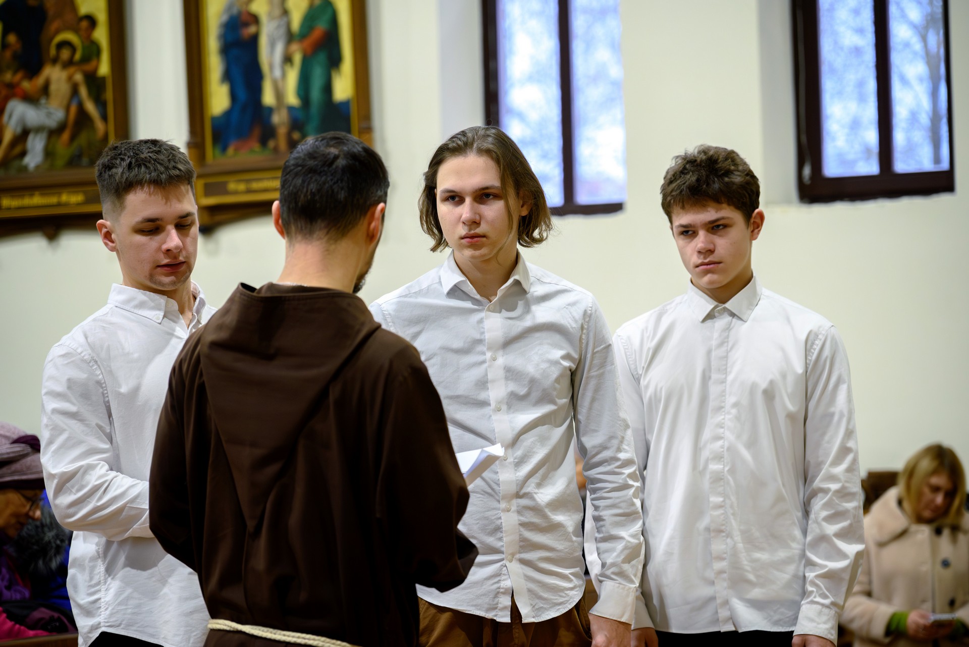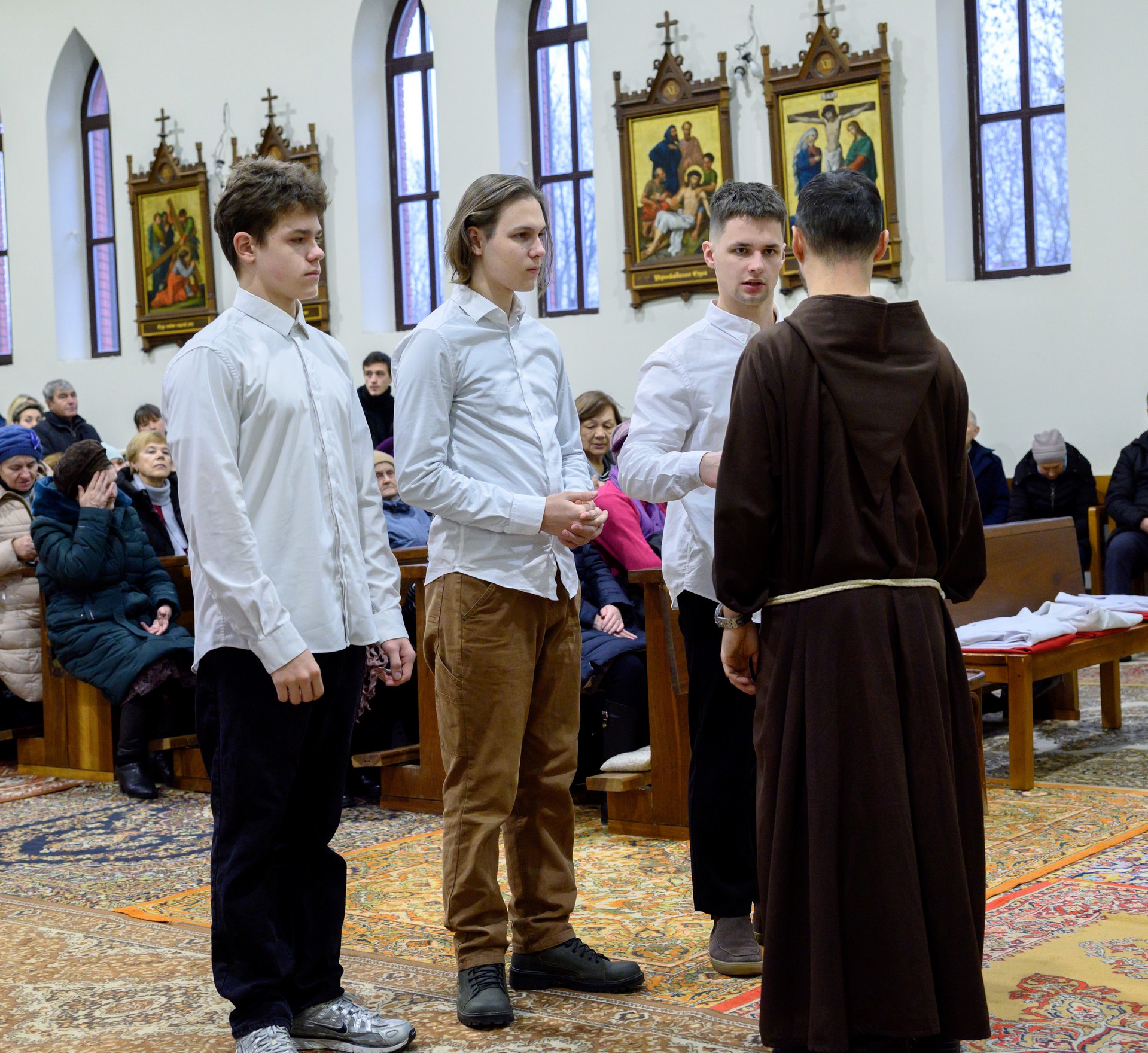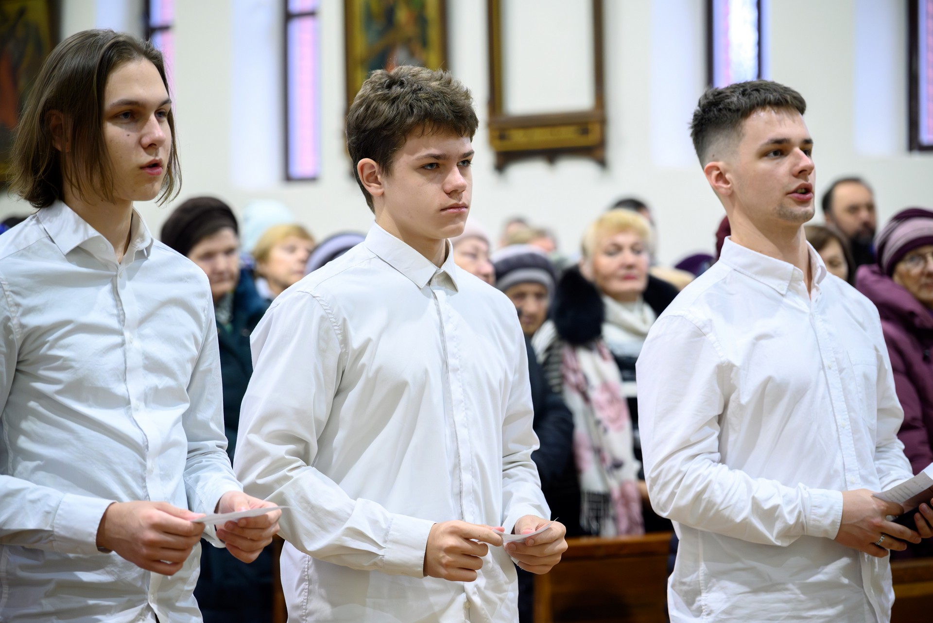 У нядзелю 24 лістапада прысутныя на св. Імшы а 10 гадзіне сталі сведкамі ўрачыстага пасвячэння трох юнакоў - Міхаіла Роўда, Канстанціна Каваленкі і Антона Савянка - у міністранты алтара. Вельмі прамаўляльна, што гэты хвалюючы крок у іх жыцці быў зроблены ва ўрачыстасць Пана Нашага Езуса Хрыста, Валадара Сусвету. Міністрант (з лацінскага "ministrare") азначае "служыць", "дапамагаць". Міністранты імкнуцца служыць Богу, дапамагаючы пры алтары. Гэтае сваё ўласнае трывалае жаданне хлапцы неаднойчы падцвярджалі на працягу некалькіх год. І вось у гэты асаблівы для іх дзень яны, склаўшы абяцанне выконваць паслугу міністранта алтара "пабожна, рупліва і радасна на Божую хвалу і для дабра парафіяльнай супольнасці", атрымалі на знак прыналежнасці да гэтай ступені паслугі чырвоныя сутаны.