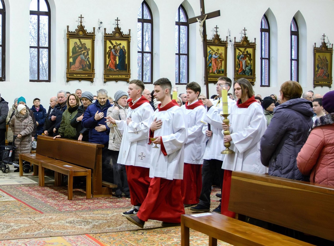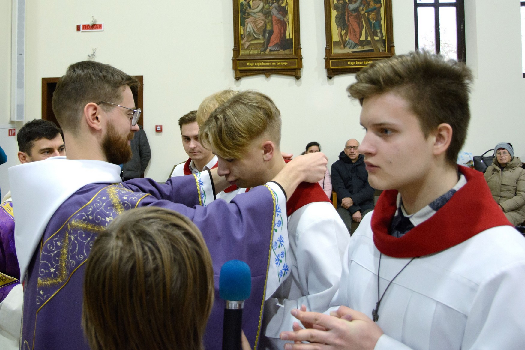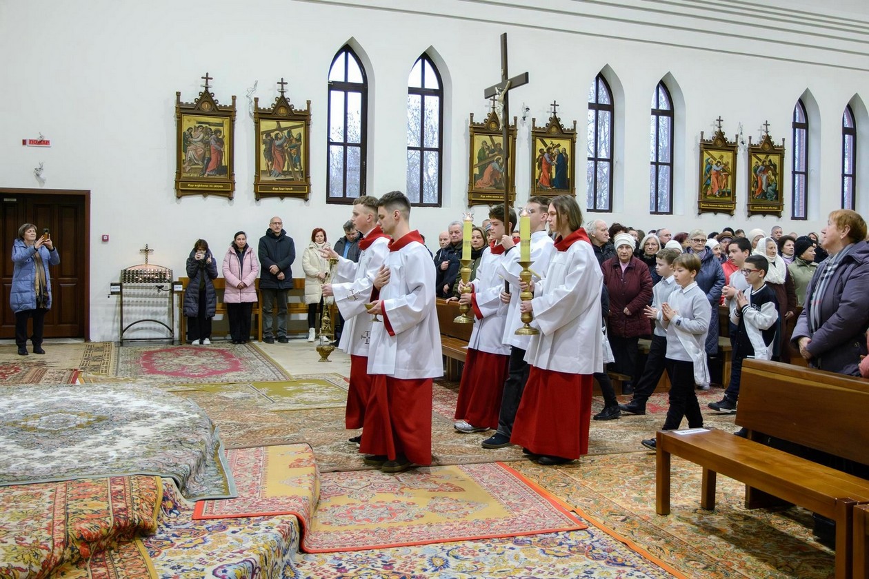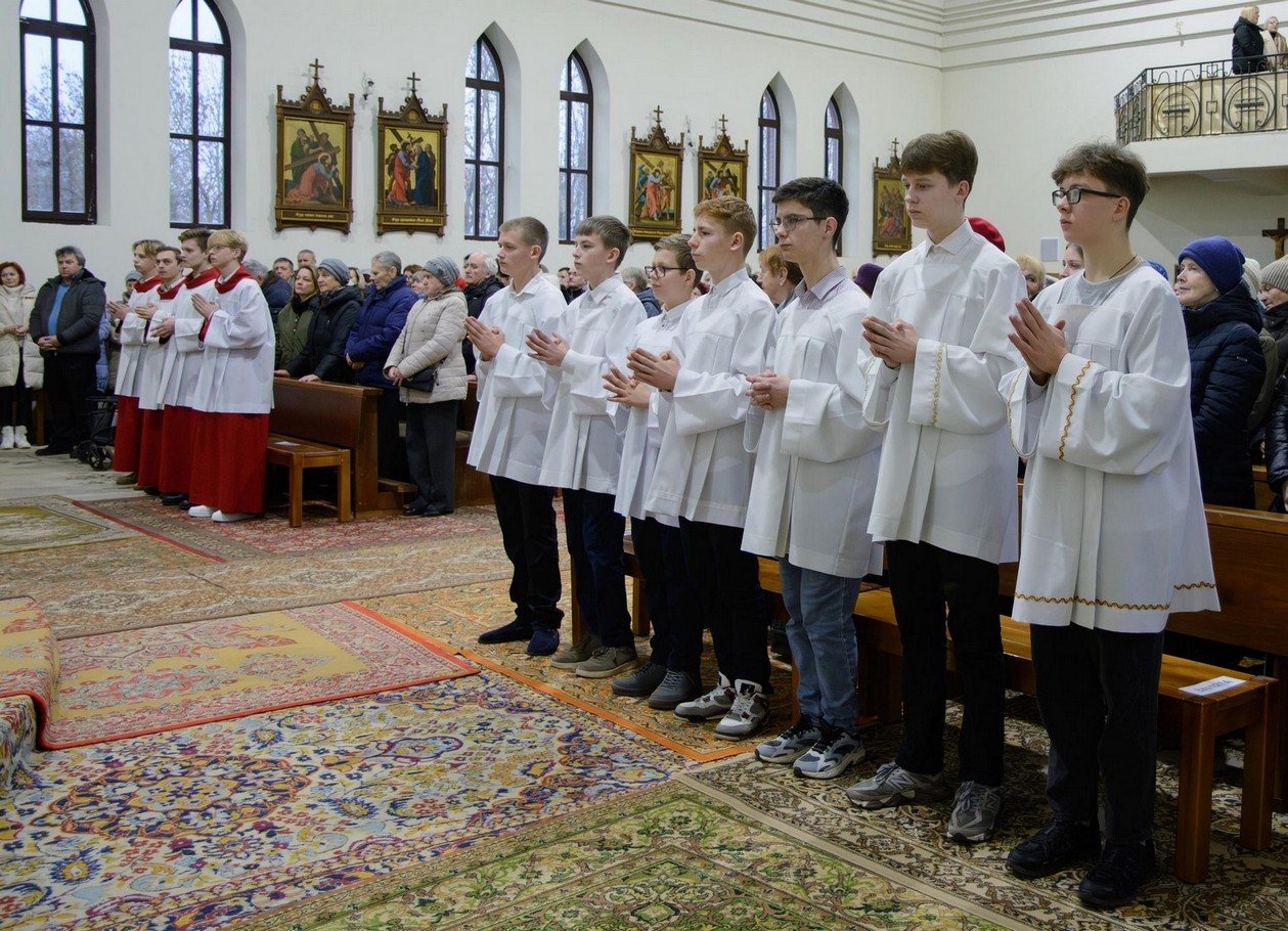 Перад Богам і сабраным людам хлопцы ўрачыста склалі свае абяцанні і з рук пробашча брата Уладзіслава Мінько атрымалі знакі прыналежнасці да сваёй новай ступені служэння: для новапрызначаных міністрантаў святла імі з'яўляюцца белыя палярыны, а для міністрантаў кнігі - крыжы, якія падчас Імшы яны будуць насіць паверх комжы.