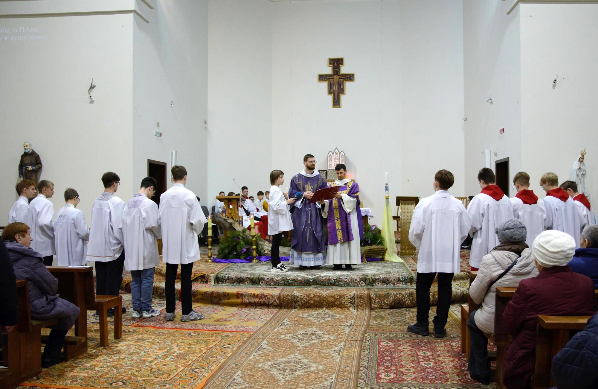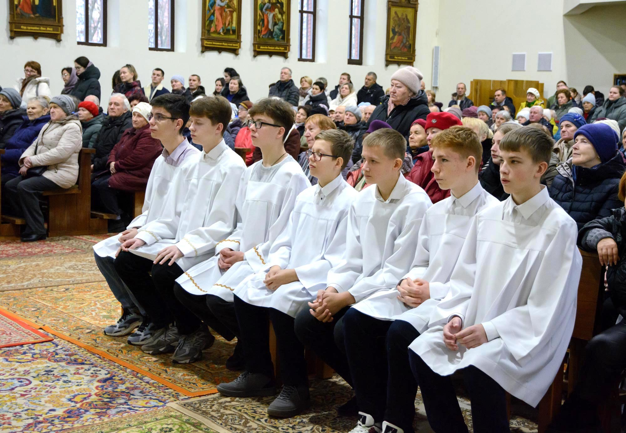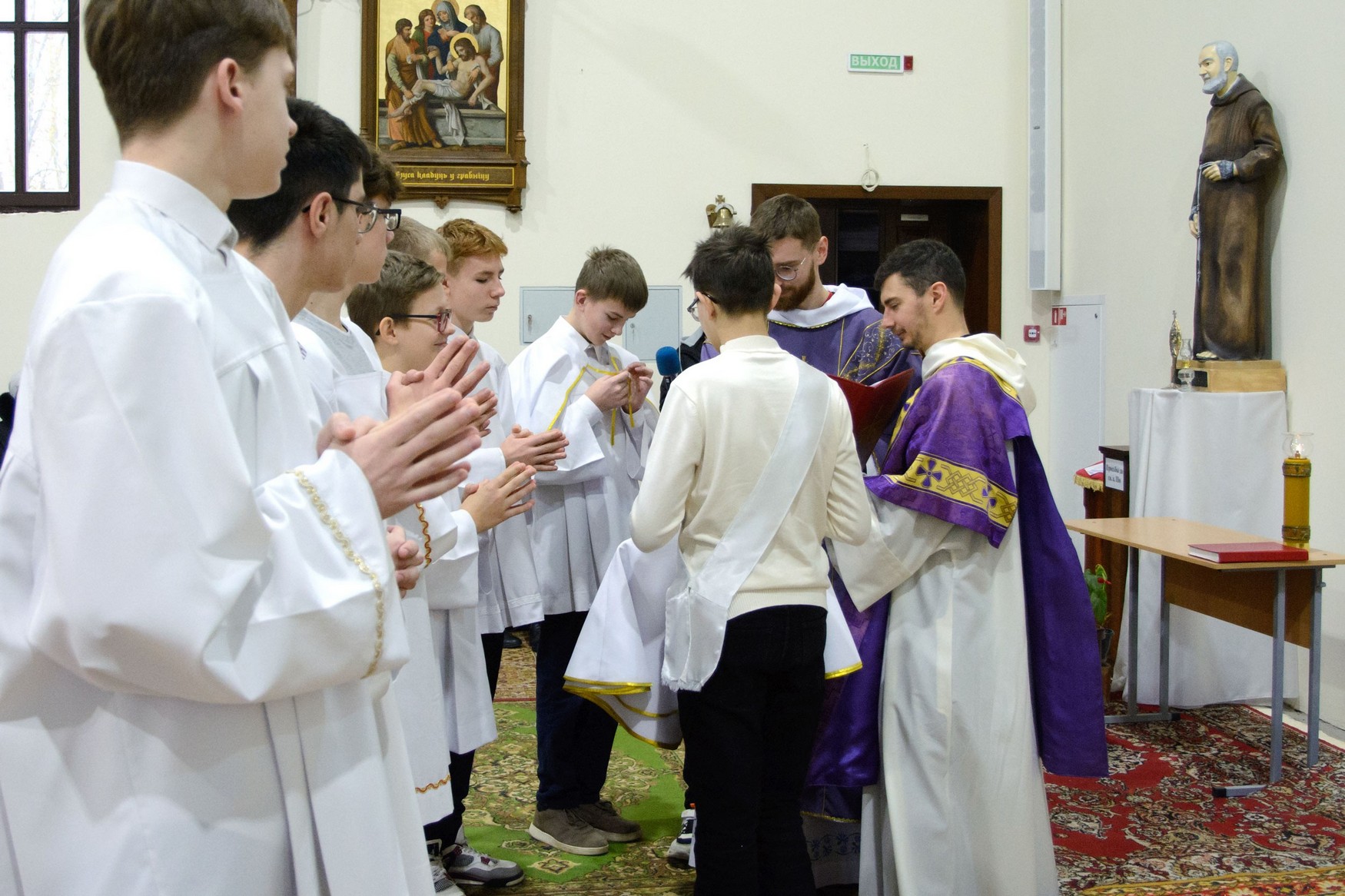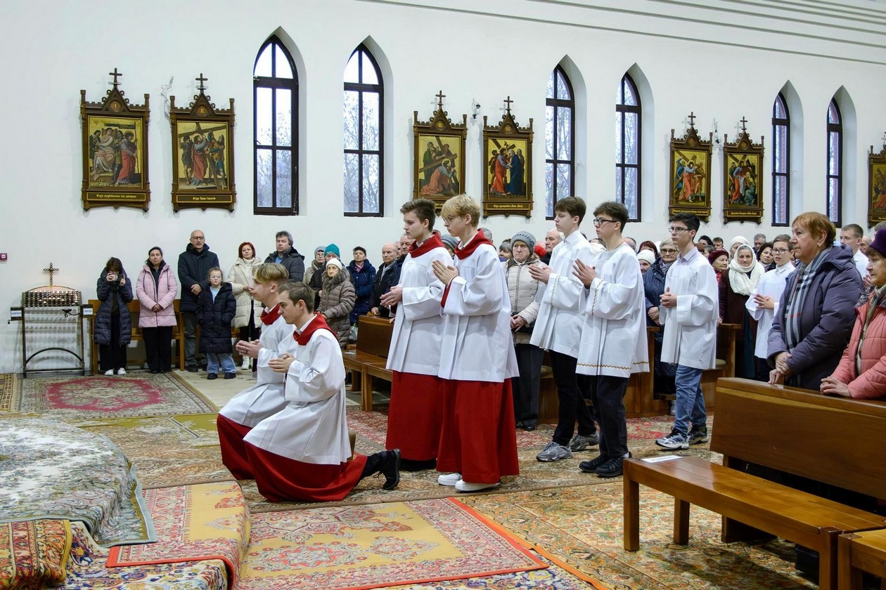 Адразу адзінаццаць хлопцаў, пасля адпаведнай падрыхтоўкі, атрыманай пад кіраўніцтвам братоў капуцынаў, перайшлі на новыя ступені міністранцкага служэння: чацвёра (Цімафей Савянок, Мацвей Вяжэвіч, Якаў Дасюкевіч, Дамінік-Антоній Гаранін) сталі Міністрантамі Кнігі; сямёра (Арцём Гурштыновіч, Андрэй Стрэж, Кірыл Касяк, Канстанцін Губко, Уладзіслаў Астравушка, Яўген Апанэль, Ігар Лапата) - Міністрантамі Святла (падрабязней пра функцыі кожнай ступені міністранцкай паслугі можна прачытаць у артыкуле з мінулага тыдня).