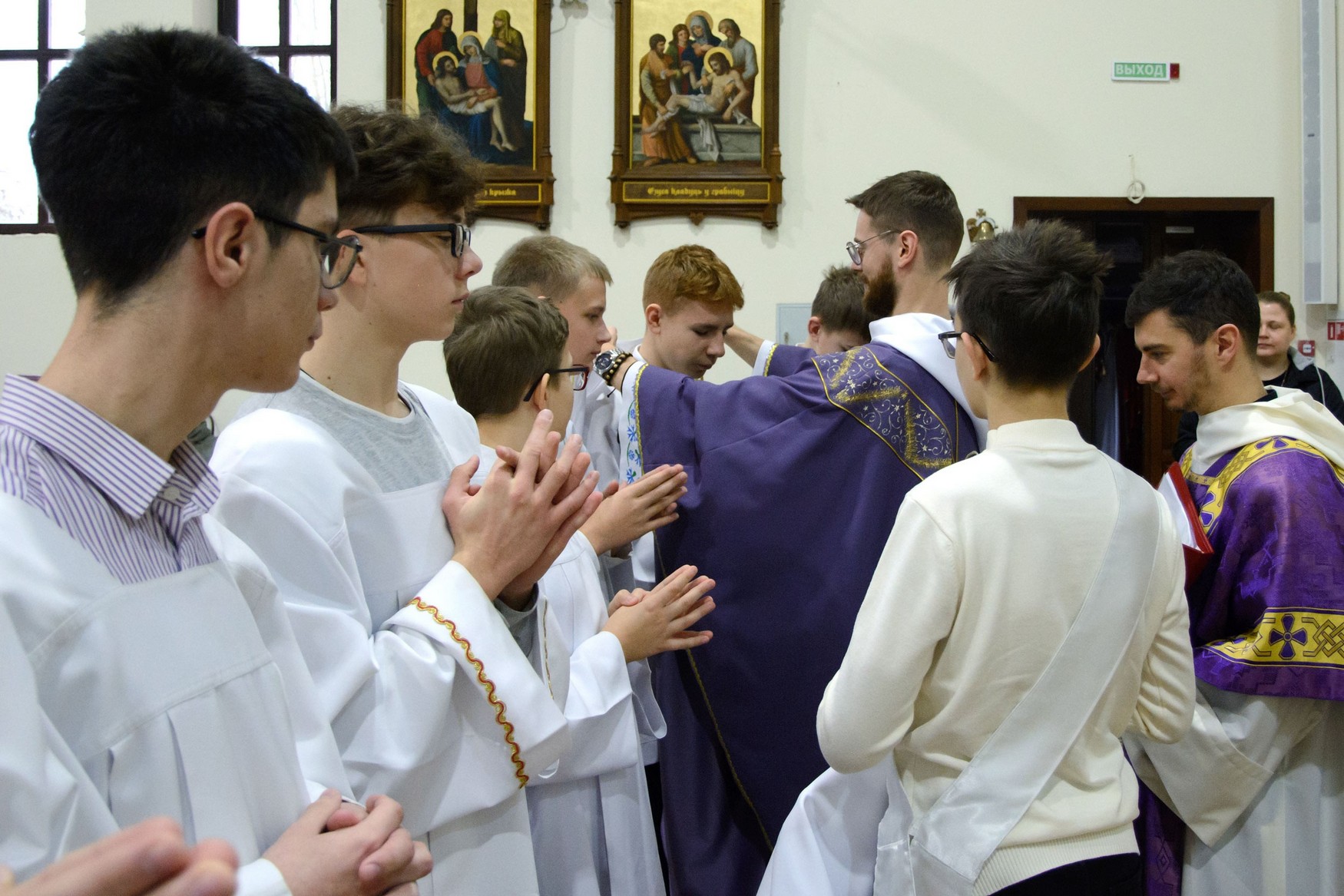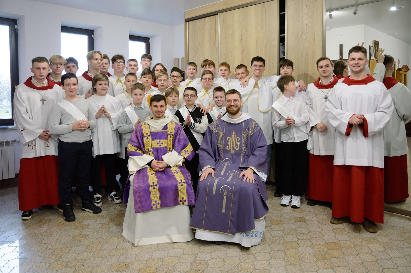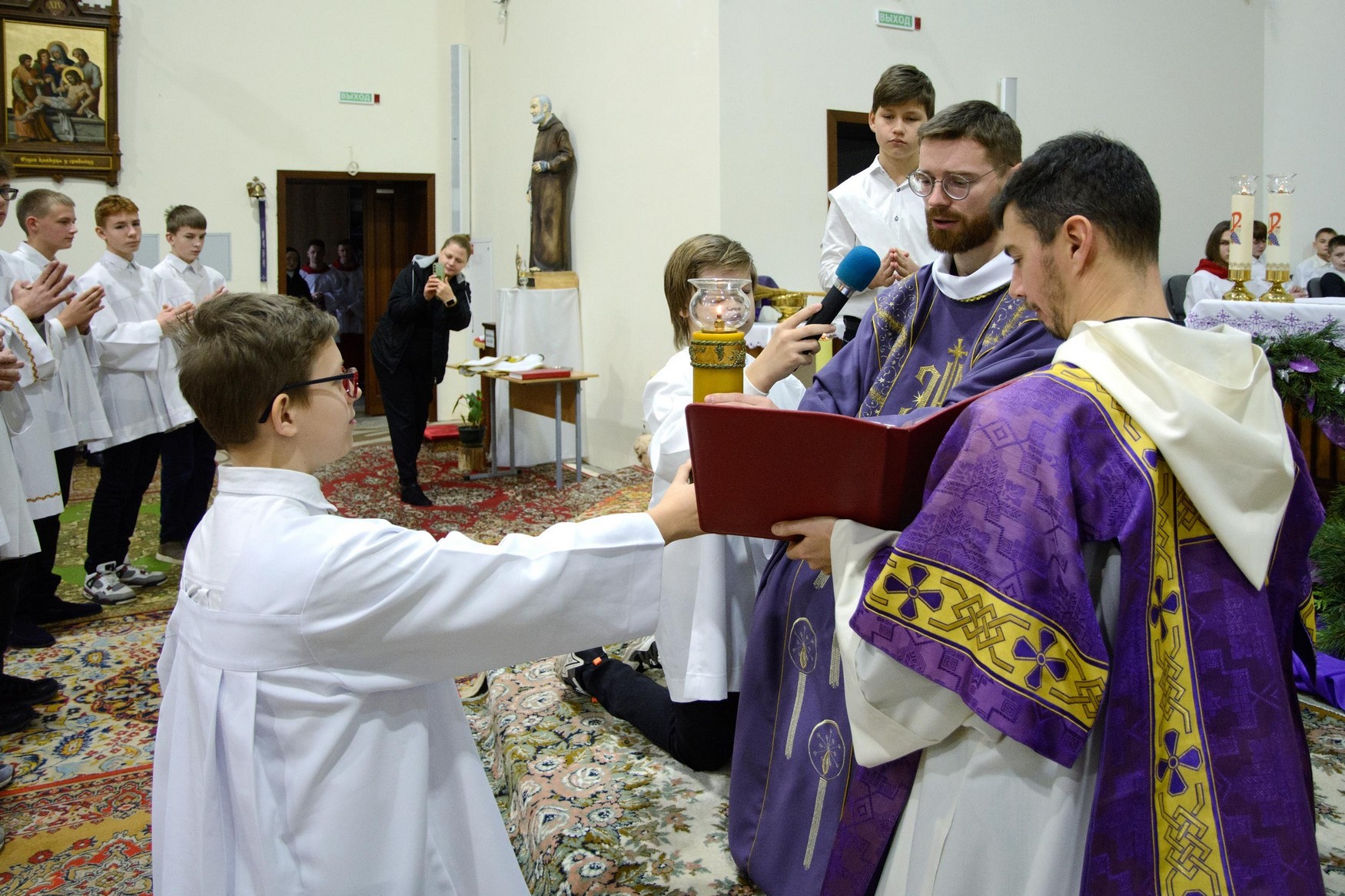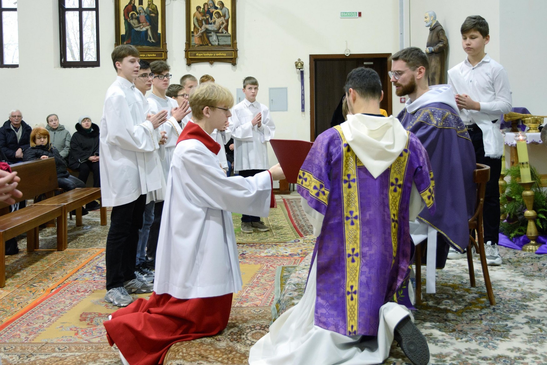 Адразу адзінаццаць хлопцаў, пасля адпаведнай падрыхтоўкі, атрыманай пад кіраўніцтвам братоў капуцынаў, перайшлі на новыя ступені міністранцкага служэння: чацвёра (Цімафей Савянок, Мацвей Вяжэвіч, Якаў Дасюкевіч, Дамінік-Антоній Гаранін) сталі Міністрантамі Кнігі; сямёра (Арцём Гурштыновіч, Андрэй Стрэж, Кірыл Касяк, Канстанцін Губко, Уладзіслаў Астравушка, Яўген Апанэль, Ігар Лапата) - Міністрантамі Святла (падрабязней пра функцыі кожнай ступені міністранцкай паслугі можна прачытаць у артыкуле з мінулага тыдня).