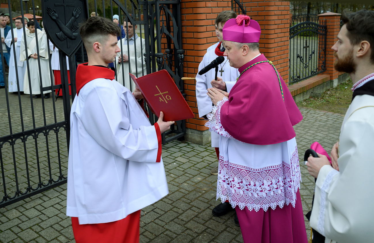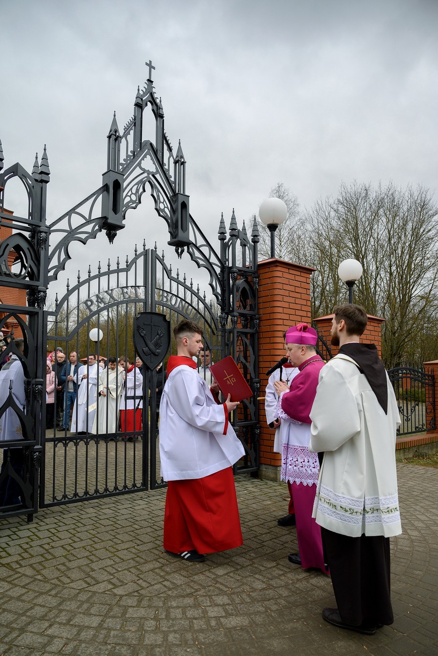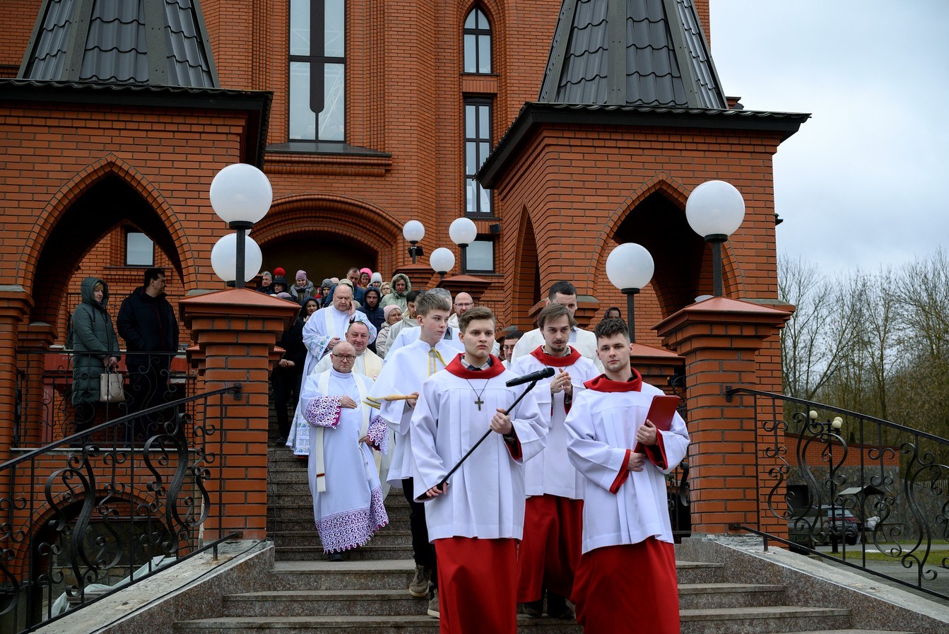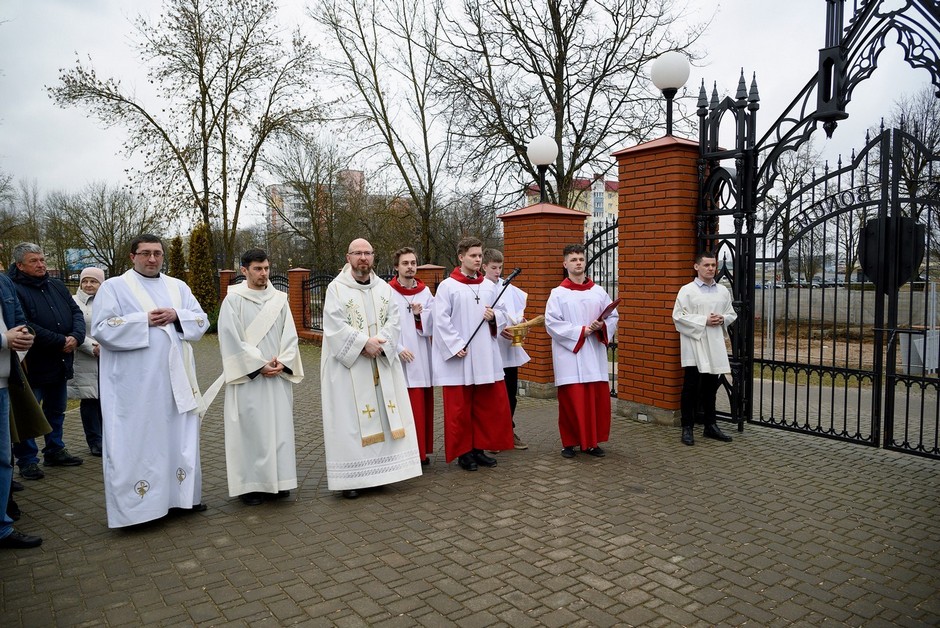 Літургія распачалася з малітвы на вуліцы каля новай касцёльнай брамы. Біскуп Андрэй паблагаславіў вароты, "каб усе, хто праз іх згодна з Божай воляй будзе праходзіць, верна ішлі за голасам Хрыста, які абвяшчае: “Я - брама вечнага жыцця”, каб знайшлі пашы жыцця і былі збаўлены, каб умацоўваліся ў веры, памнажаліся ў колькасці і святасці для збудаваня Нябеснага Ерузалема".