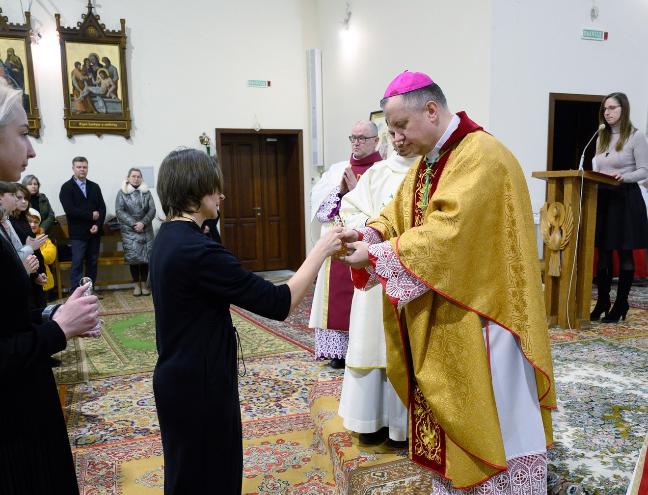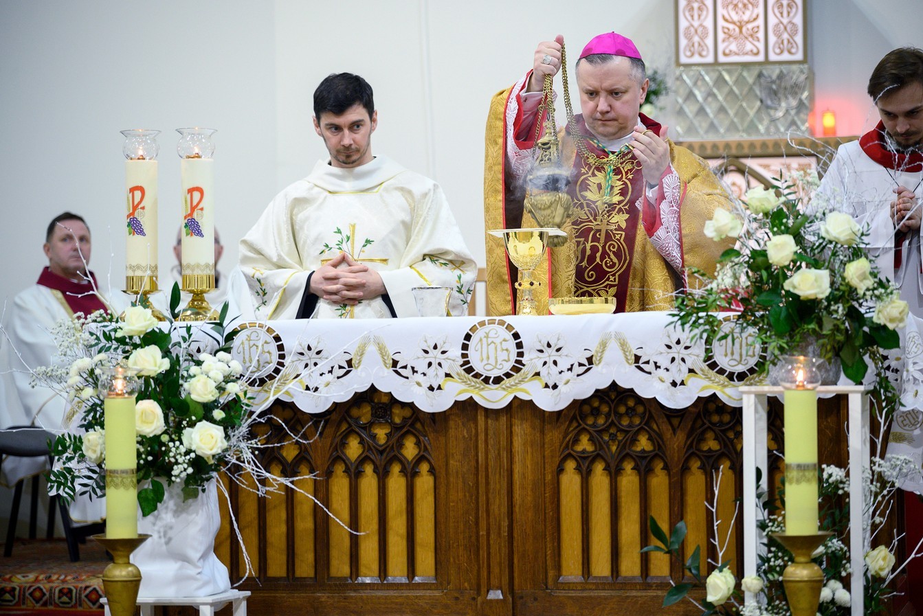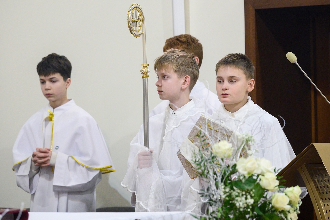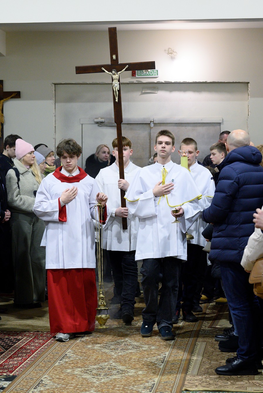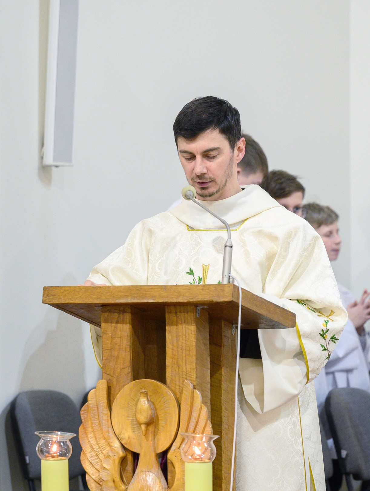 Ва ўступным слове Яго Эксцэленцыя перадаў словы прывітання Арцыбіскупа Юзэфа Станеўскага, таксама з вялікай цеплынёй успомніў час велікапосных рэкалекцый, якія ён праводзіў у нашай парафіі год таму, калі яшчэ не быў біскупам, але нагадаў, што вернікі сабраліся тут, у святыні, не толькі для таго, каб пабачыцца адны з другімі і прывітаць біскупа, а найперш для сустрэчы з Богам: “У гэтым месцы толькі Яму паклон, толькі Яму слава”.