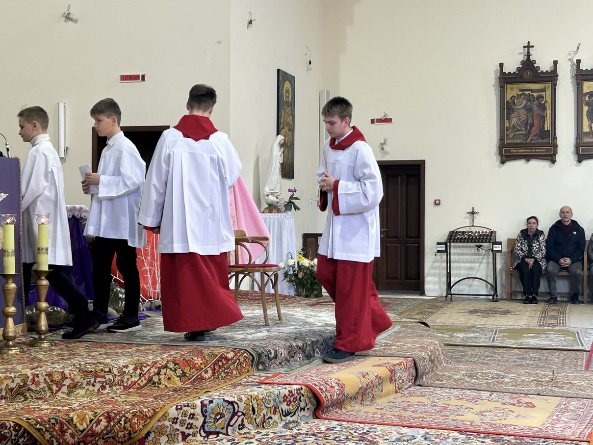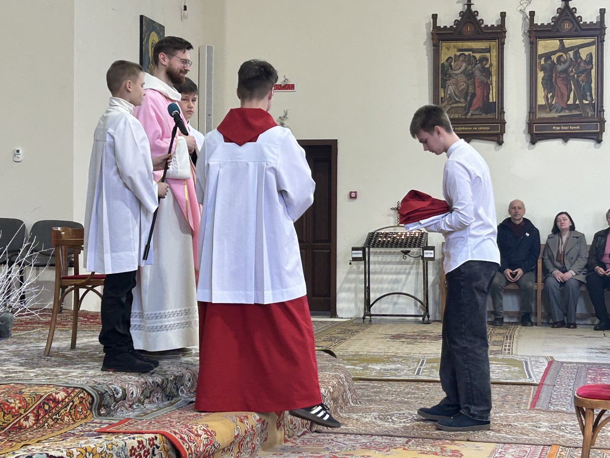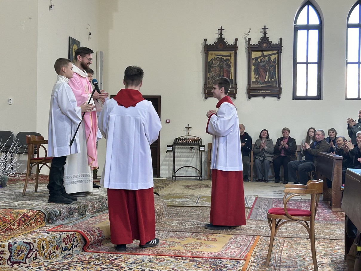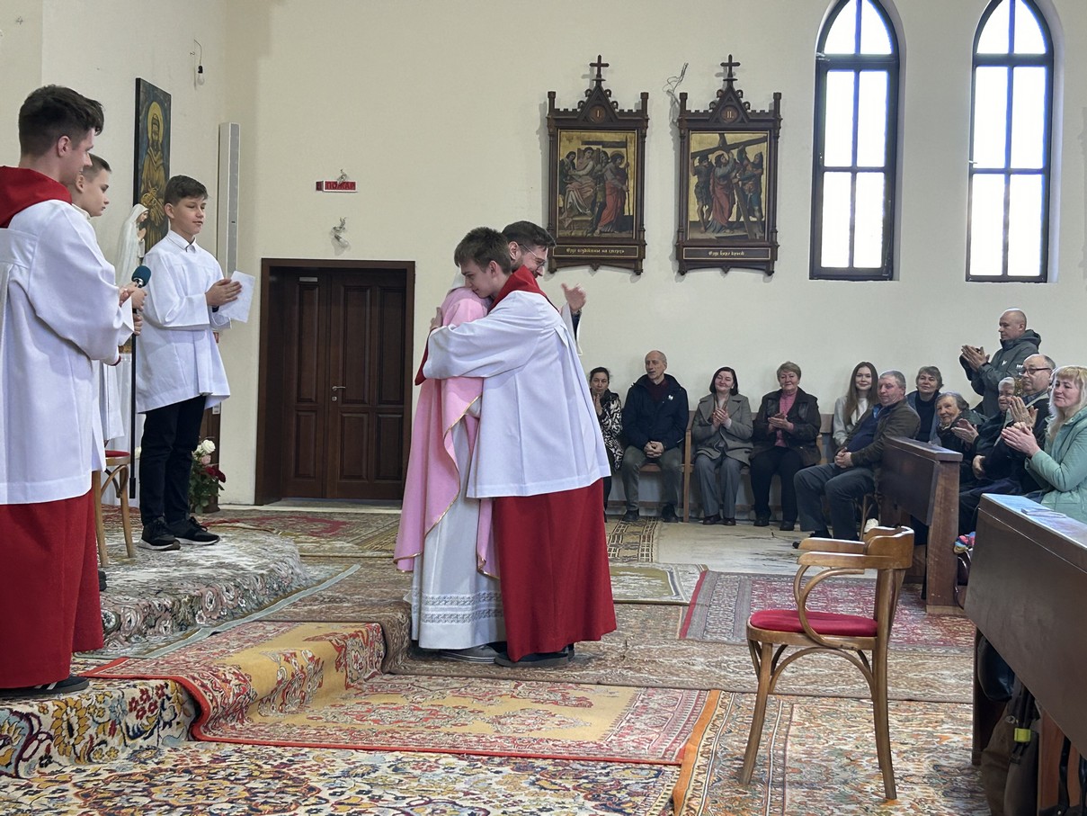 У нядзелю 30 сакавіка падчас Імшы а 10 гадзіне літургічная служба парафіі атрымала яшчэ аднаго міністранта алтара: пасля паспяховага завяршэння адпаведнага курсу заняткаў да гэтага стану быў прыняты Мікіта Хамякоў. Сваё жаданне сумленна служыць пры алтары Мікіта пацвердзіў складзеным перад усёй супольнасцю касцёла абяцаннем. На знак прыняцця новай міністранцкай ступені служэння Мікіта атрымаў чырвоную сутану.