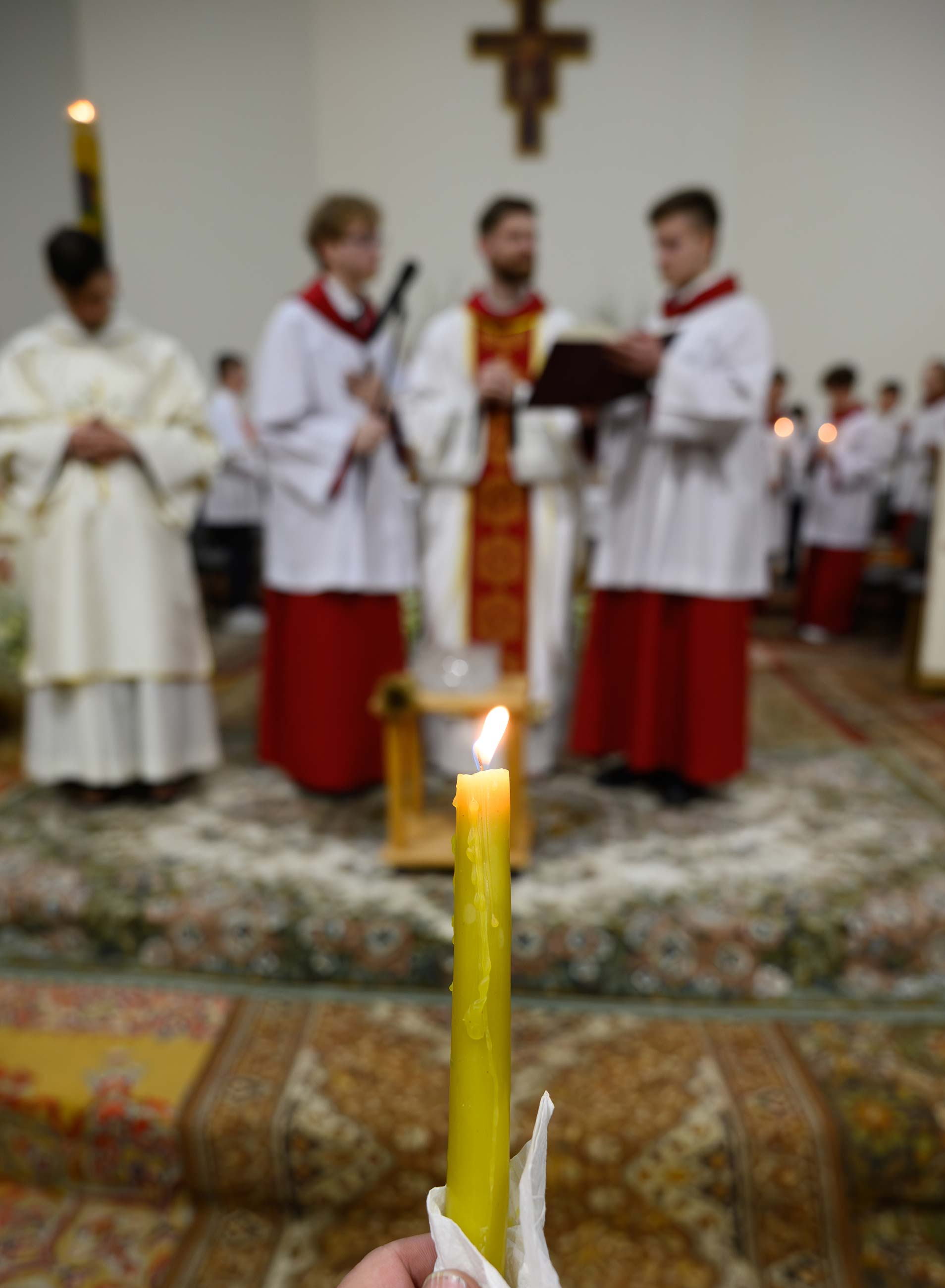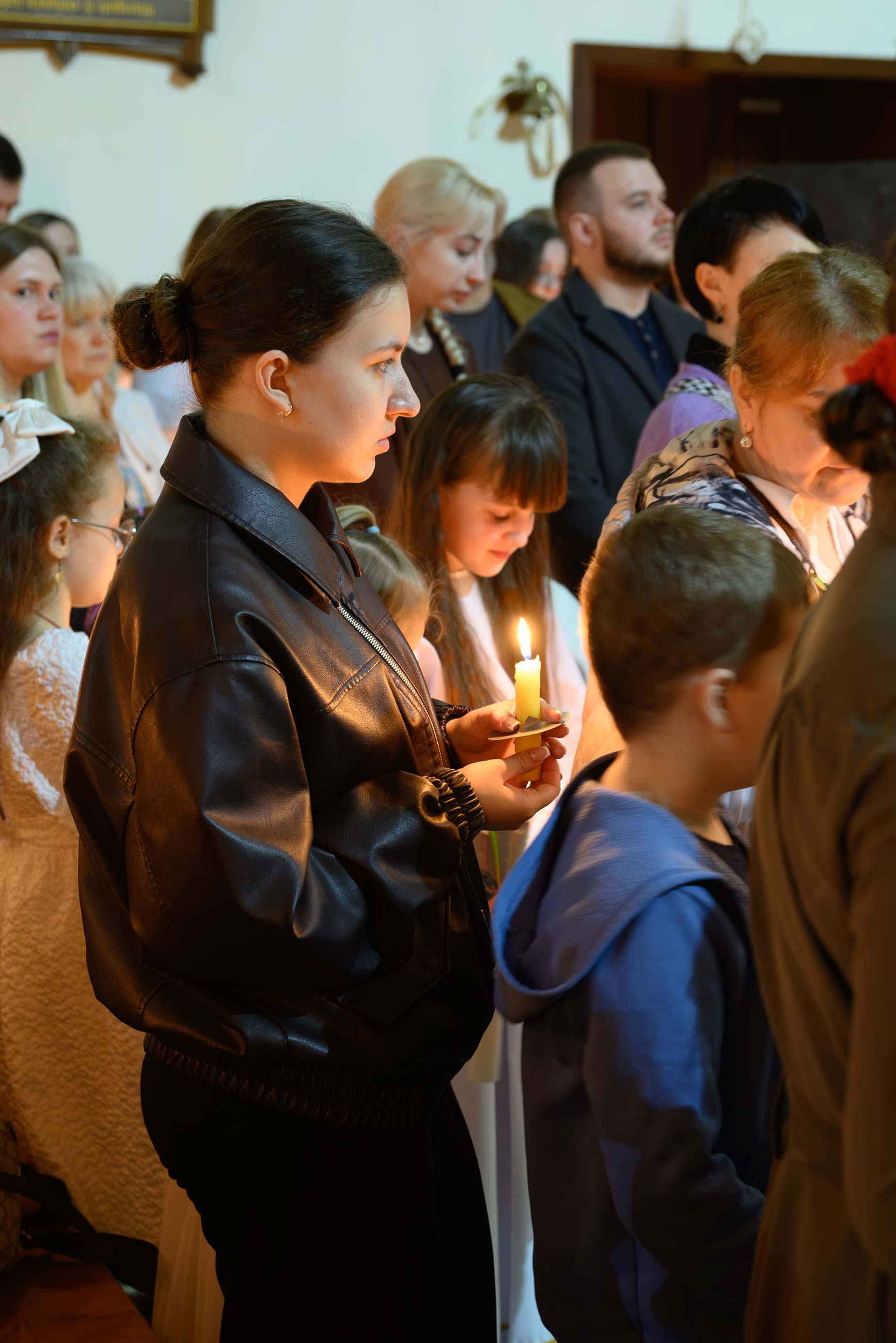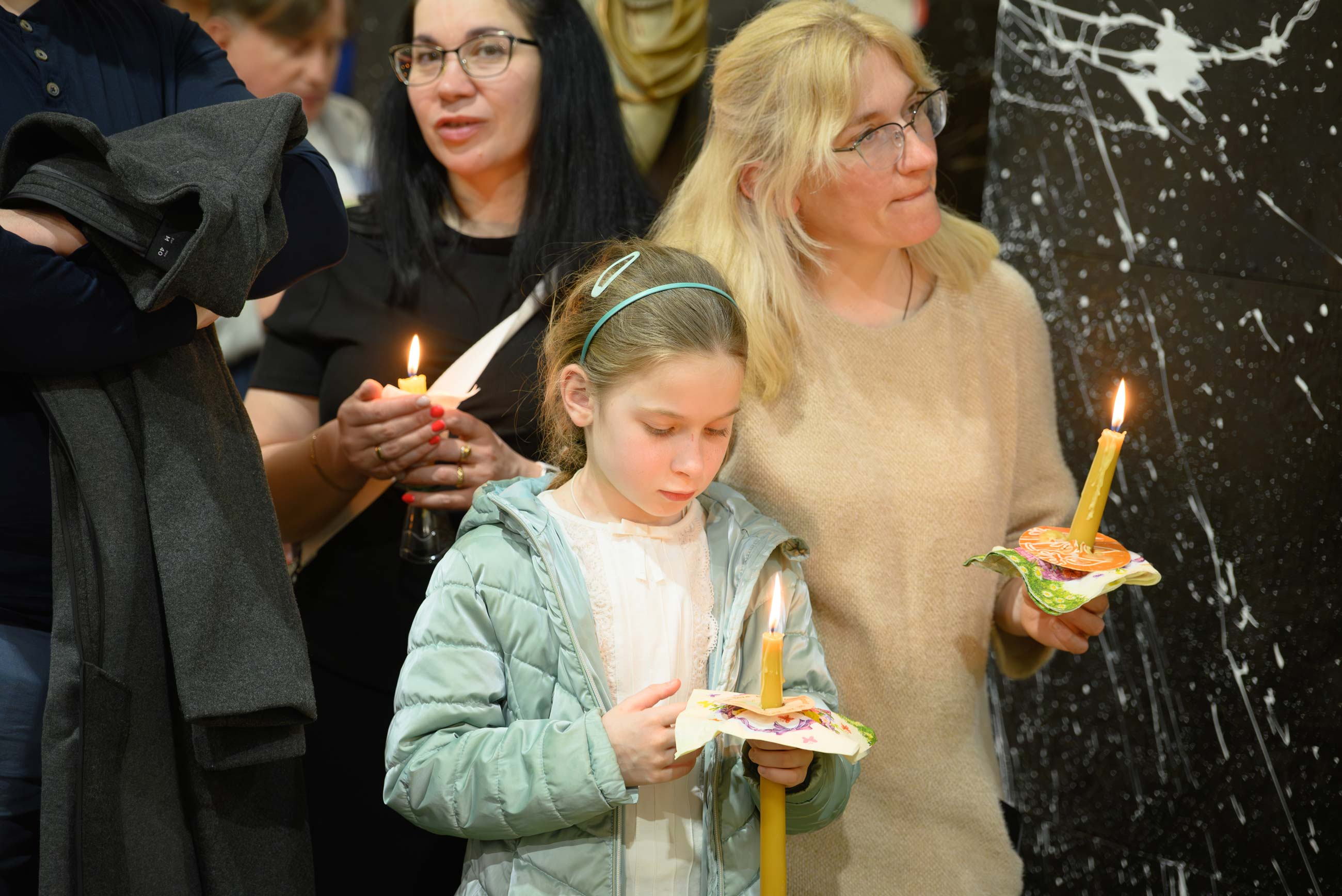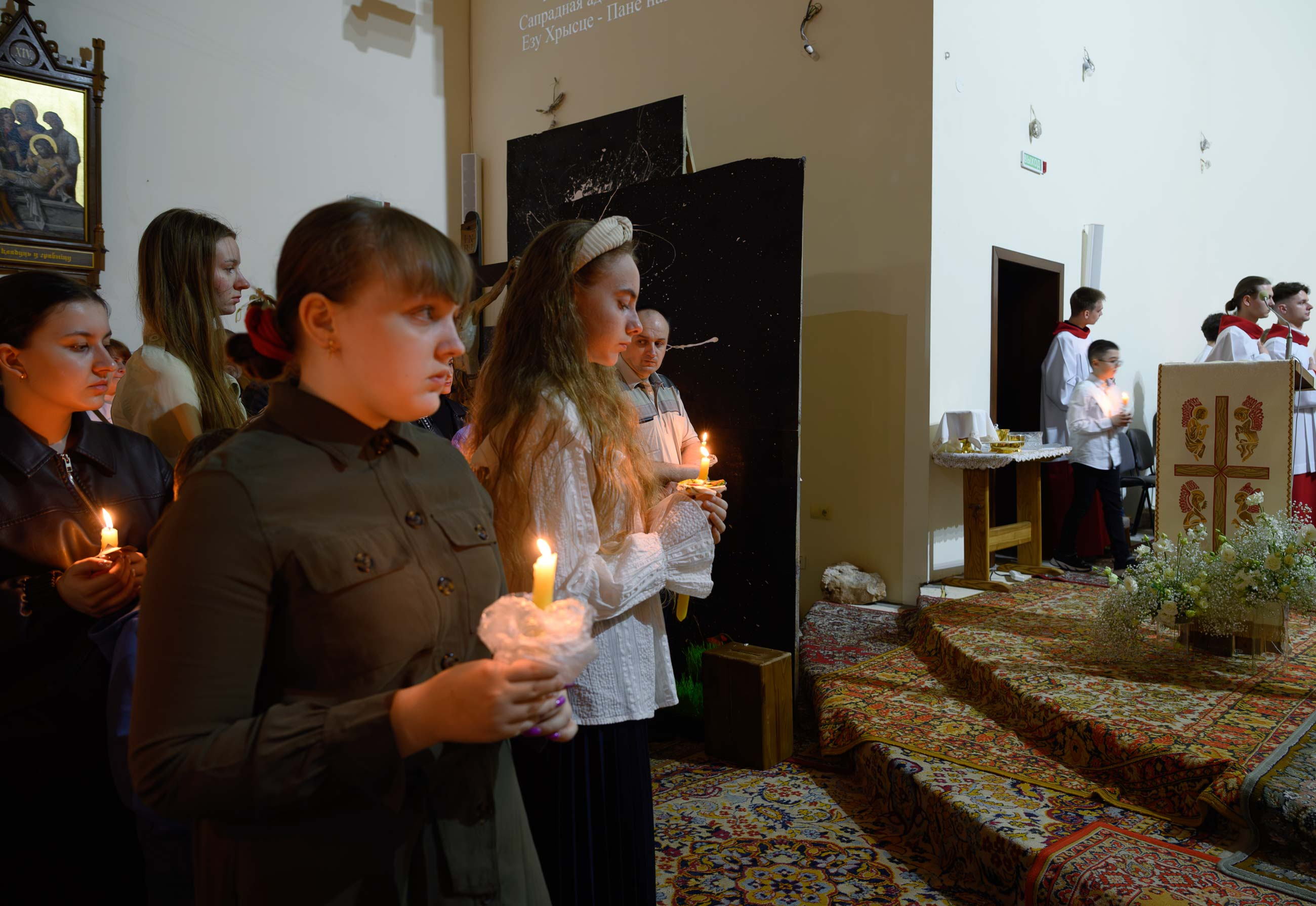 А 23 гадзіне распачалася самая галоўная Эўхарыстыя літургічнага года – Пасхальная Вігілія. У перакладзе з лацінскай мовы “вігілія” азначае “чуванне”. Вернікі сабраліся, каб разам чакаць змертвыхпаўстання Хрыста.