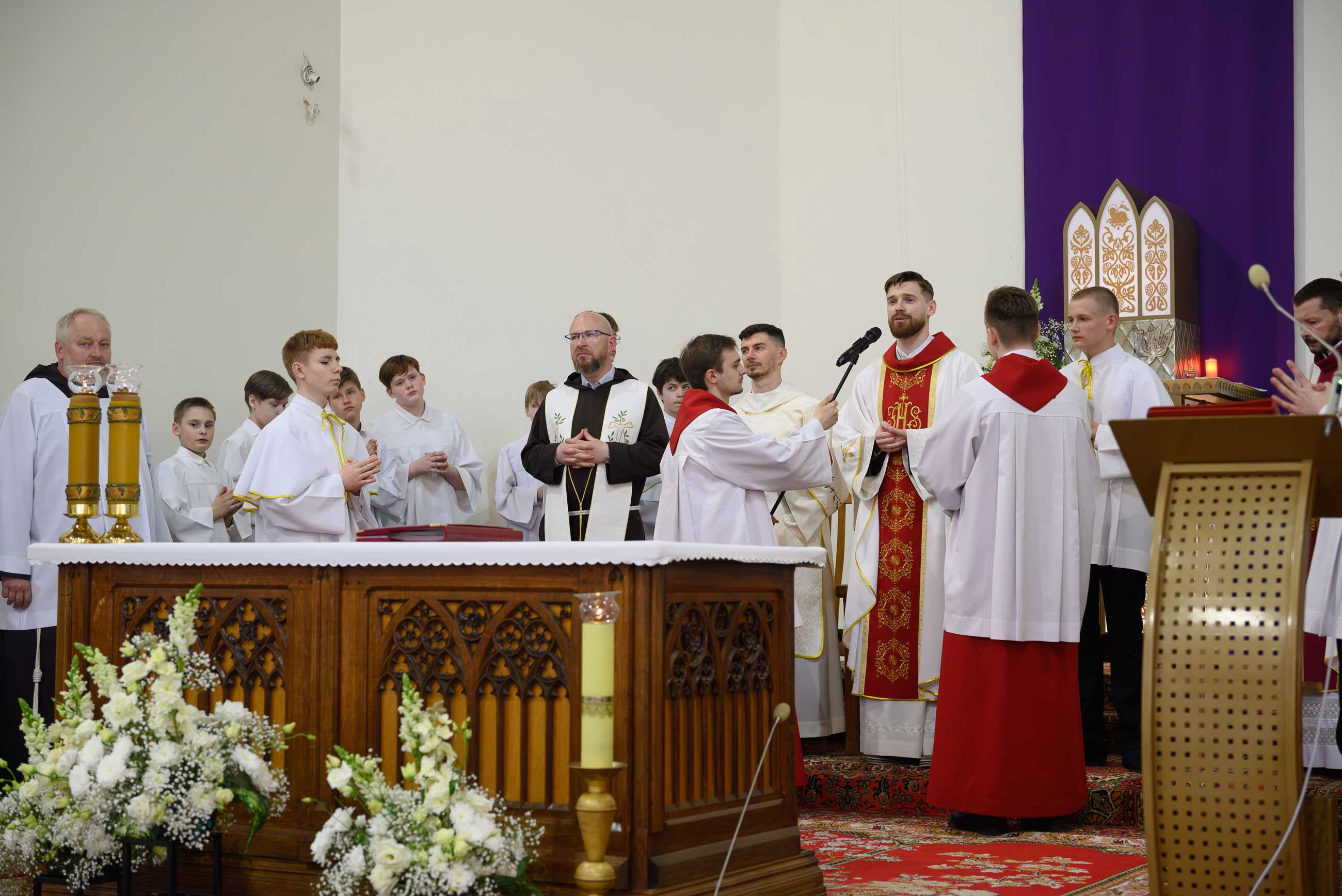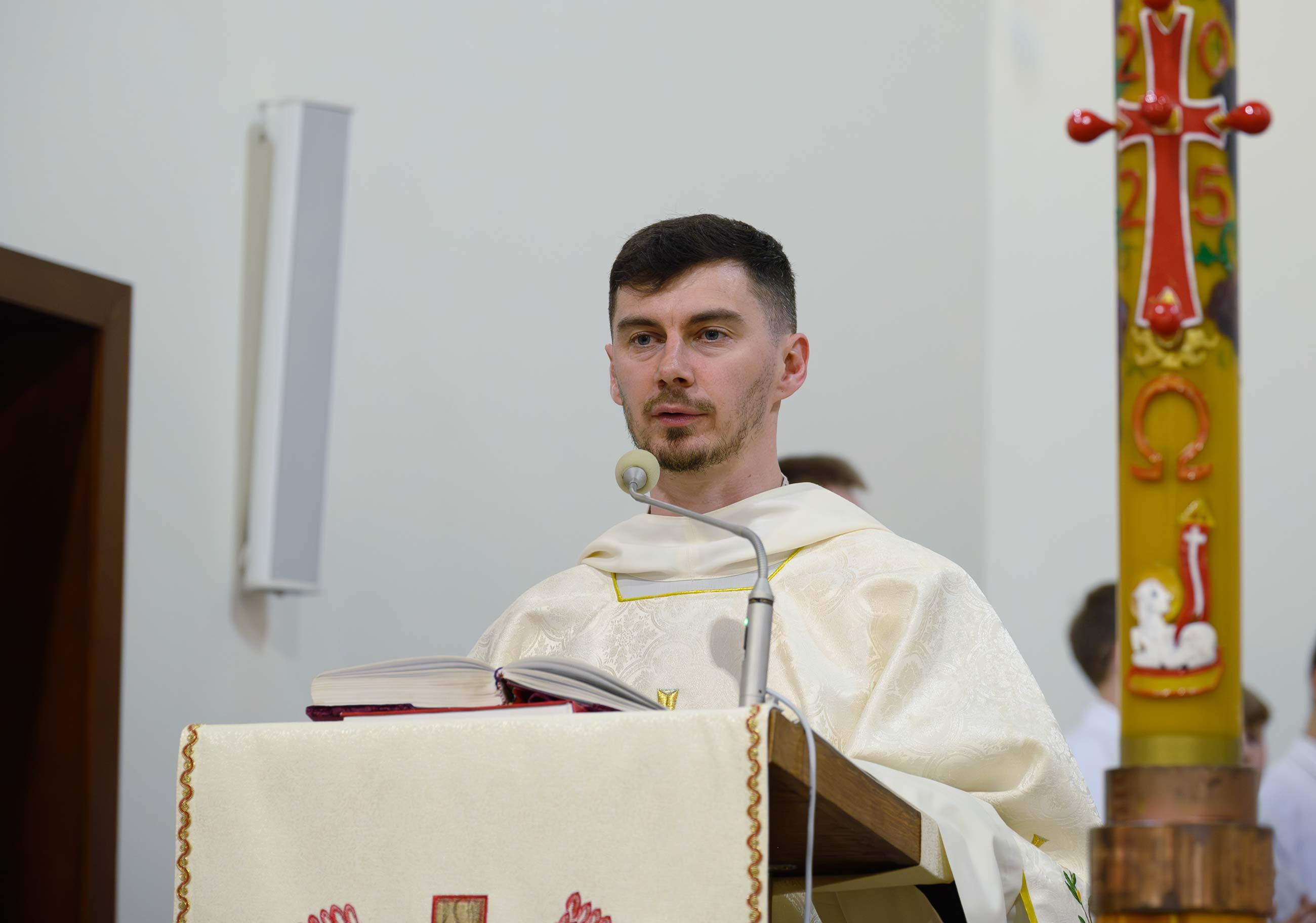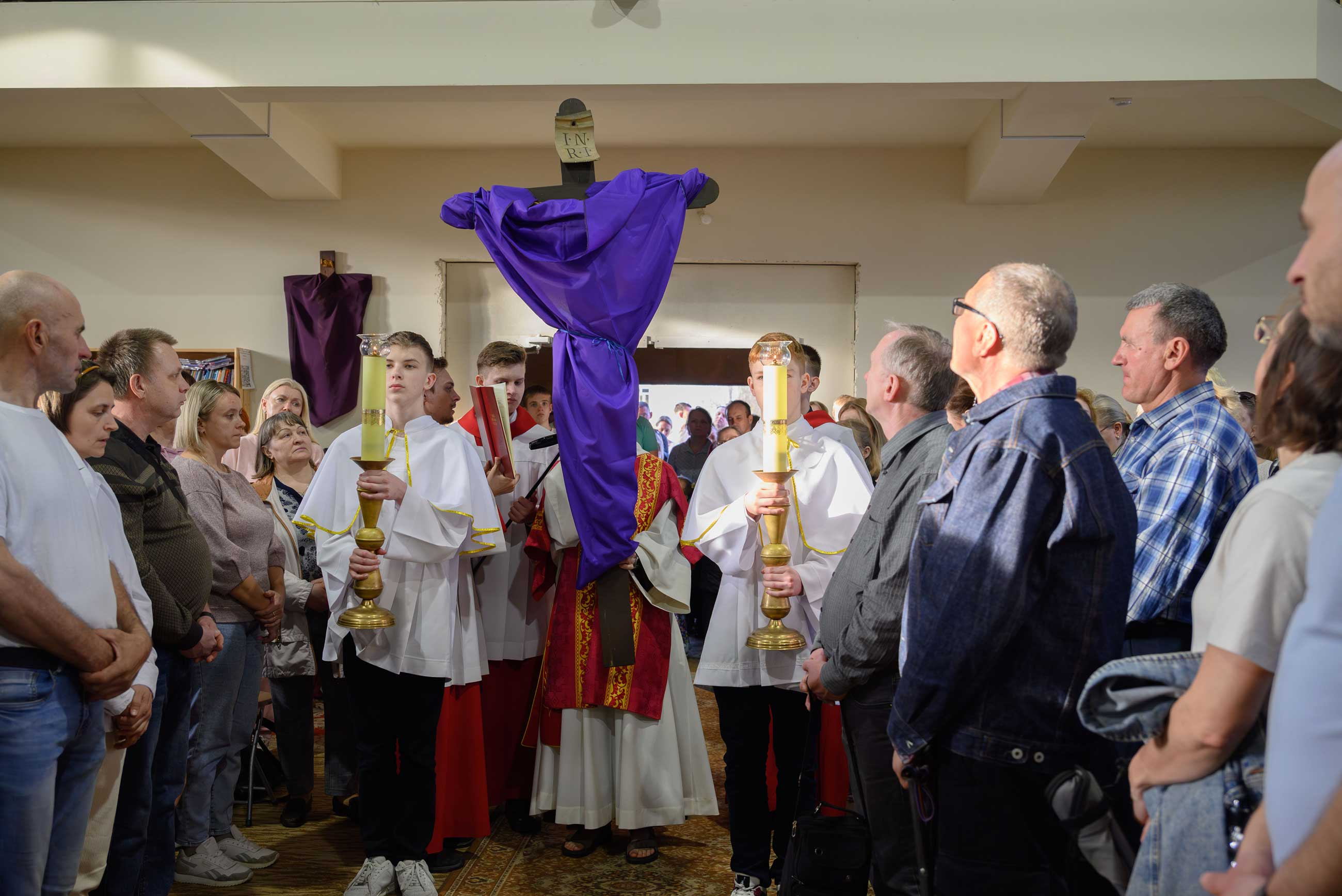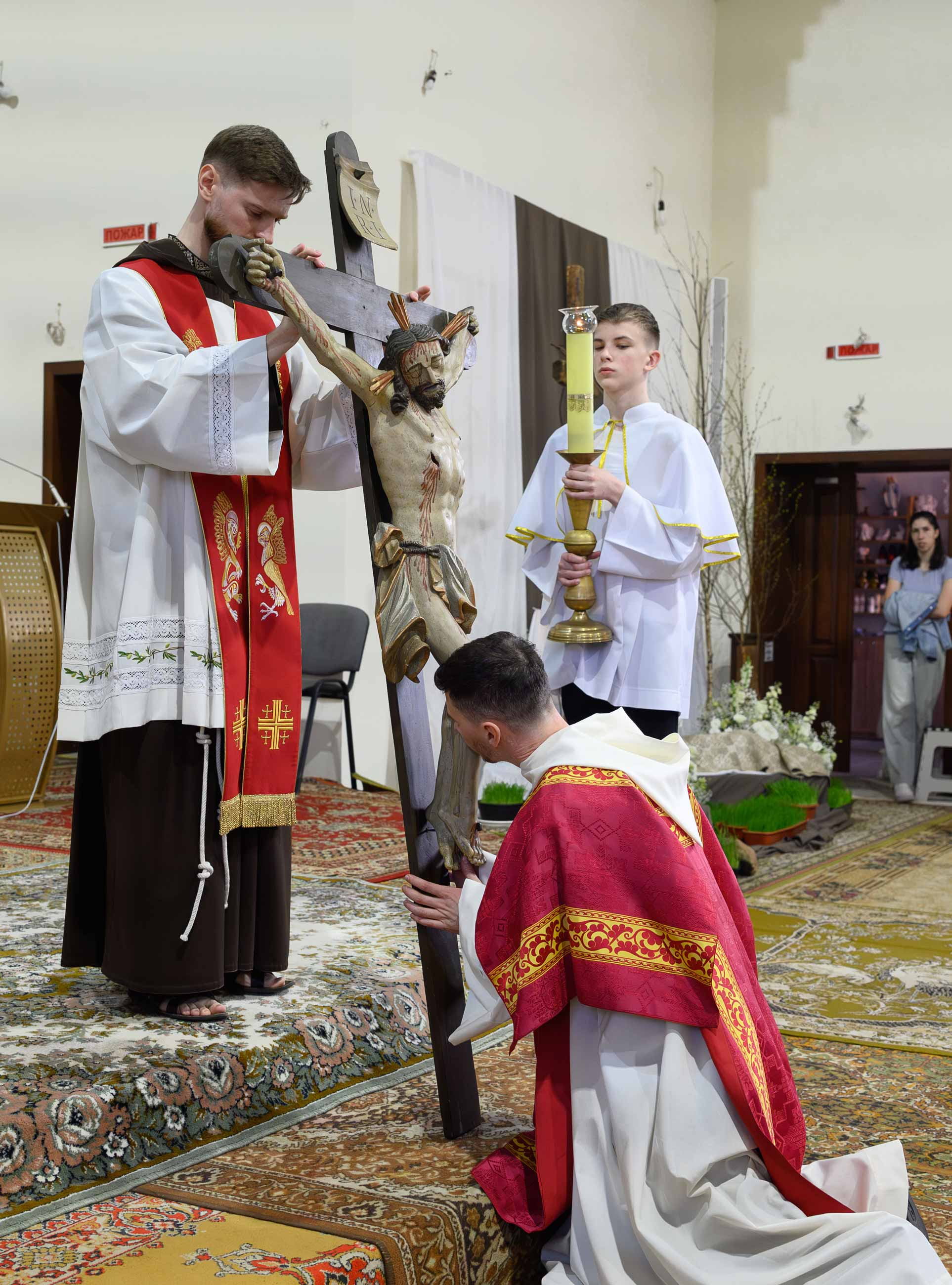 “Прыгожы і таямнічы момант, калі пасля слоў, што Езус сканаў, мы ўленчваем і заховаем цішыню, - заўважыў бр. Сяргей у пачатку гаміліі і запрасіў падумаць, чаму пасля смерці Езуса на Галгоце Марыя і Ян, якія там стаяць, захоўваюць цішыню, не галосяць. У гэтым маўклівым іх трыванні можна зразумець іх веру ў тое, што менавіта дзеля гэтага моманту Езус і прыйшоў на зямлю, што гэта Яго жаданне, і што ўсё ідзе згодна з Божым планам.