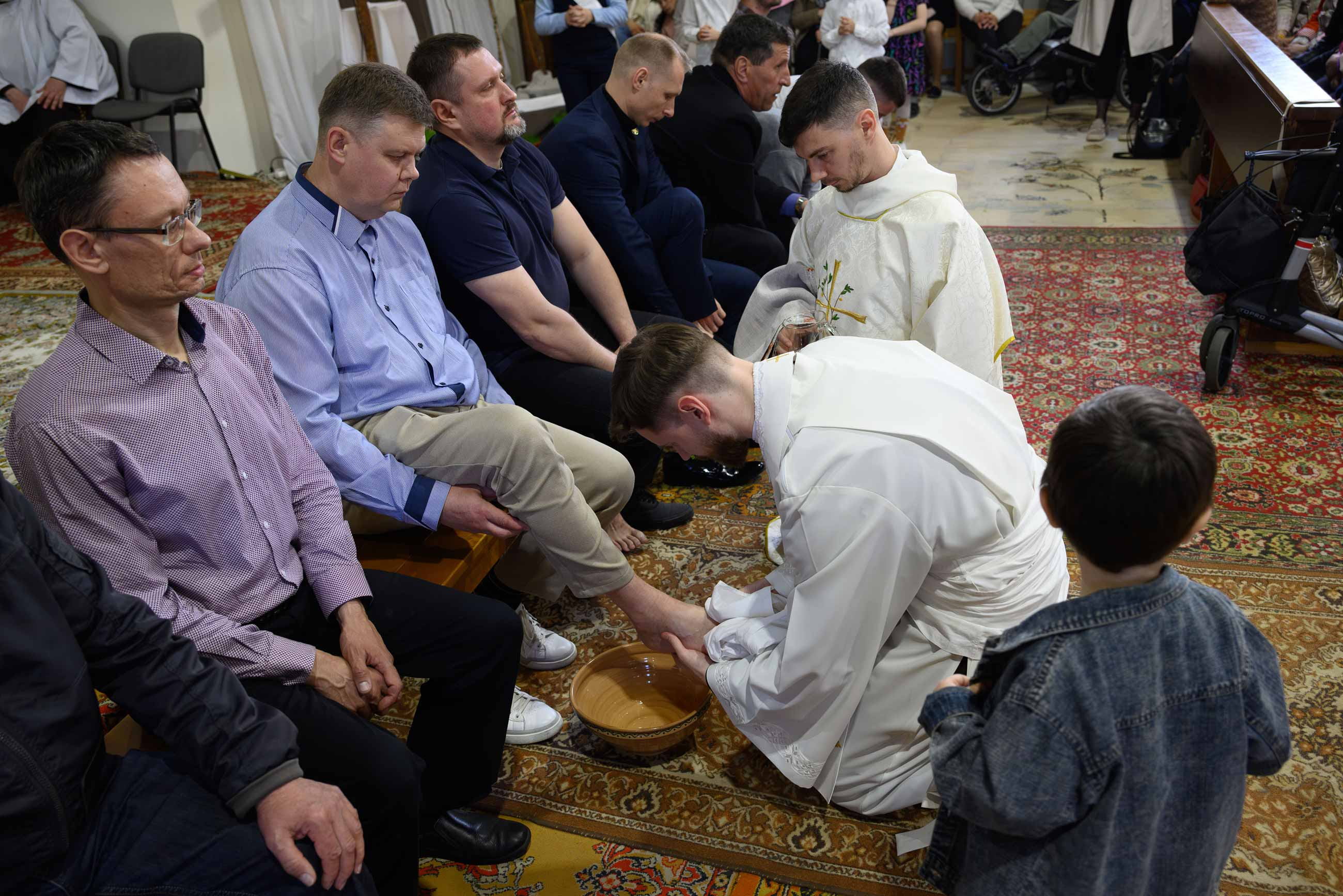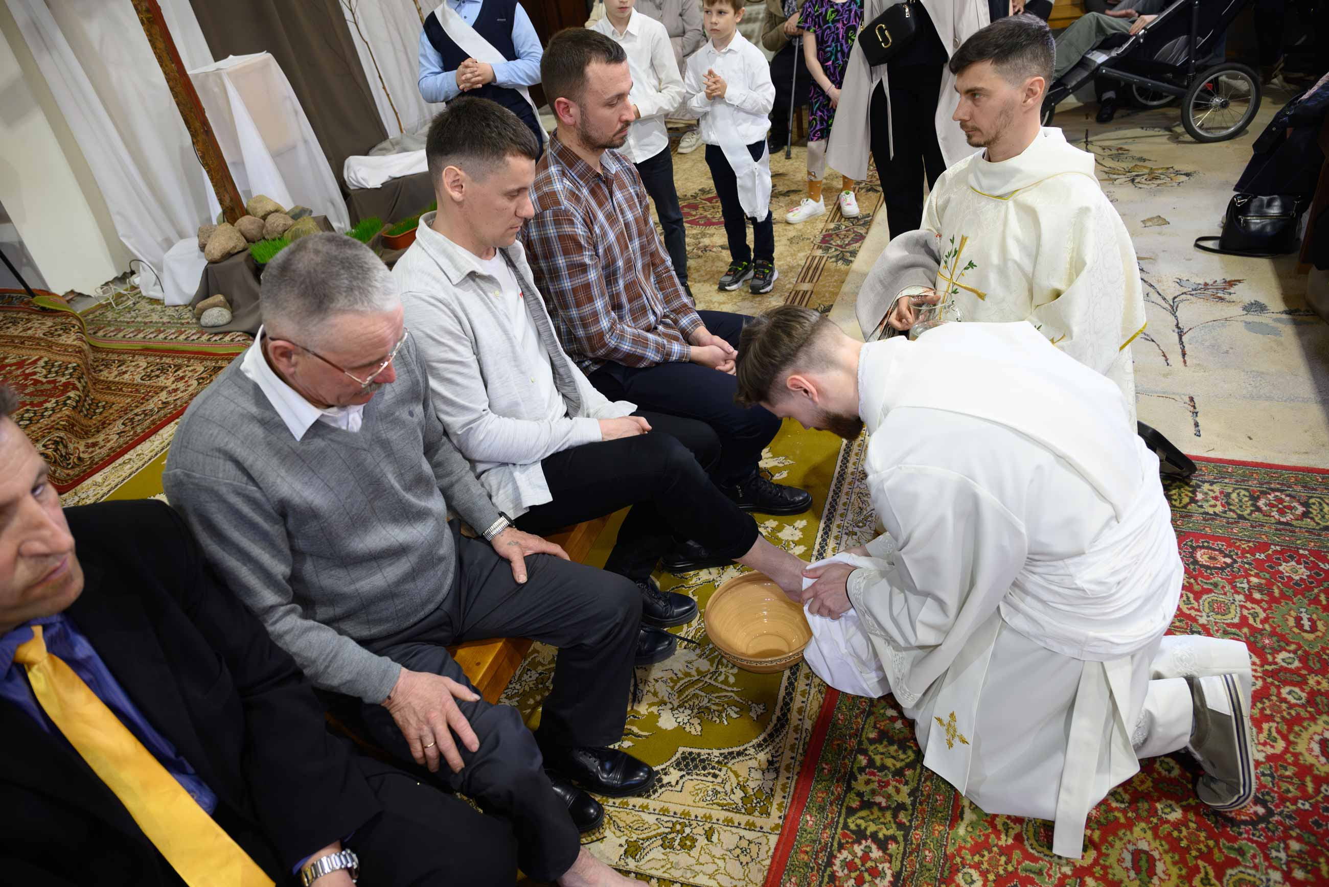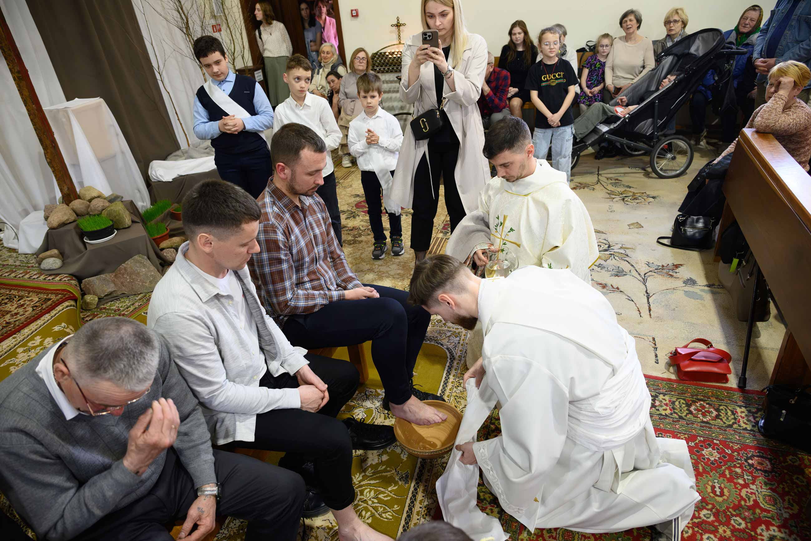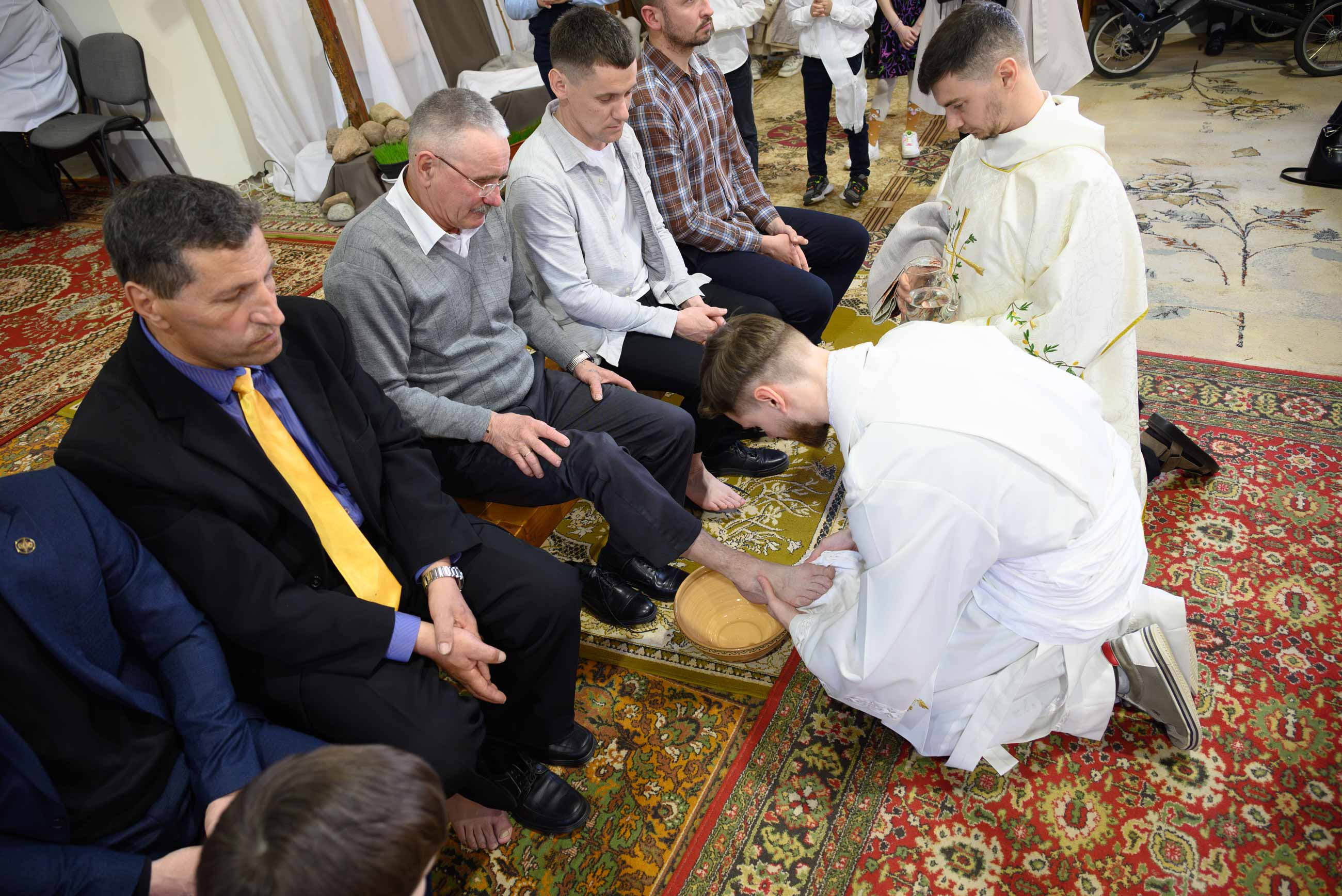 “Варта зразумець, - заахвоціў святар, - што падчас абмыцця ног, а таксама падчас Камуніі Езус прыніжаецца да кожнага з нас, каб прытуліць, каб увайсці ў нашае жыццё, каб кожны адчуў, што яму служыць сам Бог, адчуў сябе каштоўным у Яго вачах. Бог хоча паказаць, якая ёсць любоў Айца і Сына, і запрашае ў гэтую любоў кожнага з нас. Ён гэтага хоча. Не дазваляйма сваім слабасцям, комплексам, расчараванню адхіліць ад сябе гэтае жаданне Бога, нават калі здаецца, што гэта недапушчальна. Не трэба адкідаць… Важна прыняць сябе такім, які ёсць, і дазволіць сабе прыняць клопат іншага чалавека і клопат Бога. Нашыя слабасці і недасканаласці даюць нам магчымасць зразумець, што нас сапраўды любяць”.