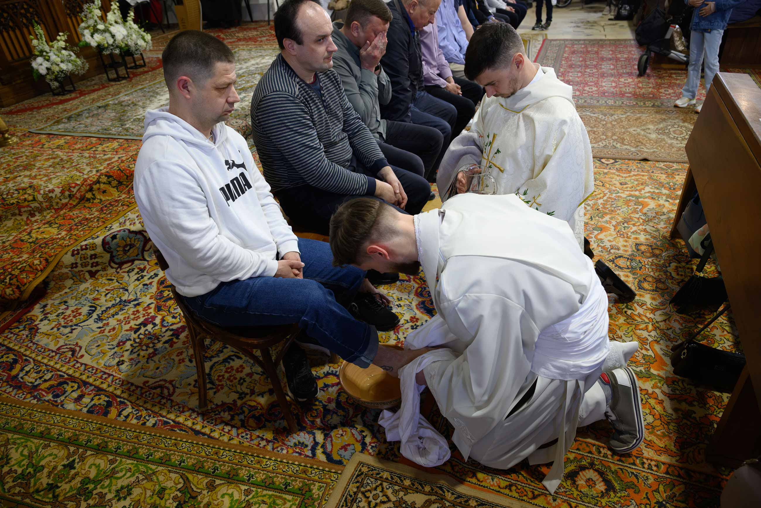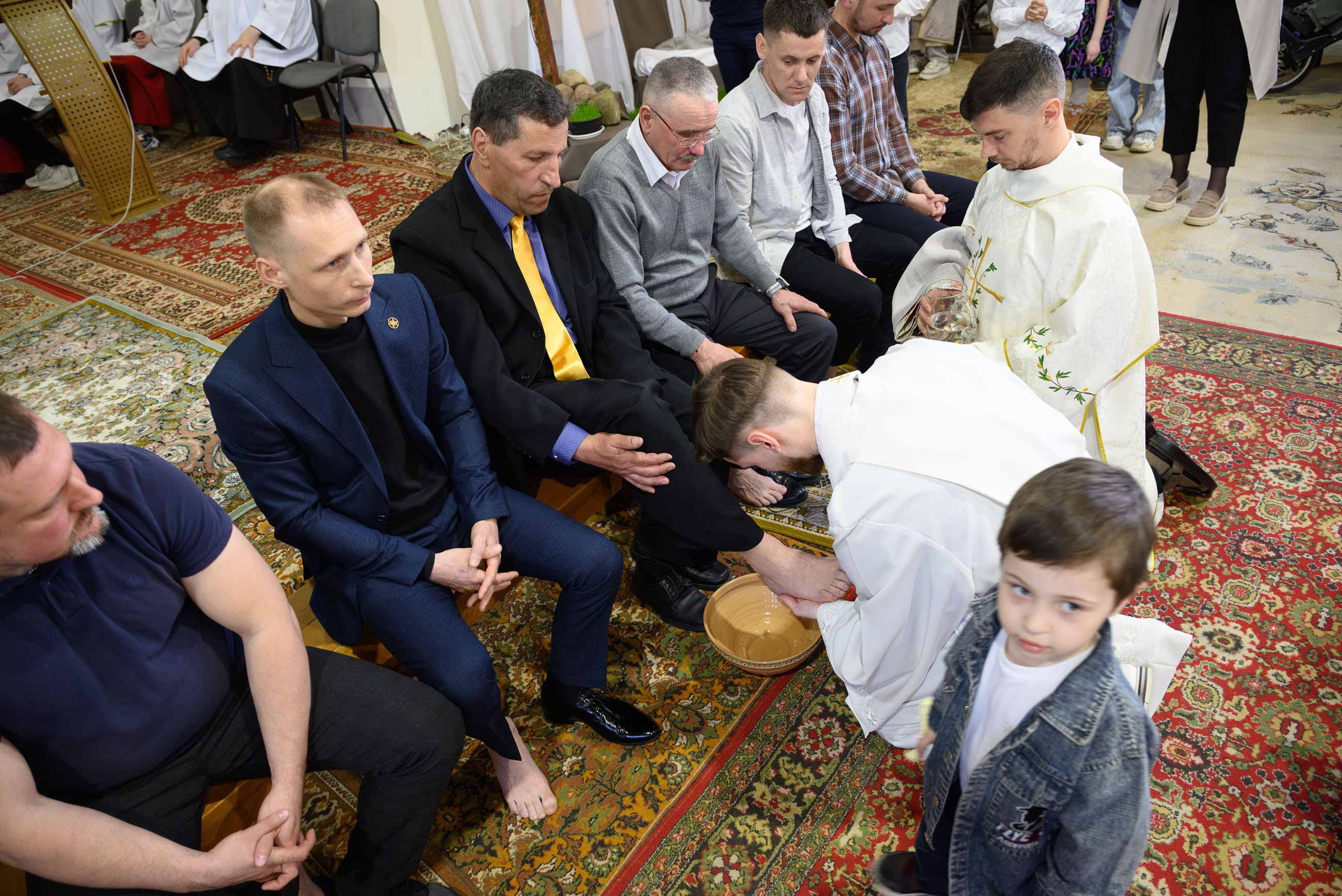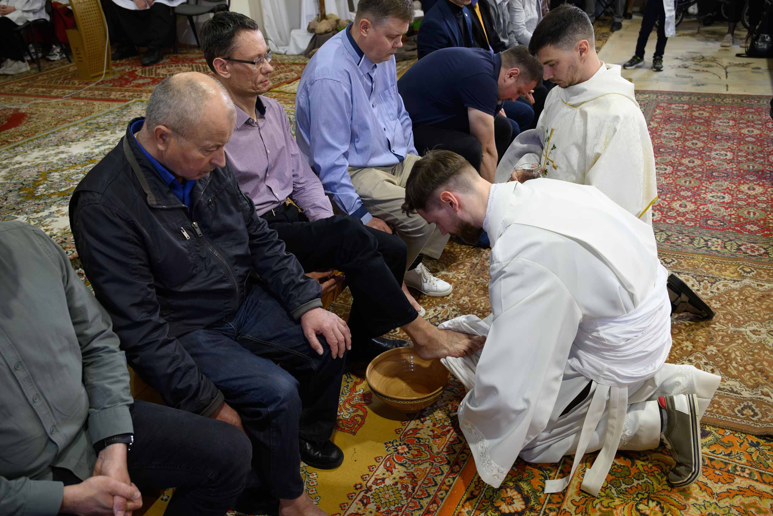 “Варта зразумець, - заахвоціў святар, - што падчас абмыцця ног, а таксама падчас Камуніі Езус прыніжаецца да кожнага з нас, каб прытуліць, каб увайсці ў нашае жыццё, каб кожны адчуў, што яму служыць сам Бог, адчуў сябе каштоўным у Яго вачах. Бог хоча паказаць, якая ёсць любоў Айца і Сына, і запрашае ў гэтую любоў кожнага з нас. Ён гэтага хоча. Не дазваляйма сваім слабасцям, комплексам, расчараванню адхіліць ад сябе гэтае жаданне Бога, нават калі здаецца, што гэта недапушчальна. Не трэба адкідаць… Важна прыняць сябе такім, які ёсць, і дазволіць сабе прыняць клопат іншага чалавека і клопат Бога. Нашыя слабасці і недасканаласці даюць нам магчымасць зразумець, што нас сапраўды любяць”.