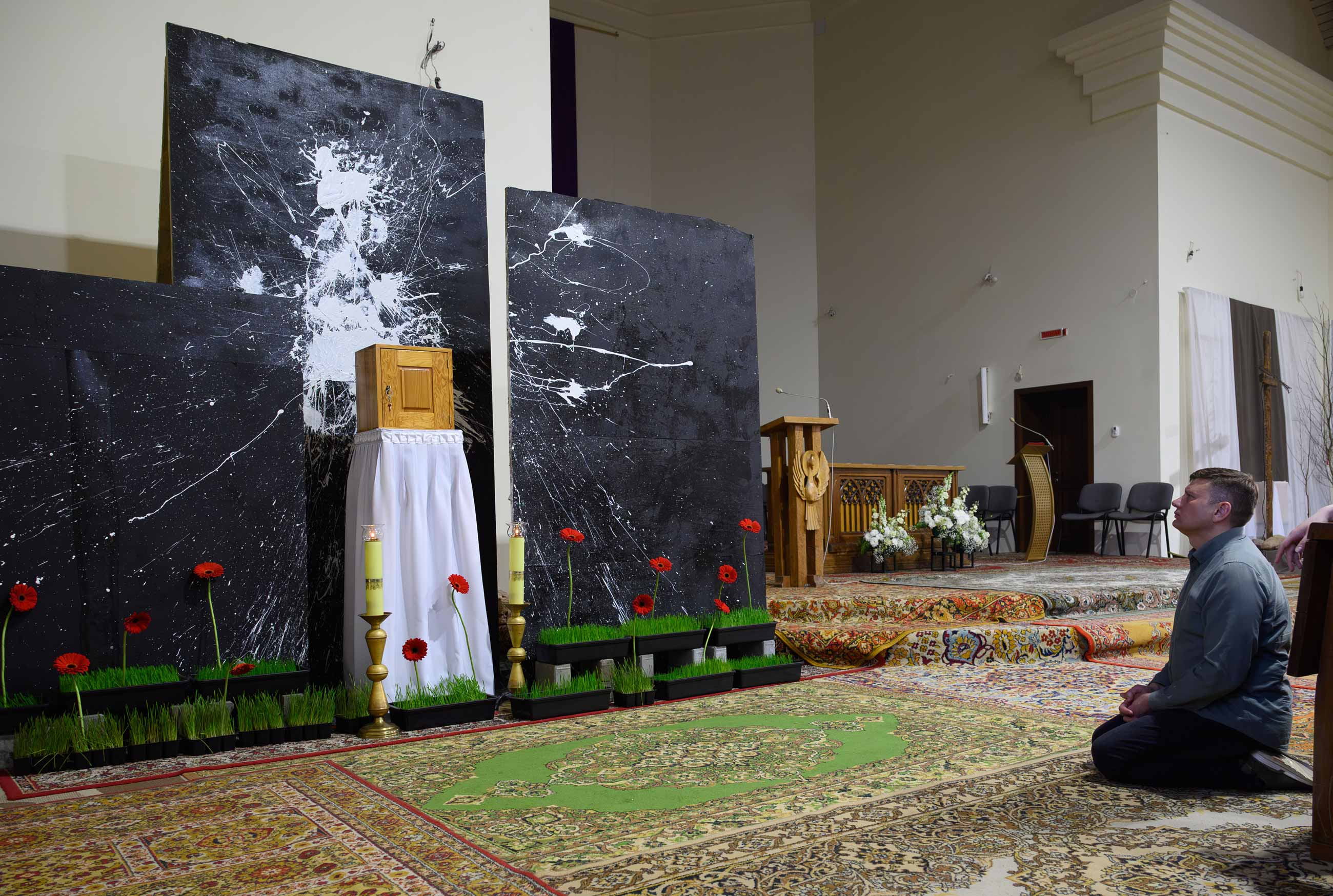 “Прабачэнне і спакой – гэта плён таго, што здзейсніў для нас Хрыстос сваёй Ахвярай, - падкрэсліў брат. - Таму мы з моладдзю вырашылі ў гэтым годзе зрабіць дэкарацыю для Гетсіманіі нетрадыцына. Смерць, грэх, бруд, дысгармонія, непрыгажосць – гэта тое, то робіць з намі грэх. Мы хацелі, каб углядаючыся ў гэты вір бясформенных плямаў, можна было зразумець, што гэта выраз майго і твайго грэху, які стаў прычынай цярпенняў Хрыста. Моц Збаўцы ў тым, што Ён уваходзіць у гэты вір са сваім прабачэннем і спакоем (Ён у табернаулюме – у цэнтры спакою), бярэ ўсё на сябе і ставіць на свае месцы”.
