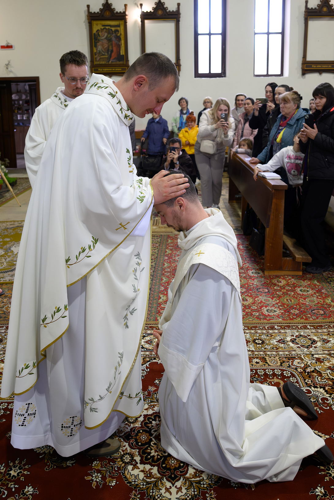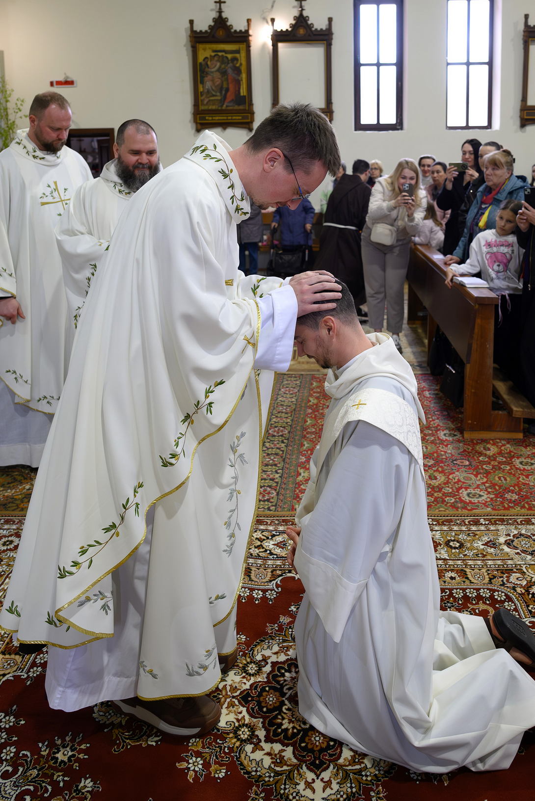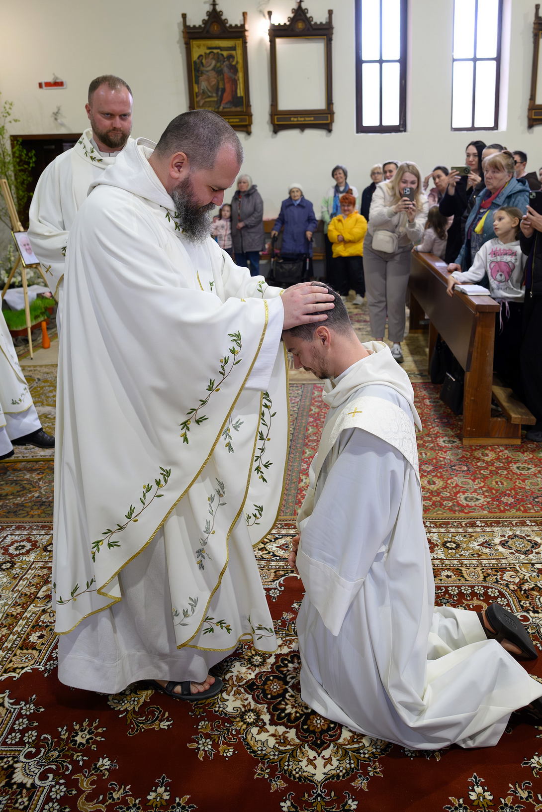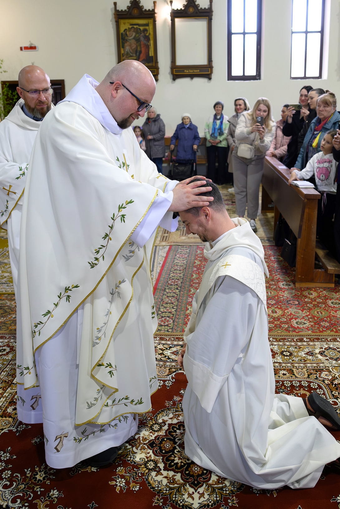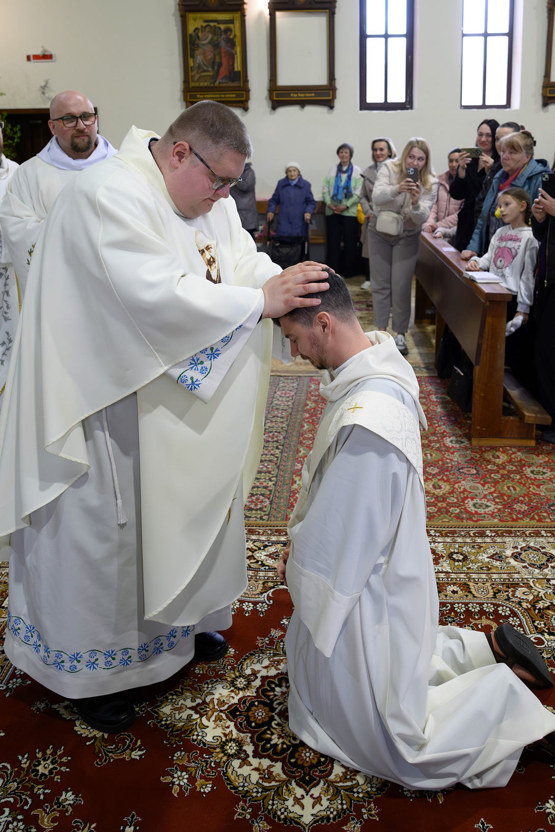 Затым адбыўся важны момант ускладання рук біскупам і ўсімі прысутнымі святарамі, далей прагучала кансэкрацыйная малітва, - і новы святар з дапамогай гвардыяна, брата Андрэя Жылевіча, апрануў арнат.