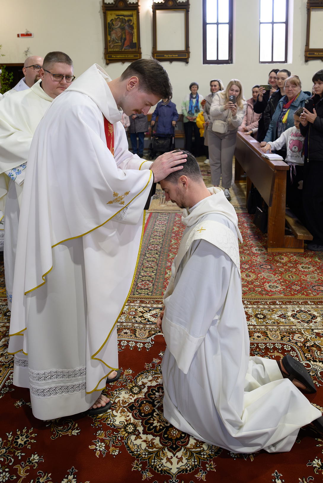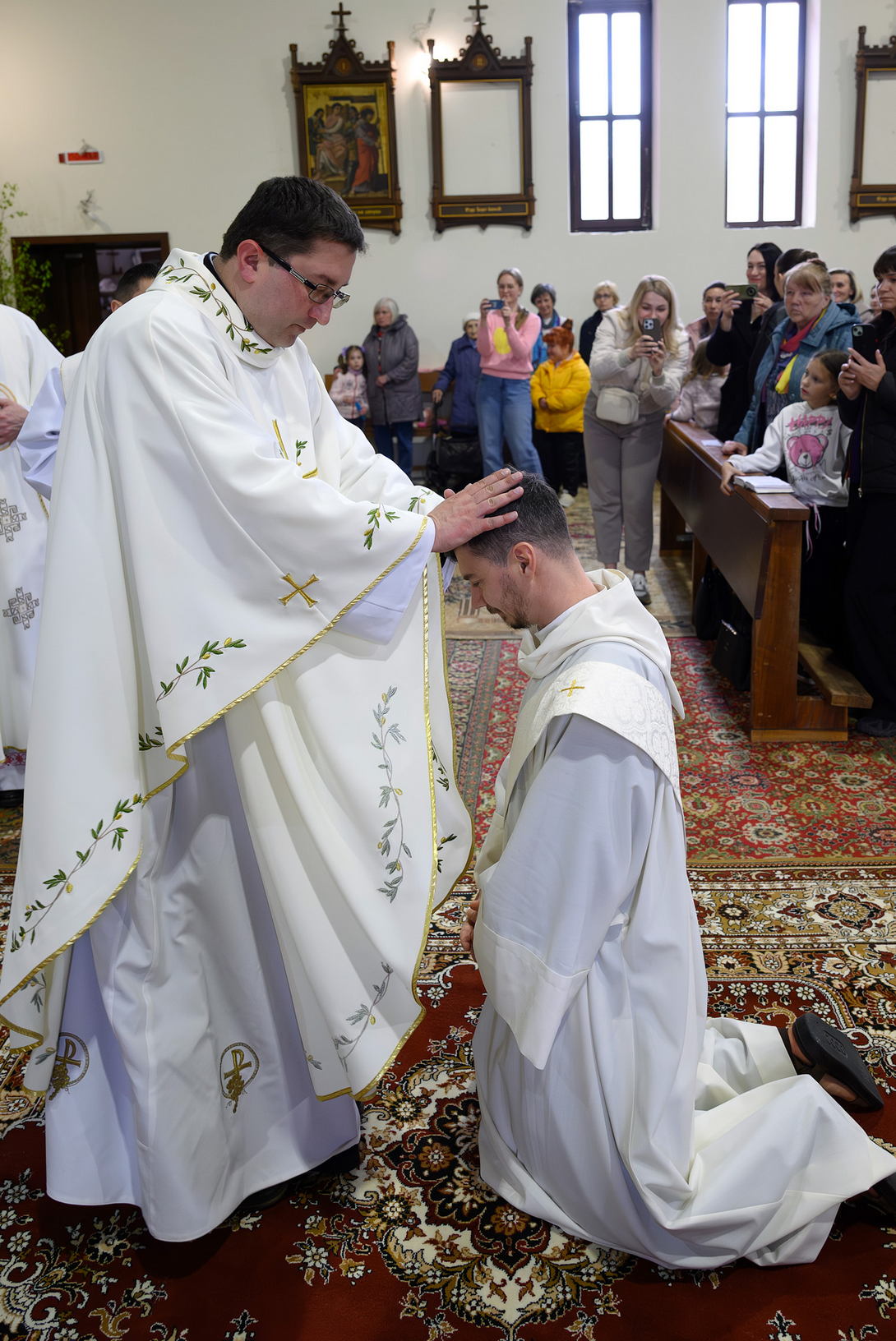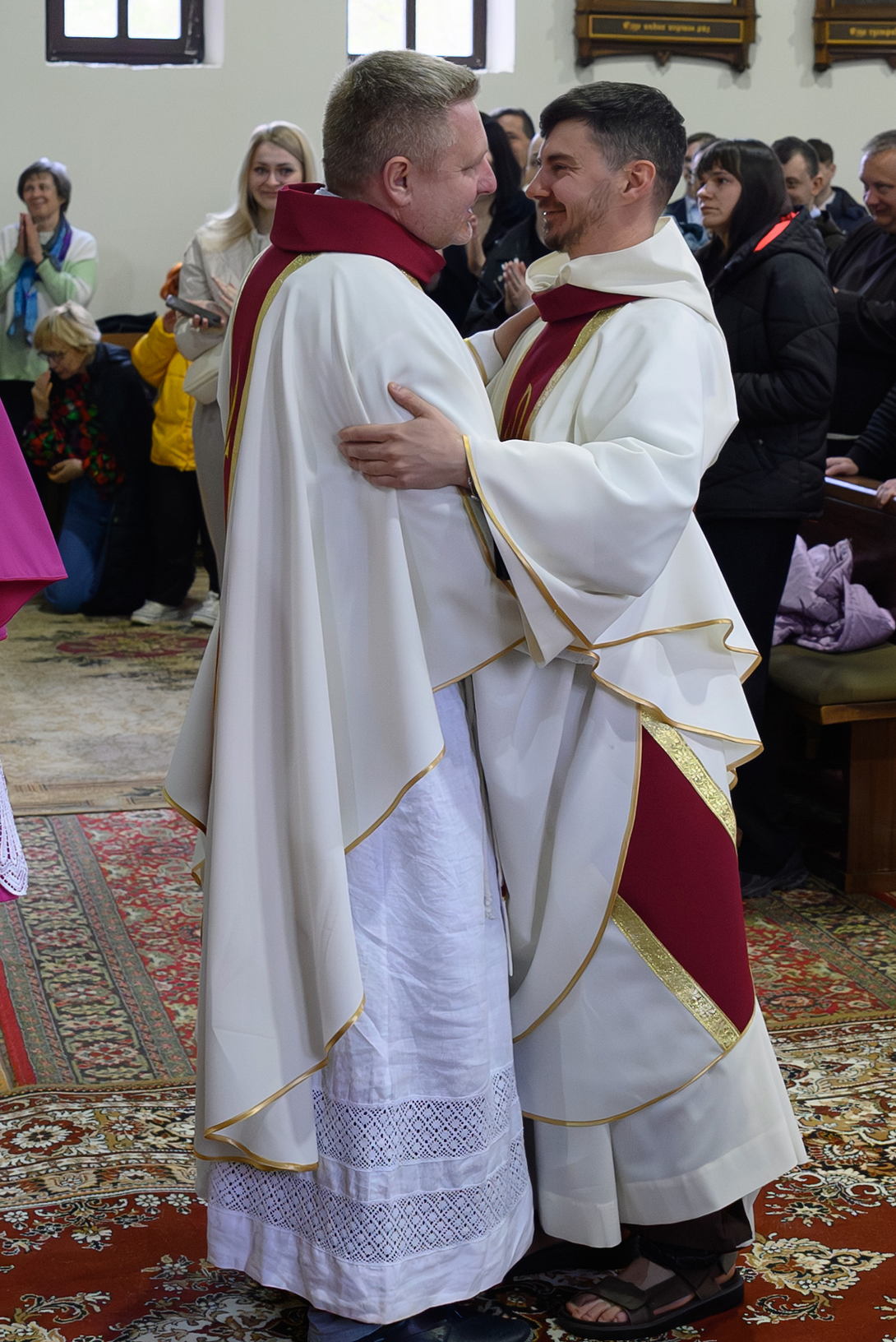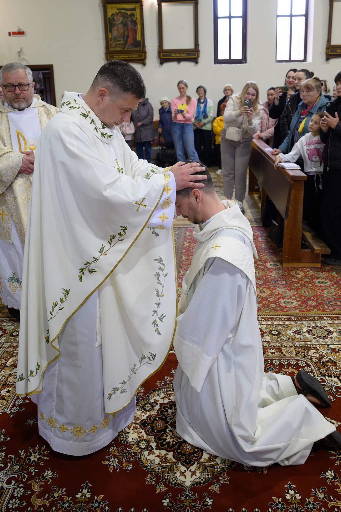 Затым адбыўся важны момант ускладання рук біскупам і ўсімі прысутнымі святарамі, далей прагучала кансэкрацыйная малітва, - і новы святар з дапамогай гвардыяна, брата Андрэя Жылевіча, апрануў арнат.