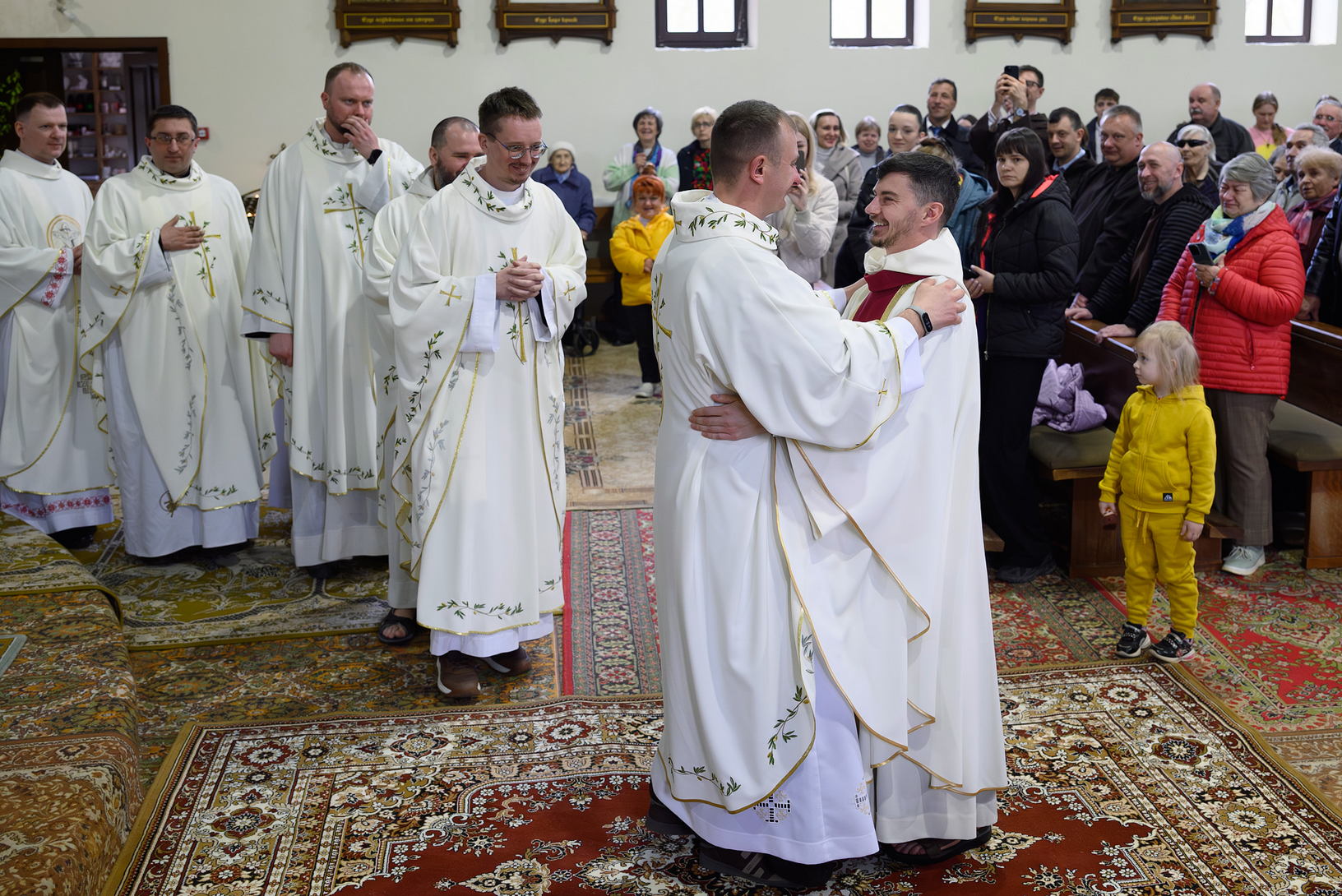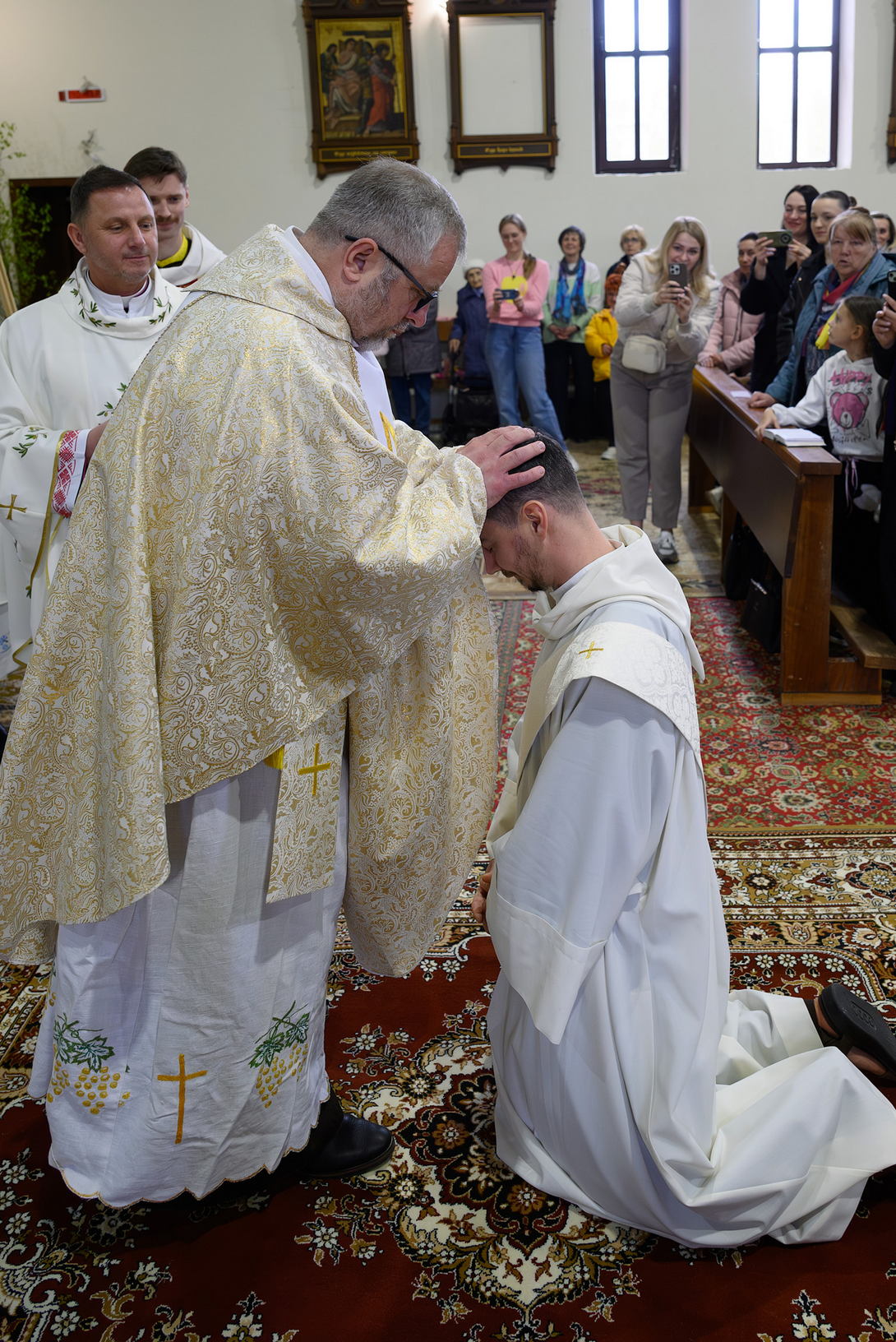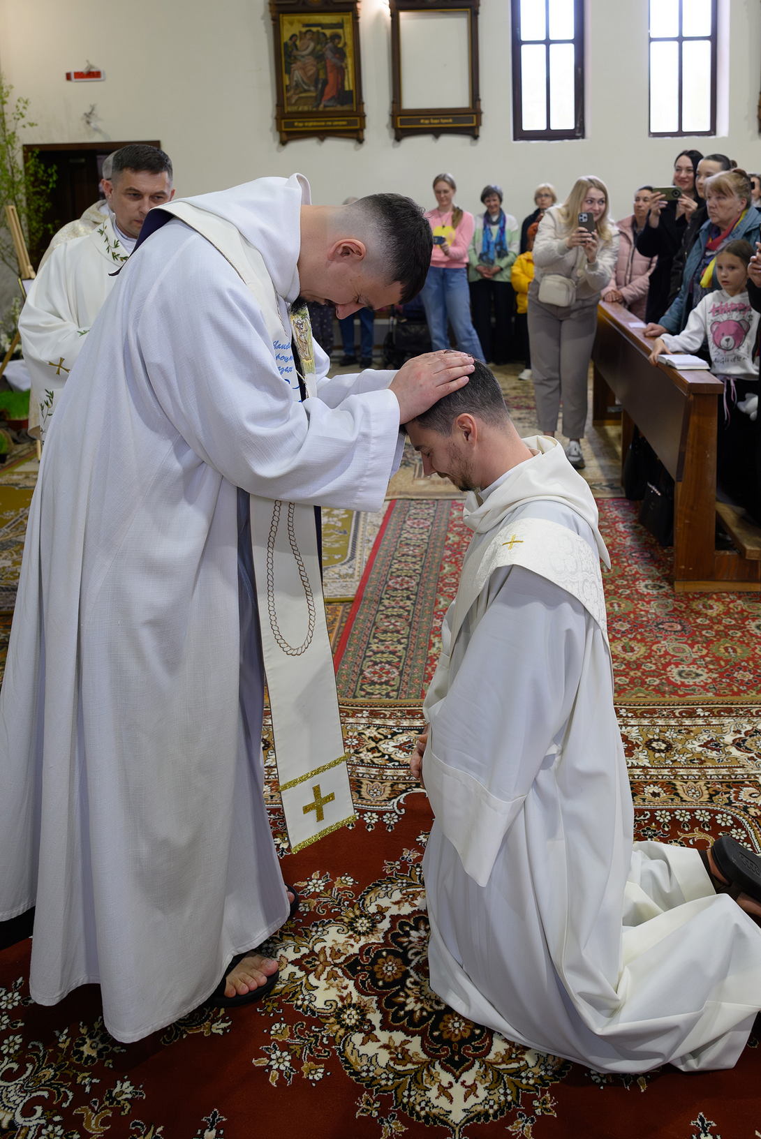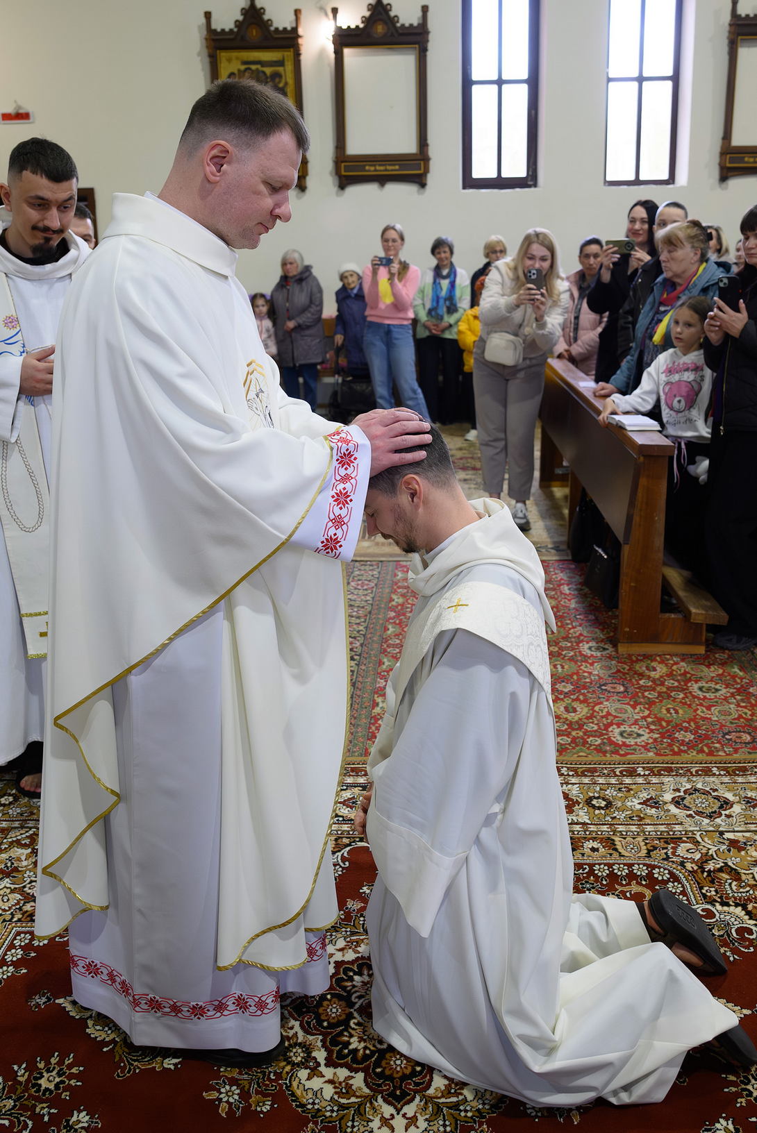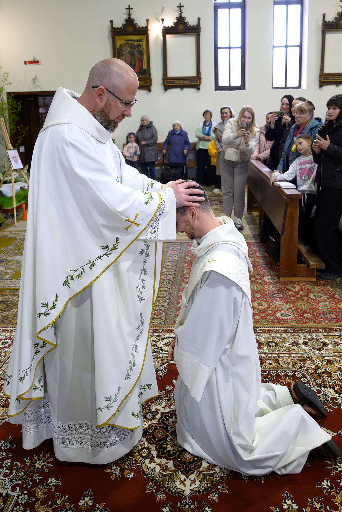 Затым адбыўся важны момант ускладання рук біскупам і ўсімі прысутнымі святарамі, далей прагучала кансэкрацыйная малітва, - і новы святар з дапамогай гвардыяна, брата Андрэя Жылевіча, апрануў арнат.
