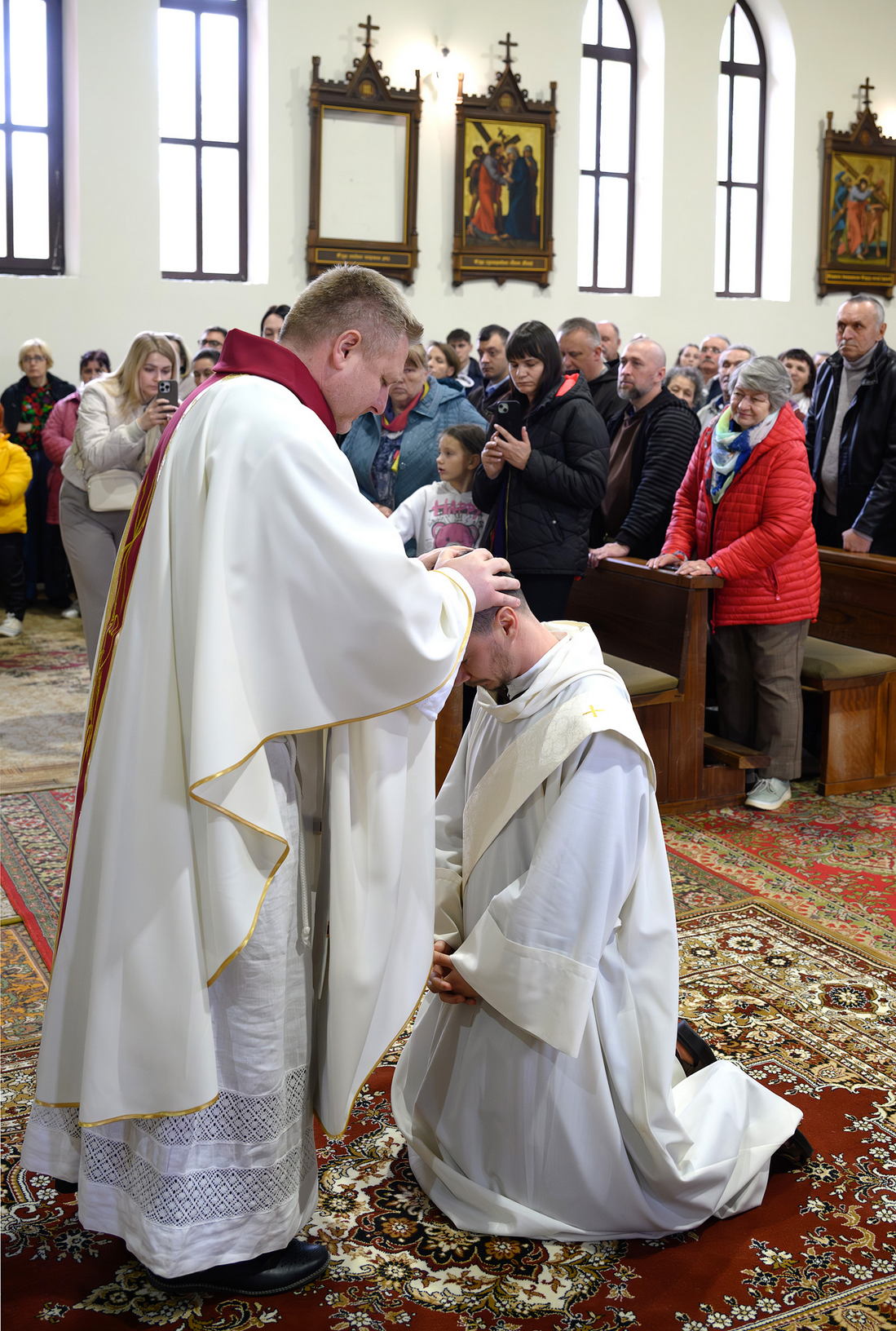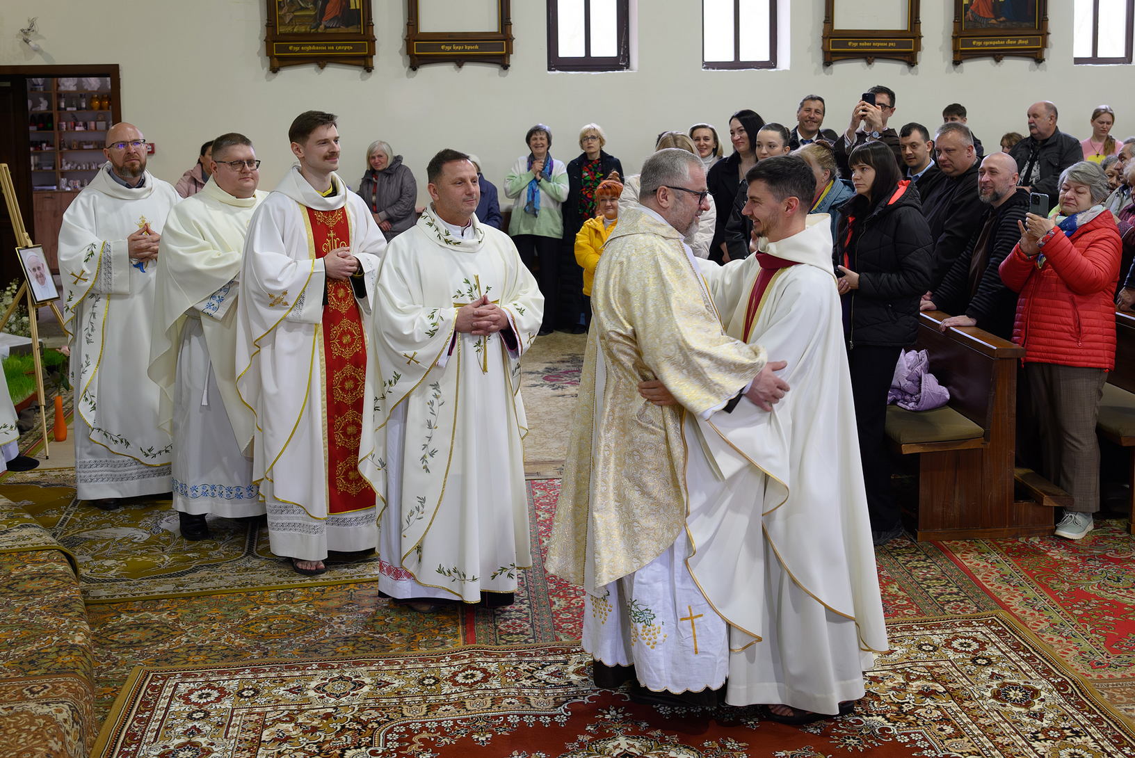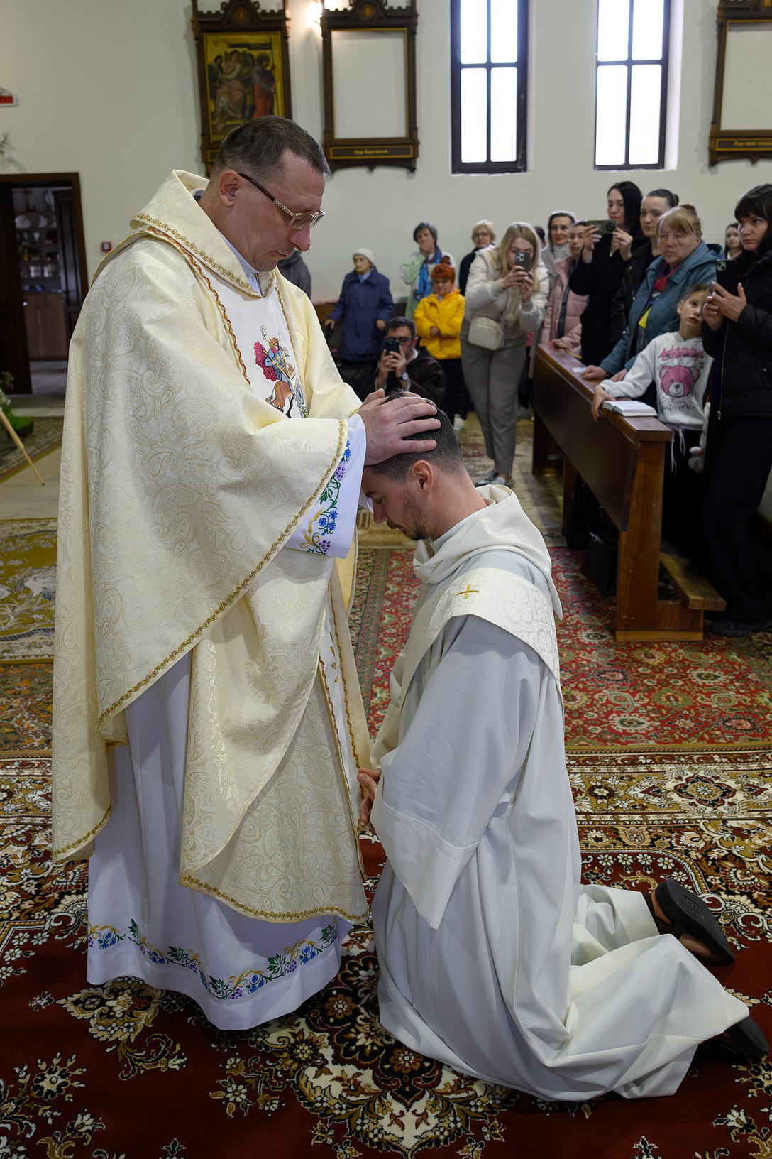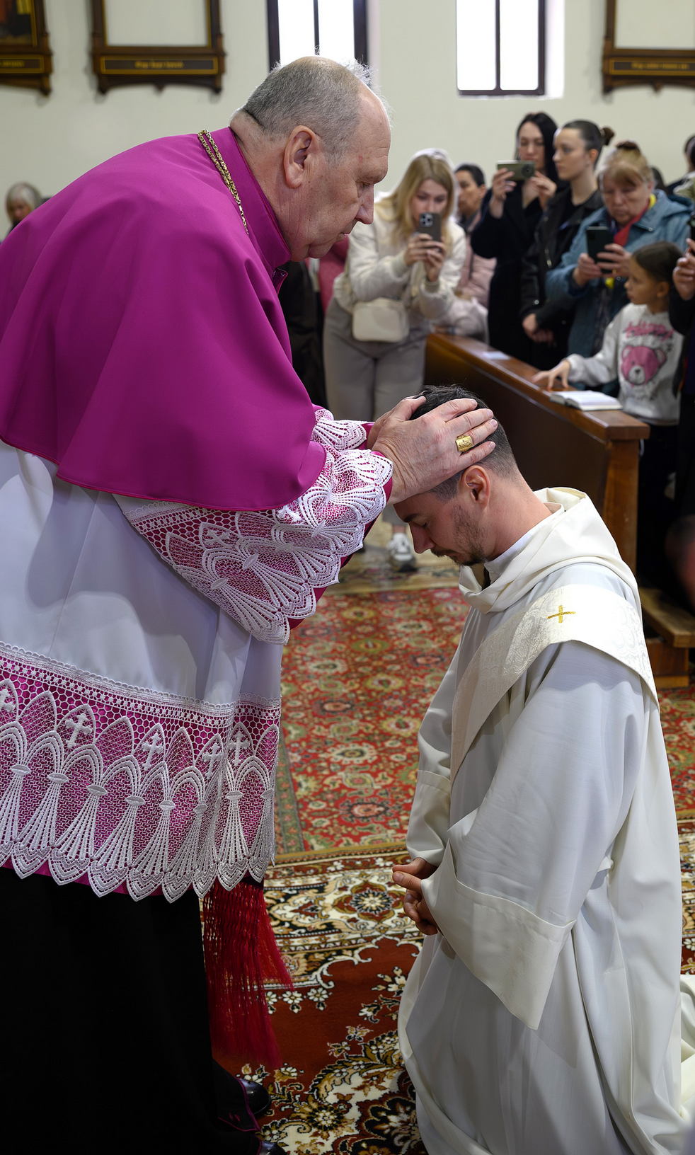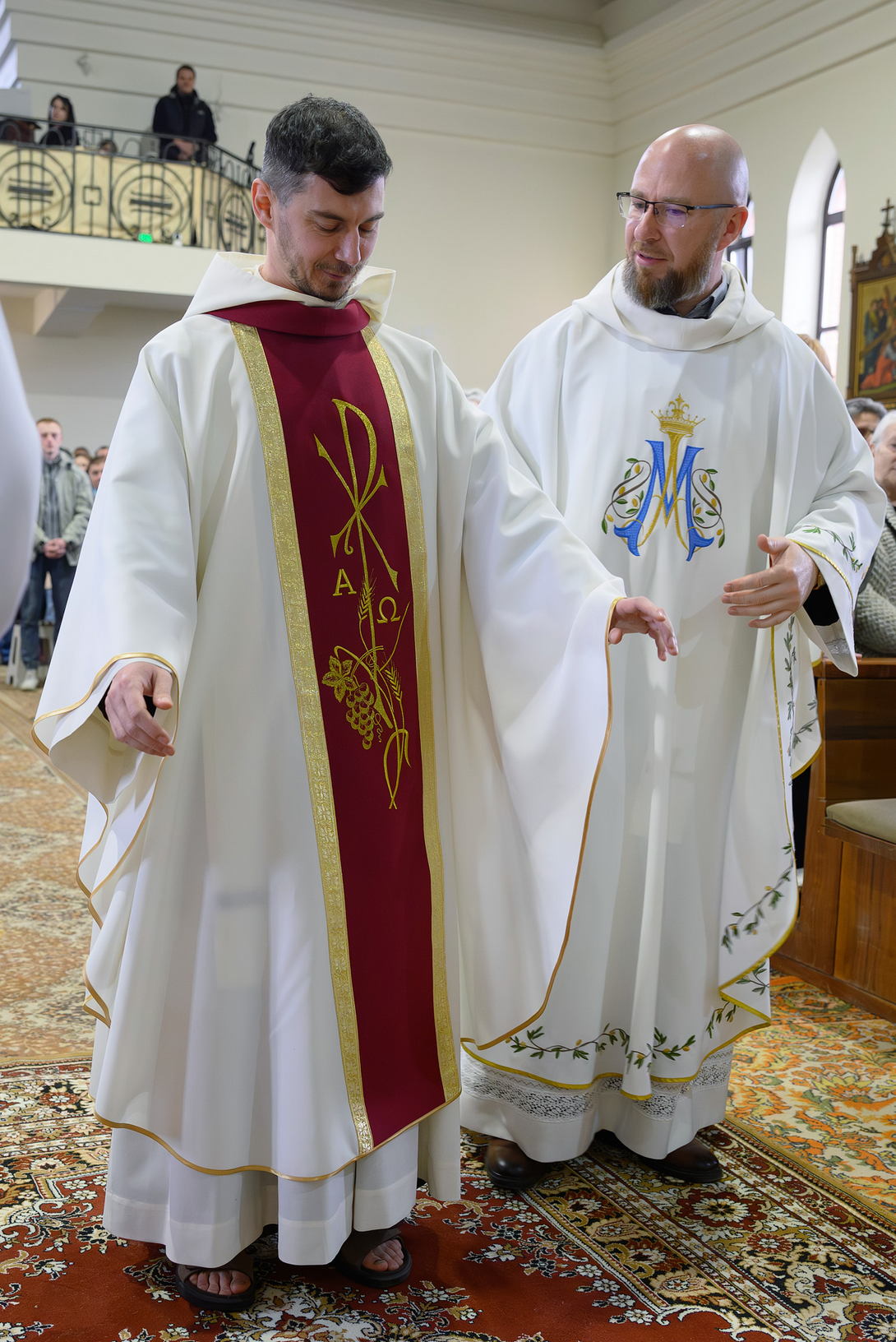 Затым адбыўся важны момант ускладання рук біскупам і ўсімі прысутнымі святарамі, далей прагучала кансэкрацыйная малітва, - і новы святар з дапамогай гвардыяна, брата Андрэя Жылевіча, апрануў арнат.
