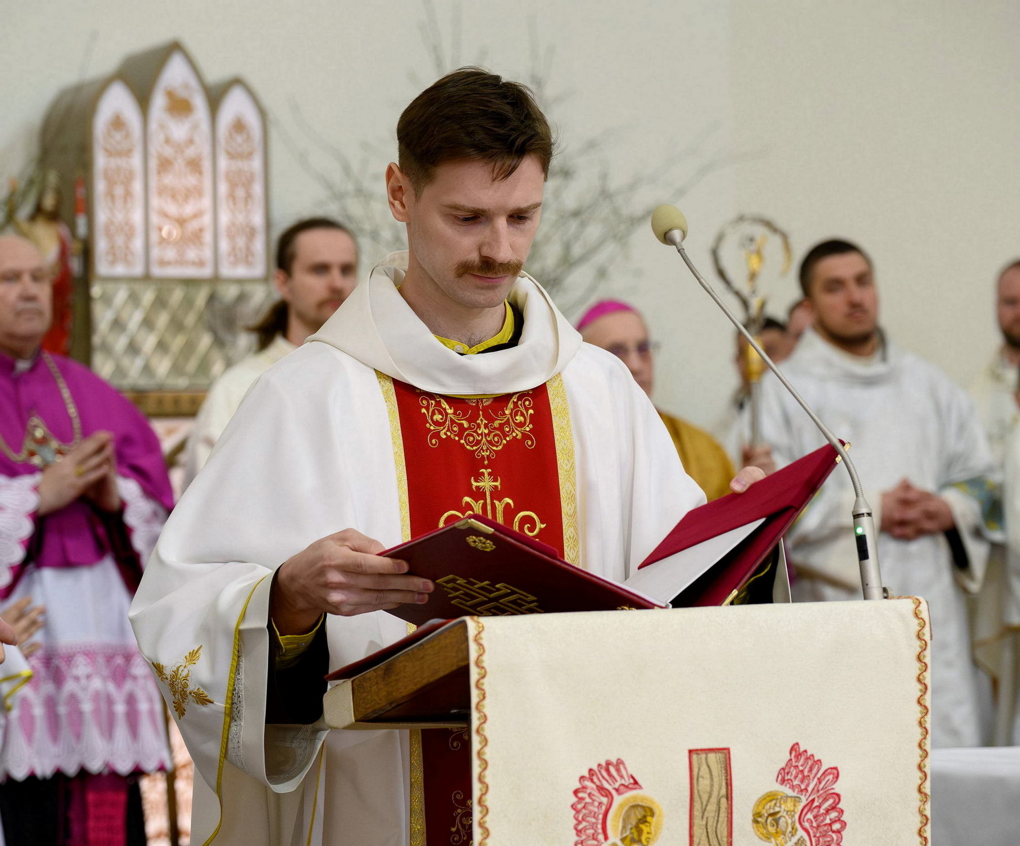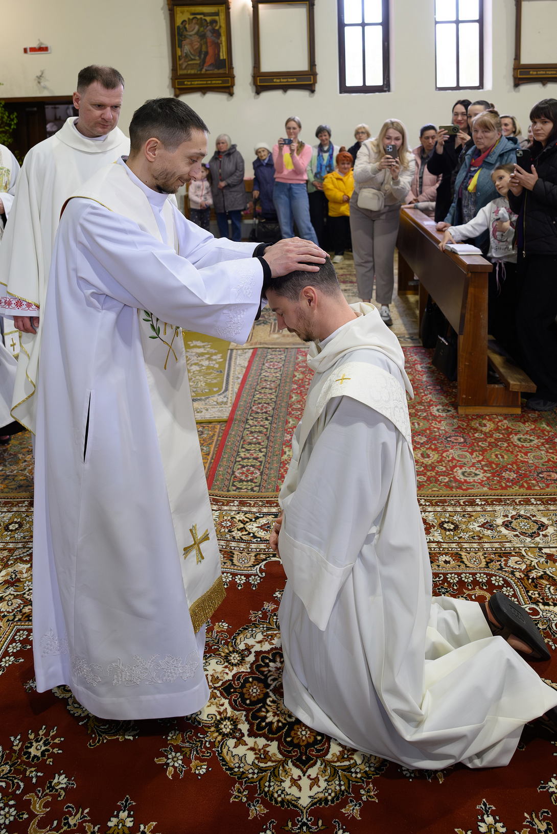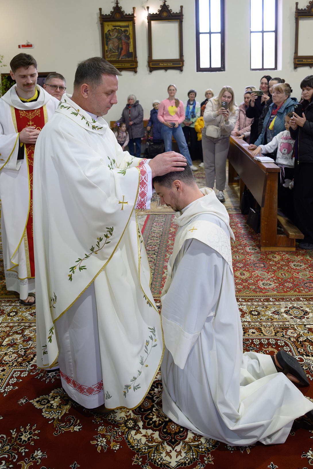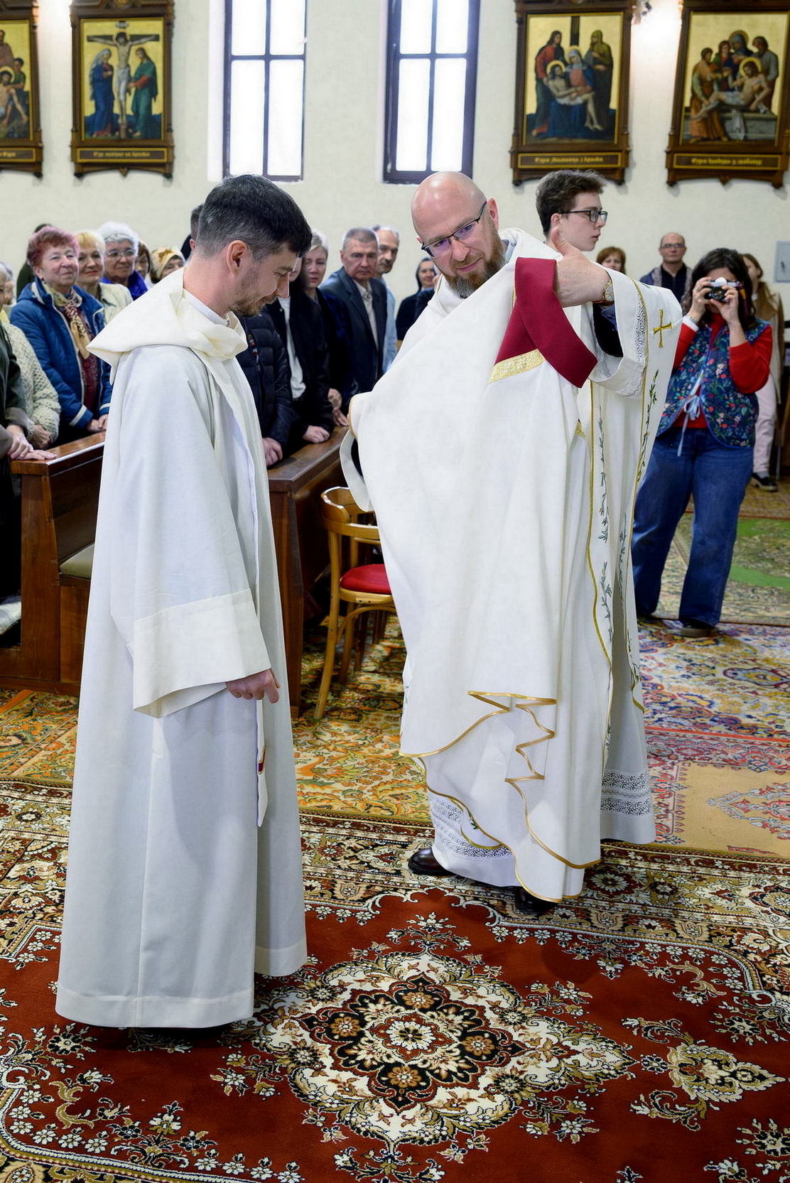 Затым адбыўся важны момант ускладання рук біскупам і ўсімі прысутнымі святарамі, далей прагучала кансэкрацыйная малітва, - і новы святар з дапамогай гвардыяна, брата Андрэя Жылевіча, апрануў арнат.