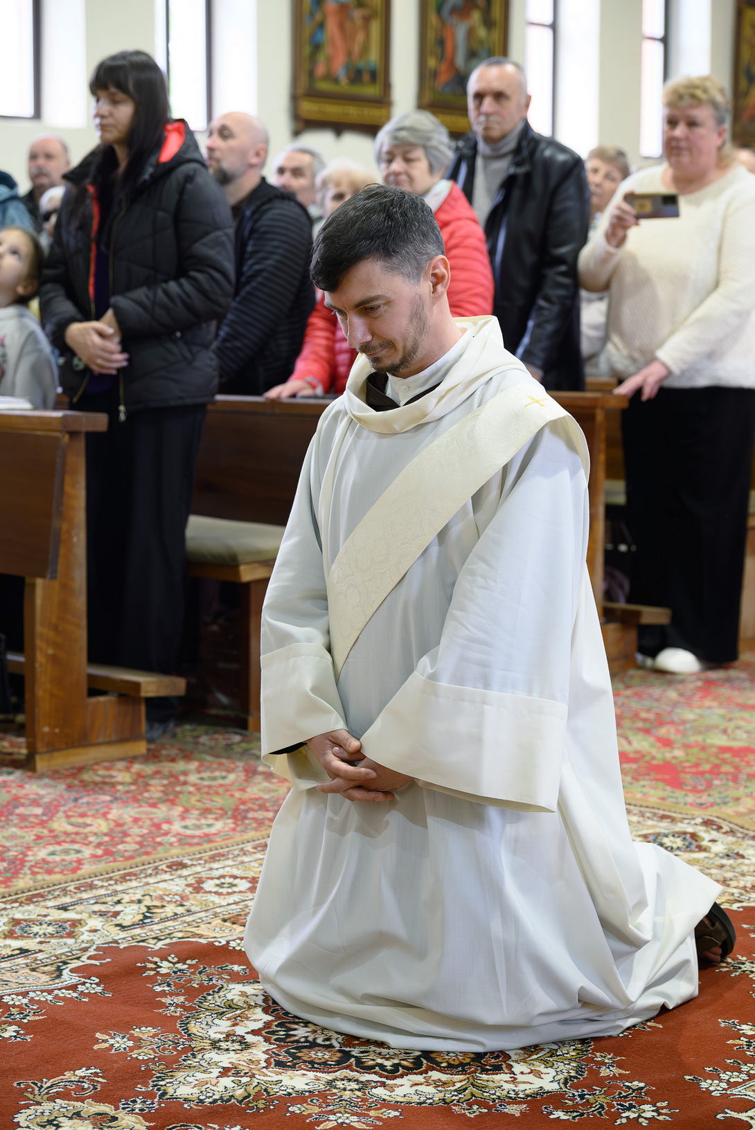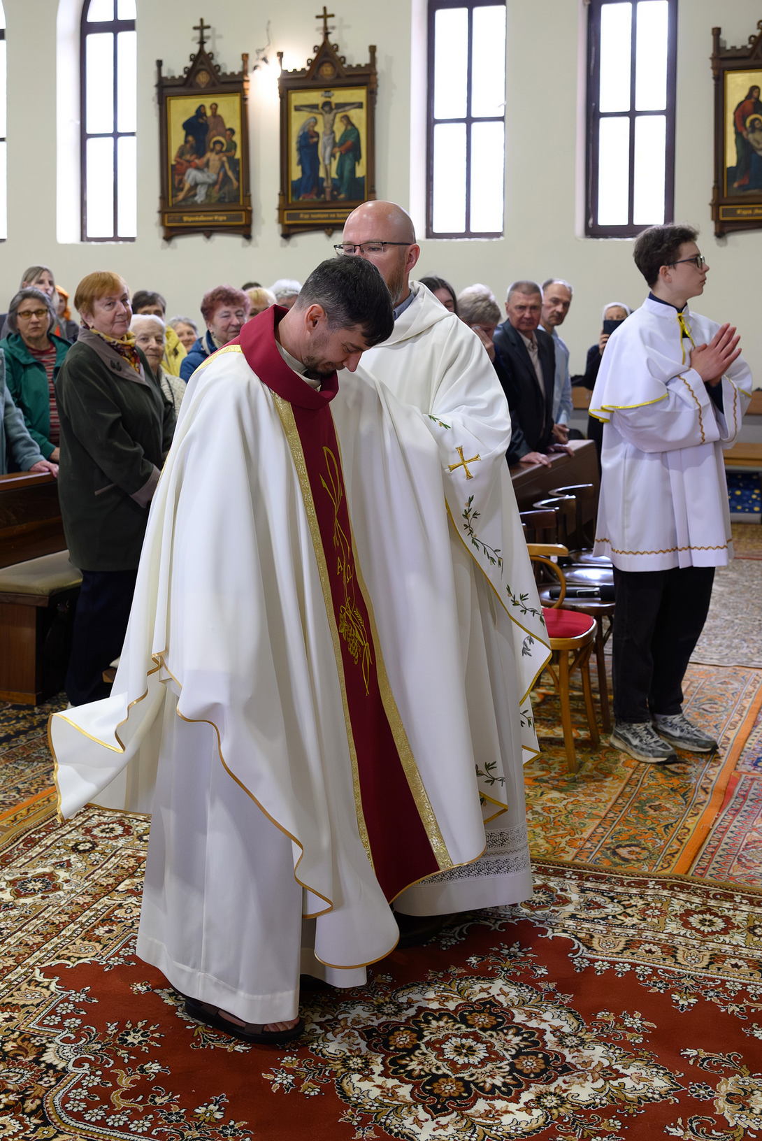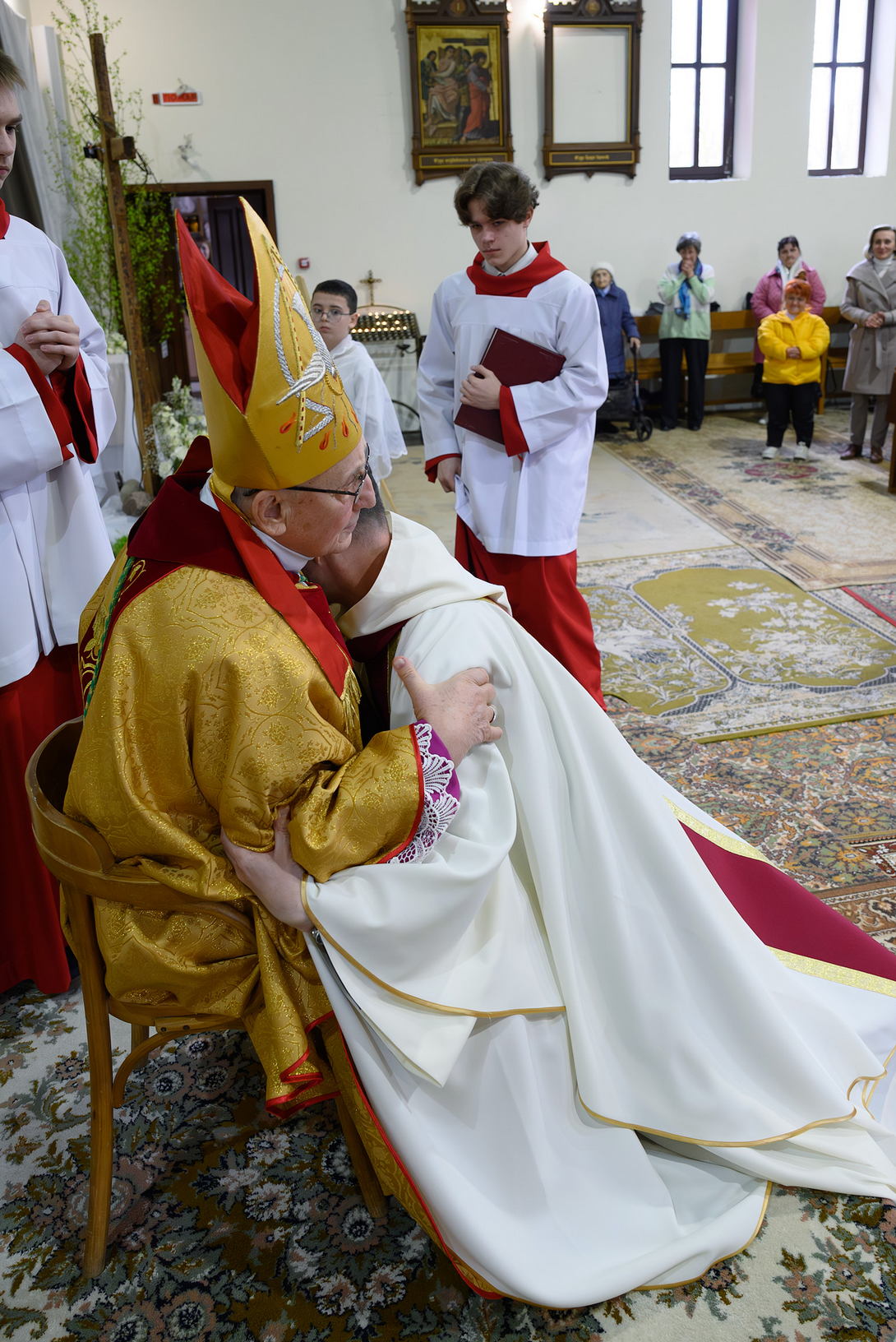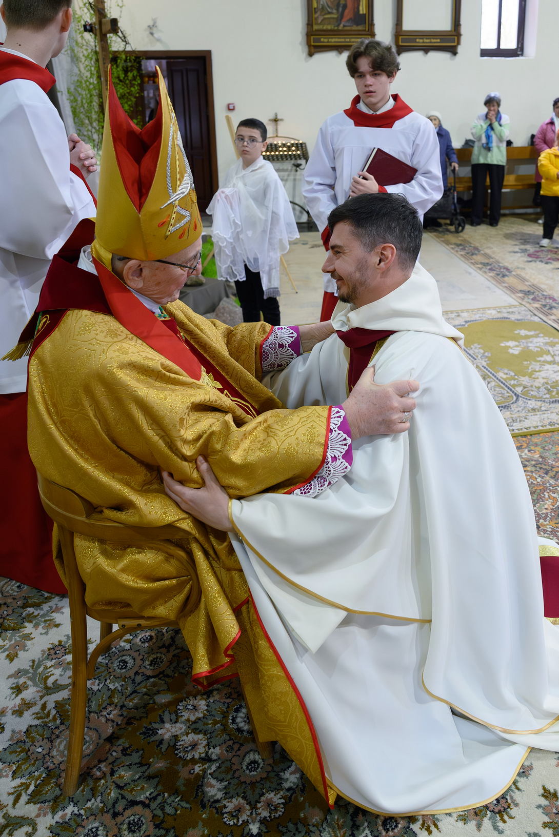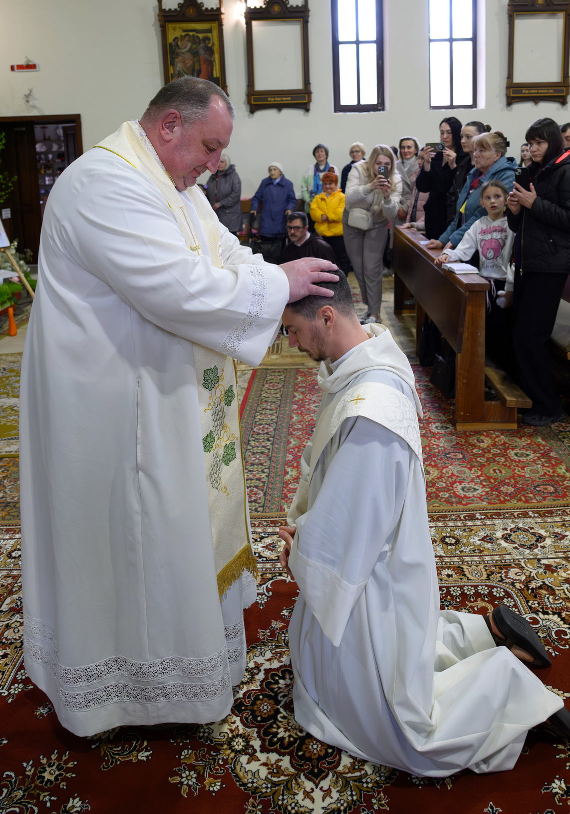 Затым адбыўся важны момант ускладання рук біскупам і ўсімі прысутнымі святарамі, далей прагучала кансэкрацыйная малітва, - і новы святар з дапамогай гвардыяна, брата Андрэя Жылевіча, апрануў арнат.