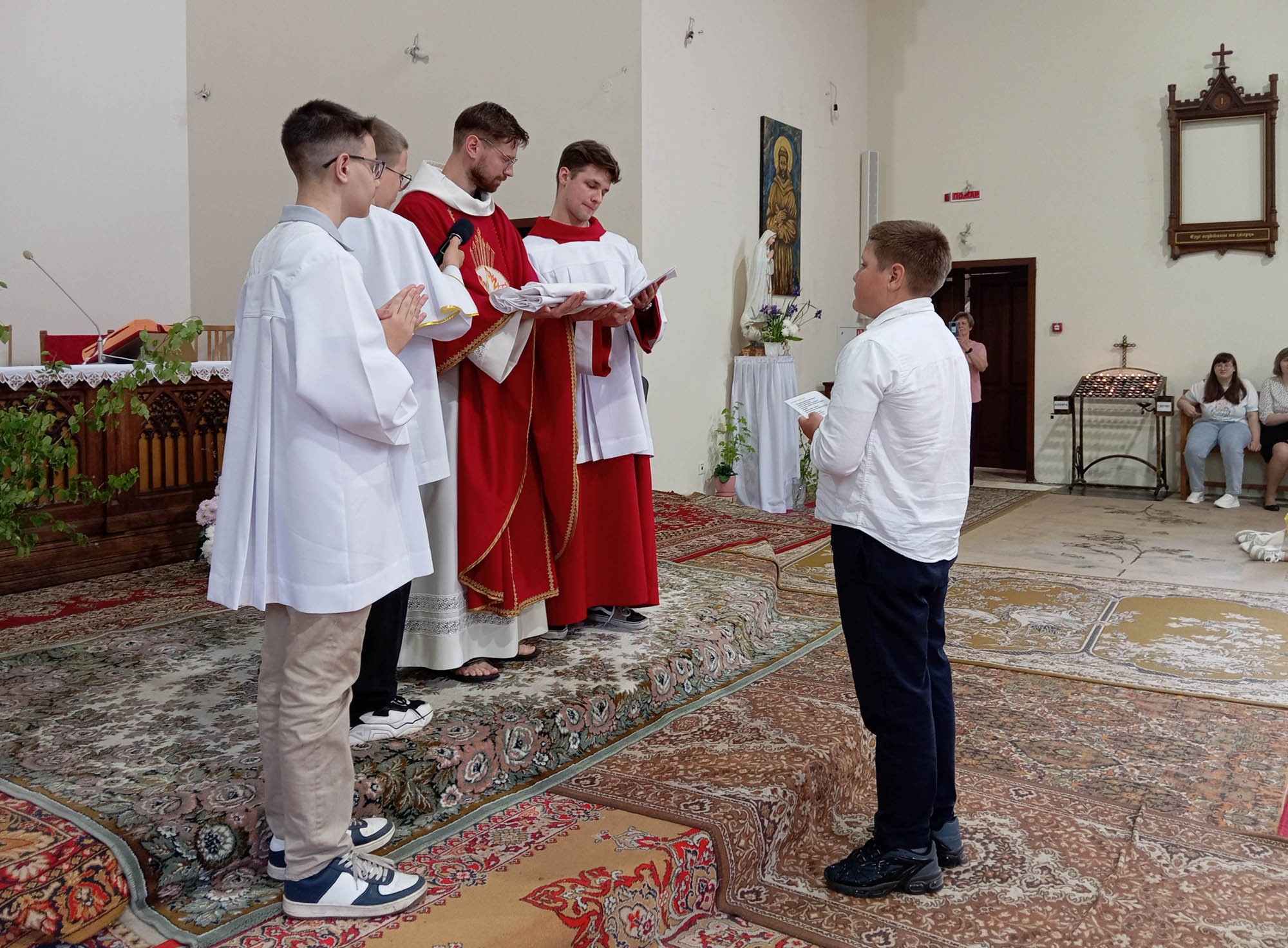 Пасля гаміліі адбылося ўрачыстае прыняцце Паўла ў міністранты. Перад алтаром ён склаў сваё абяцанне сумленна выконваць абавязкі міністранта хараліста, пасля чаго атрымаў комжу. Яе белы колер - знак чыстага сэрца. "Жадаю табе ўбачыць у тваім пакліканні, што Бог табе давярае", - сказаў пробашч.