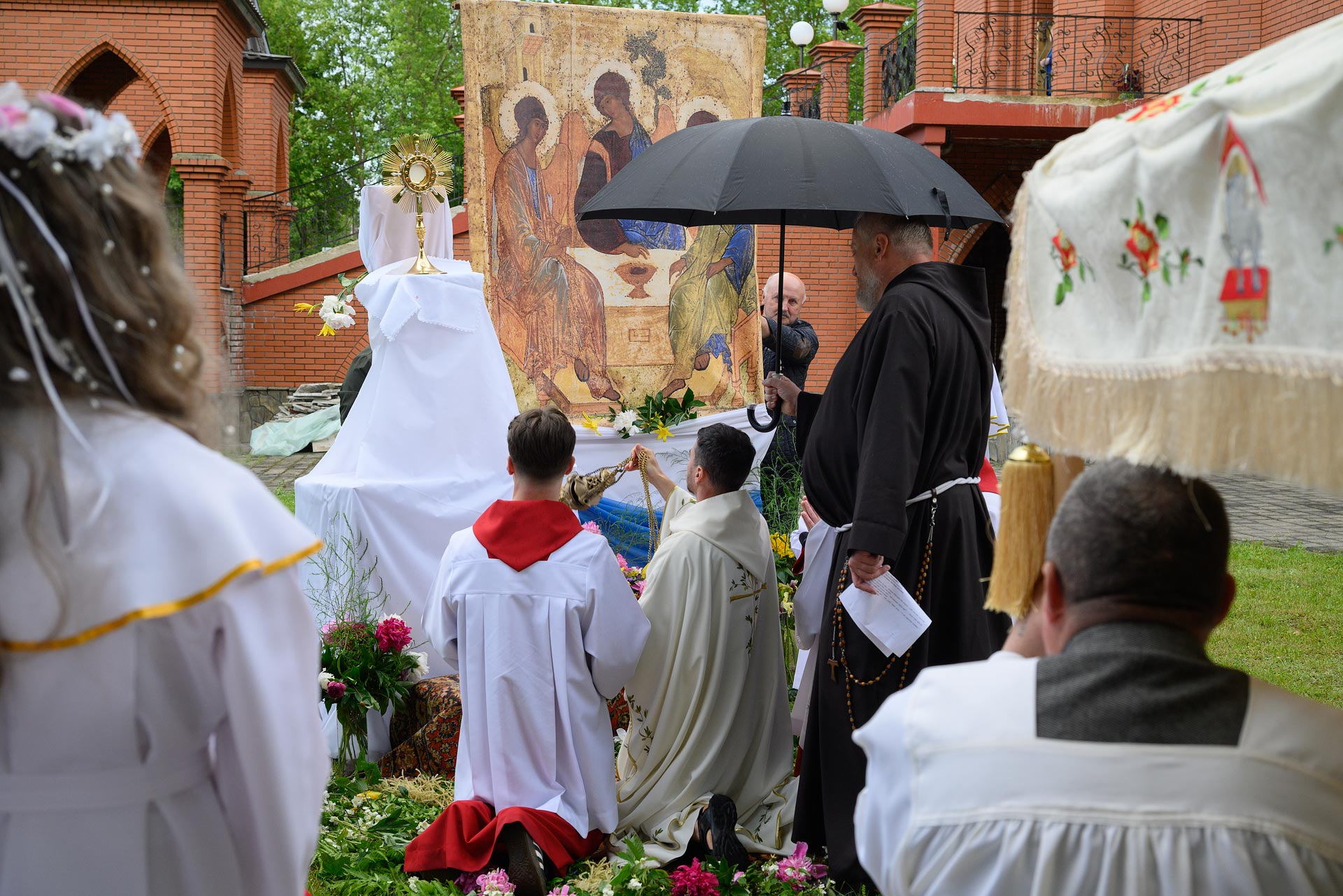 У гаміліі бр. Сяргей распавёў пра гісторыю свята, якое мае свае карані ў 13 ст. У той час існавалі шматлікія ерэтычныя рухі. Некаторыя з іх не прызнавалі, што на алтары падчас св. Імшы, калі святар прамаўляе словы "Вось цела Маё...", "Вось кроў Мая...", нябачным чынам адбываецца перамяненне хлеба і віна ў сапраўдныя Цела і Кроў Хрыста. Таму, каб падкрэсліць істотнасць гэтай праўды веры для ўсіх вернікаў, на IV Латэранскім Саборы ў 1215 г. яна была прынята як дагмат веры. Дарэчы, гэта быў час жыцця і дзейнасці св. Францішка, і на гэтым Саборы францішканскі манаскі ордэн, які існаваў яшчэ толькі 6 гадоў, афіцыйна быў зацверджаны папам Інакенціям ІІІ як сродак змагання з ерэсямі.