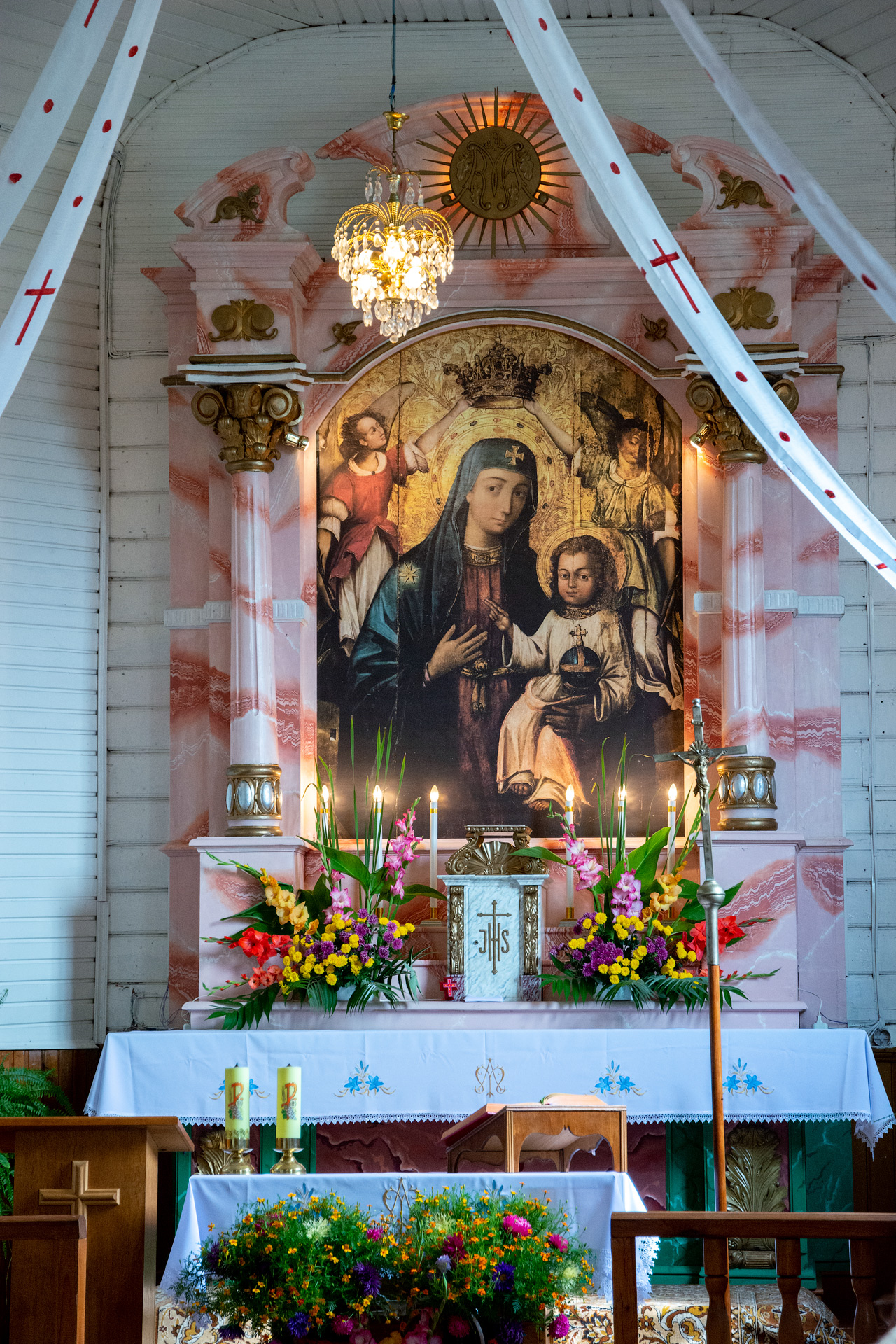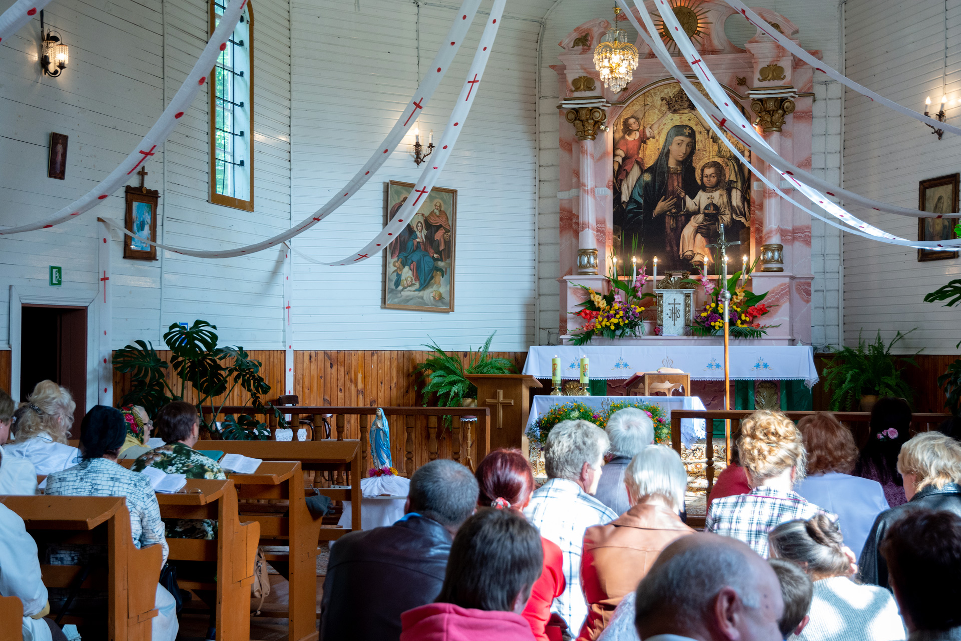 На галоўным алтары ўсталяваная копія абраза Маці Божай з Дзіцем. Са слоў мясцовых жыхароў, абраз гэты вельмі каштоўны і яго арыгінал не дазволілі захоўваць ва ўмовах вясковага касцёла, маўляў няма належных умоў для яго зберажэння.
